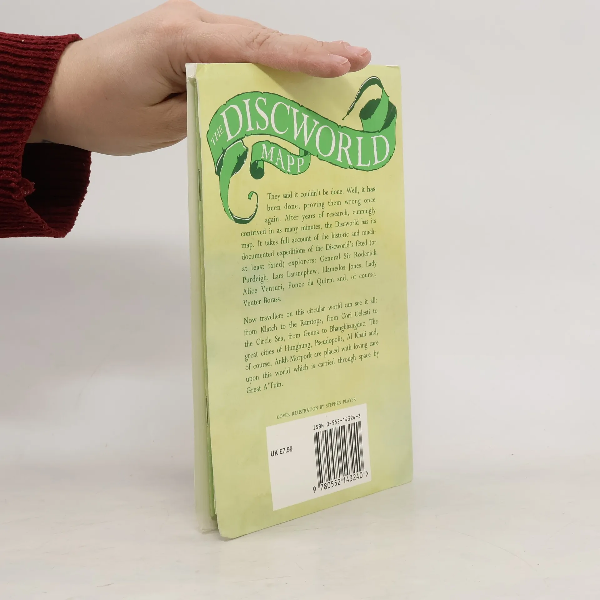 They said it couldn't be done. Well, it has been done, proving them wrong once again. After years of research, cunningly contrived in as many minutes, the Discworld has its map. It takes full account of the historic and much documented expeditions of the Discworld's fêted (or at least fated) explorers: General Sir Roderick Purdeigh, Lars Larsnephew, Llamedos Jones, Lady Alice Venturi, Ponce da Quirm and, of course, Venter Borass. Now travellers on this circular world can see it all: from Klatch to the Ramtops, from Cori Celesti to the Circle Sea, from Genua to Bhangbhangduc. The great cities of Hunghung, Pseudopolis, Al Khali and, of course, Ankh-Morpork are placed with loving care upon this world which is carried through space by Great A'Tuin.