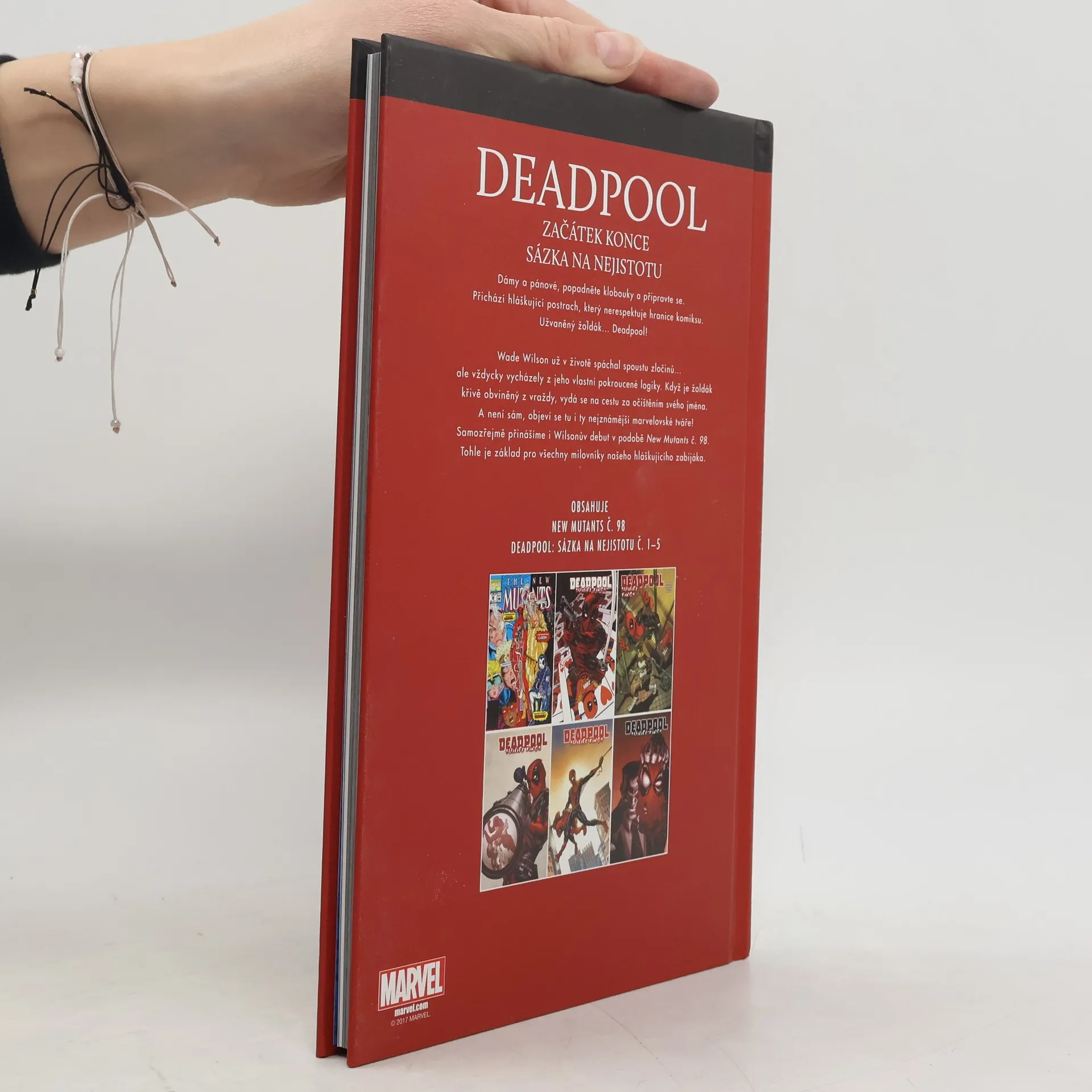 Dámy a pánové, popadněte klobouky a připravte se. Přichází hláškující postrach, který nerespektuje hranice komiksu. Užvaněný žoldák... Deadpool! Wade Wilson už v životě spáchal spoustu zločinů... ale vždycky vycházely z jeho vlastní pokroucené logiky. Když je žoldák křivě obviněný z vraždy, vydá se na cestu za očištěním svého jména. A není sám, objeví se tu i ty nejznámější marvelovské tváře! Samozřejmě přinášíme i Wilsonův debut v podobě New Mutants č. 98. Tohle je základ pro všechny milovníky našeho hláškujícího zabijáka. Obsahuje: Začátek konce: Část první Deadpool: Sázka na nejistotu