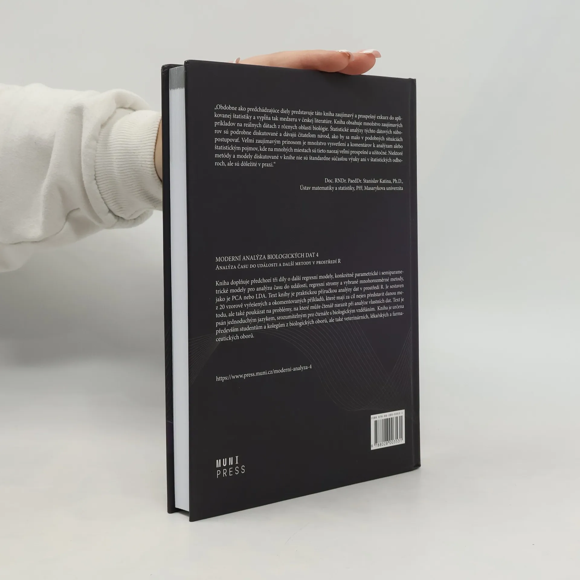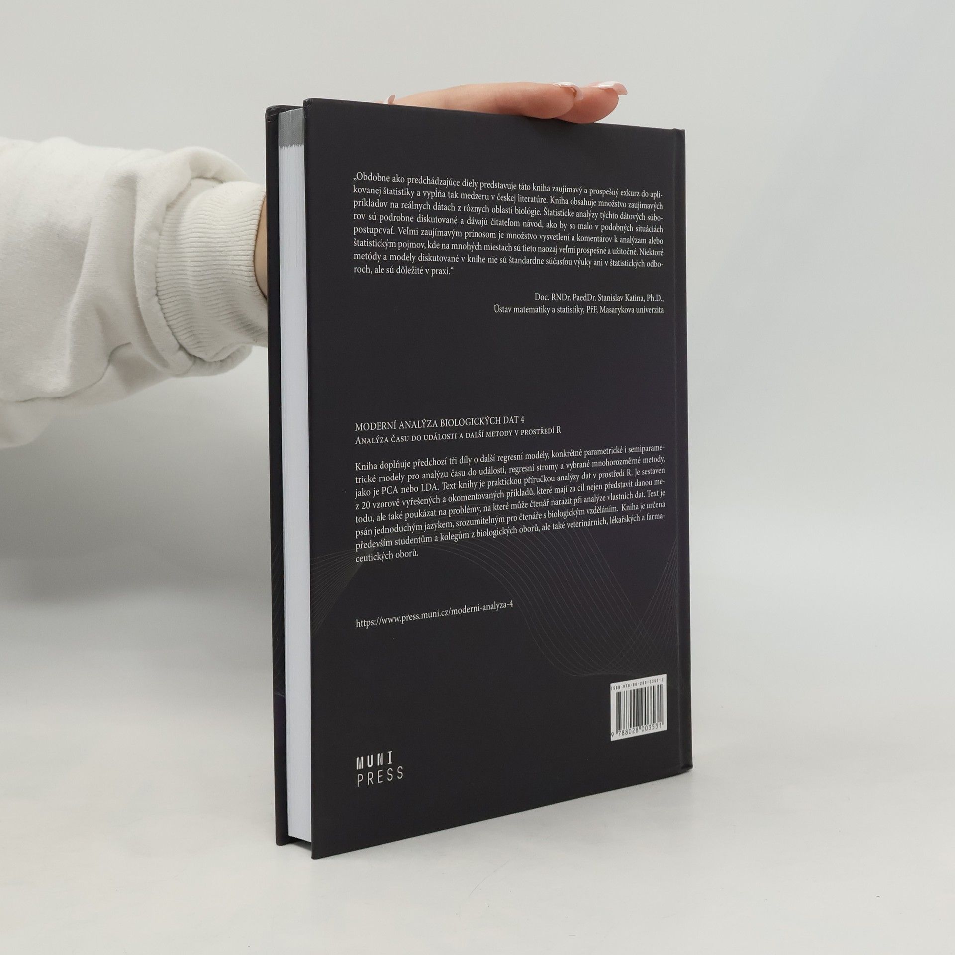 Kniha doplňuje předchozí tři díly o další regresní modely, konkrétně parametrické i semiparametrické modely pro analýzu času do události, regresní stromy a vybrané mnohorozměrné metody, jako je PCA nebo LDA. Text knihy je praktickou příručkou analýzy dat v prostředí R. Je sestaven z 20 vzorově vyřešených a okomentovaných příkladů, které mají za cíl nejen představit danou metodu, ale také poukázat na problémy, na které může čtenář narazit při analýze vlastních dat. Text je psán jednoduchým jazykem, srozumitelným pro čtenáře s biologickým vzděláním. Kniha je určena především studentům a kolegům z biologických oborů, ale také veterinárních, lékařských a farmaceutických oborů.
