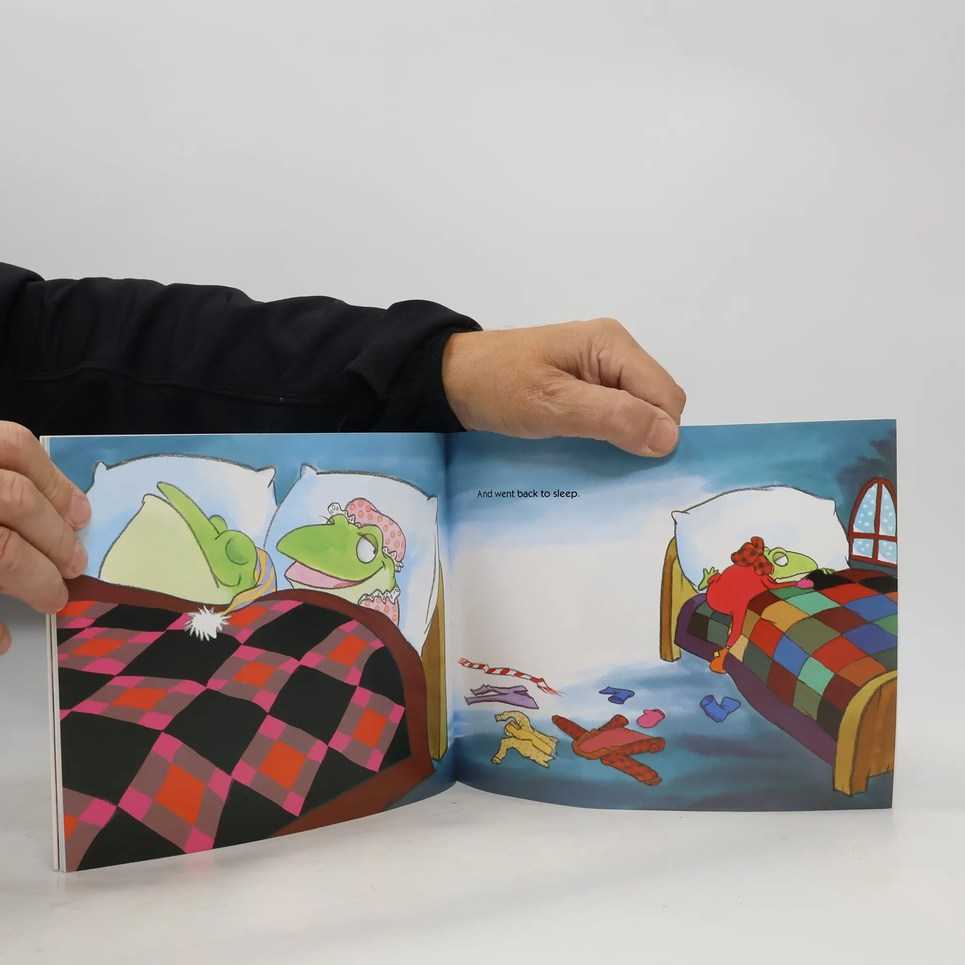 Rambunctious Froggy hops out into the snow for a winter frolic but is called back by his mother to put on some necessary articles of clothing.