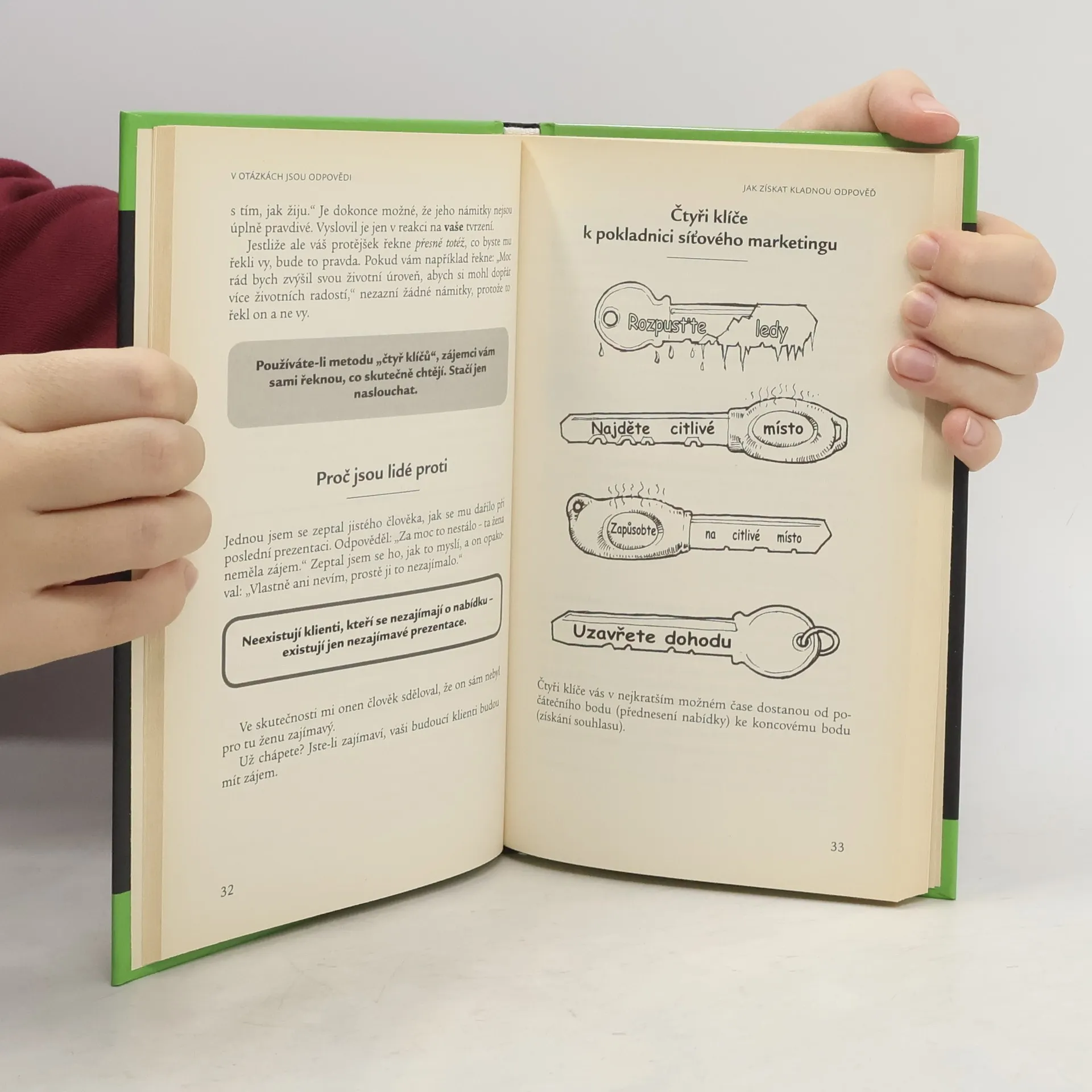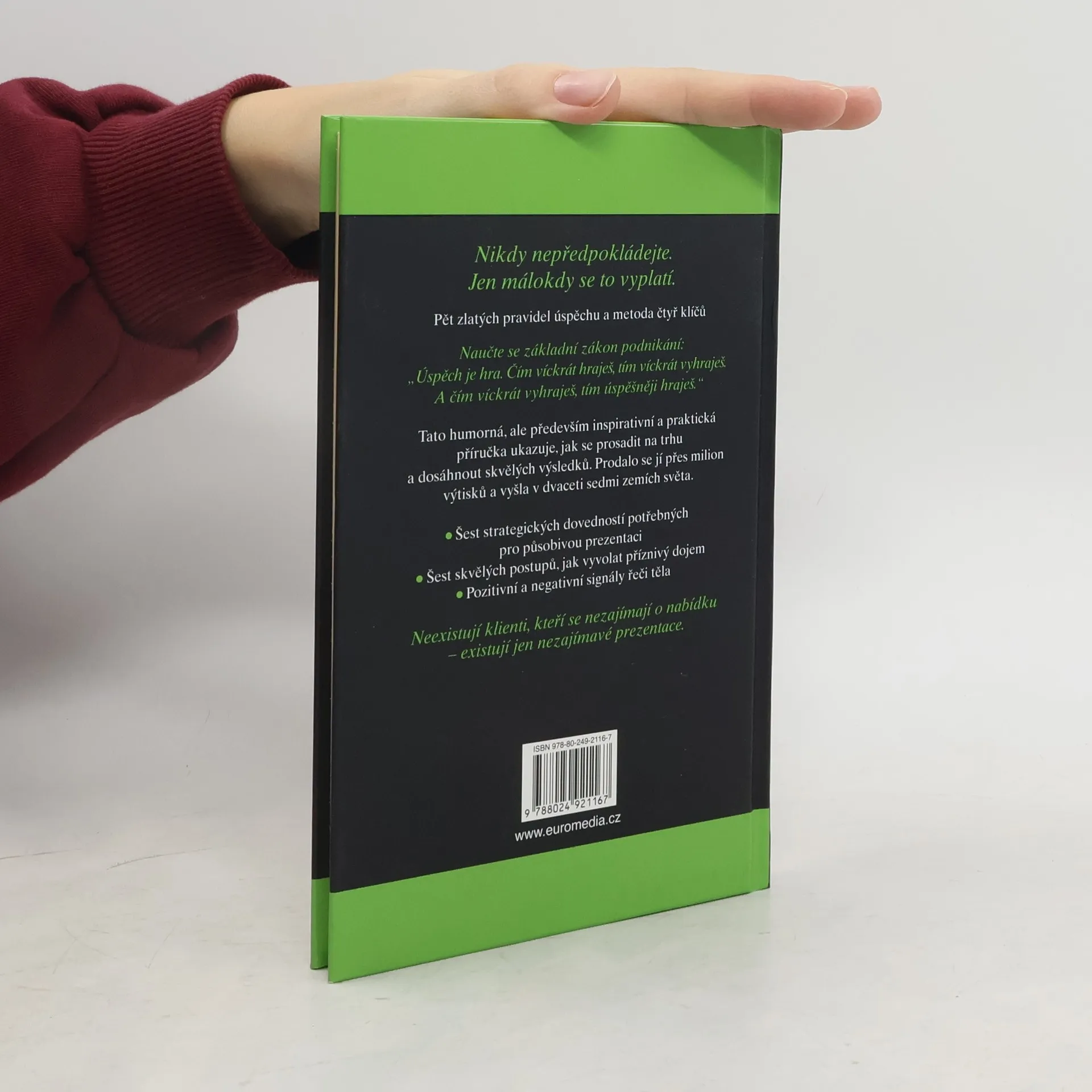 Tato humorná, ale především inspirativní a praktická příručka ukazuje, jak se prosadit na jakémkoli trhu a dosáhnout skvělých výsledků. Prodalo se jí přes milion výtisků a vyšla v dvaceti sedmi zemích světa. Kromě jiného se dozvíte pět zlatých pravidel úspěchu, metodu čtyř klíčů, šest strategických dovedností potřebných pro působivou prezentaci a šest skvělých postupů, jak vyvolat příznivý dojem. Nechybí ani kapitola o řeči těla.