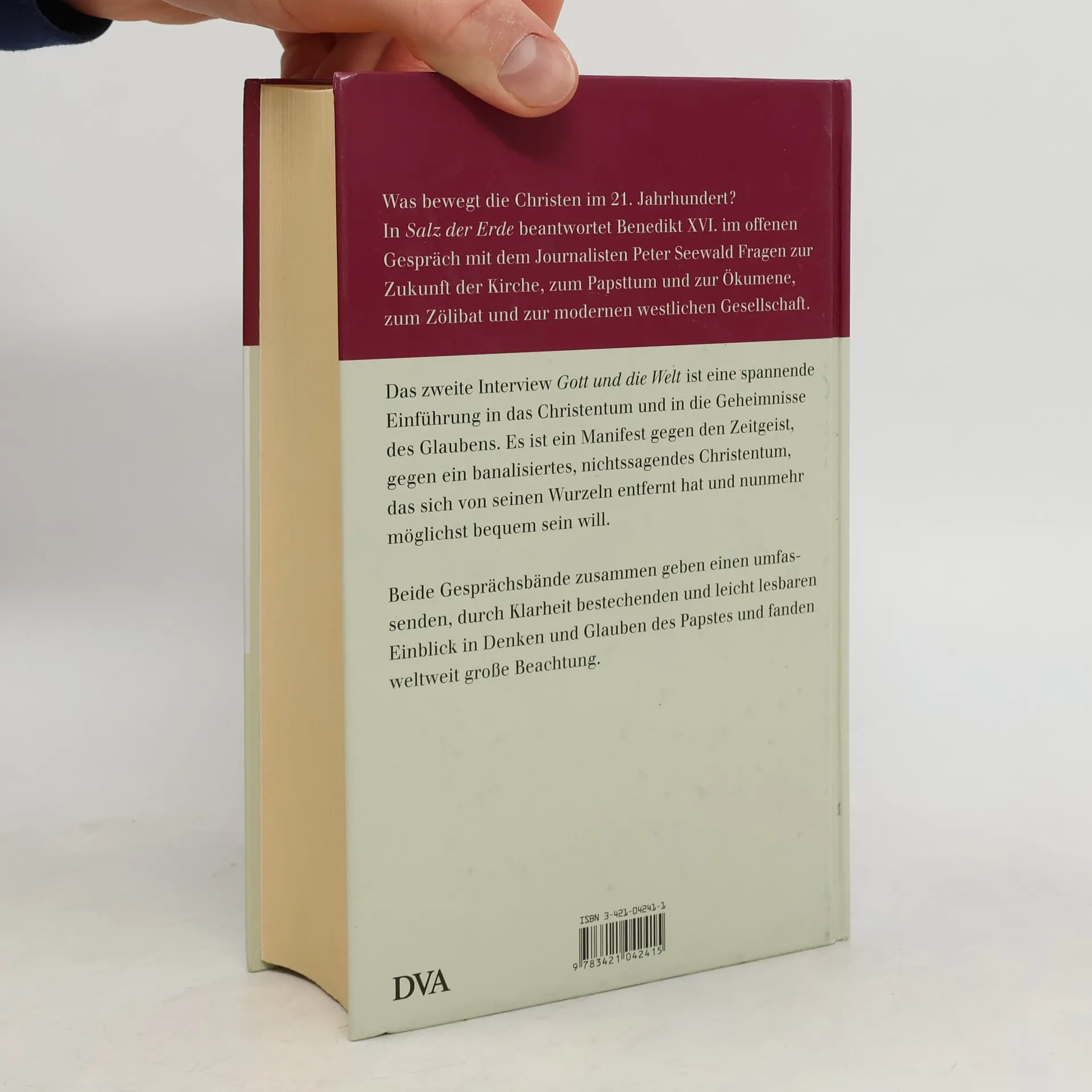 "Es muß sozusagen wieder eine Neugierde nach dem Christentum entstehen, der Wunsch, wirklich zu erkennen, was da eigentlich ist." Benedikt XVI. Was bewegt die Christen im 21. Jahrhundert? In "Salz der Erde" beantwortet Benedikt XVI. im offenen Gespräch mit dem Journalisten Peter Seewald Fragen zur Zukunft der Kirche, zum Papsttum und zur Ökumene, zum Zölibat und zur modernen westlichen Gesellschaft. Das zweite Interview "Gott und die Welt" ist eine spannende Einführung in das Christentum und in die Geheimnisse des Glaubens. Es ist ein Manifest gegen den Zeitgeist, gegen ein banalisiertes, nichtssagendes Christentum, das sich von seinen Wurzeln entfernt hat und nurmehr möglichst bequem sein will. Beide Gesprächsbände zusammen geben einen umfassenden, durch Klarheit bestechenden und leicht lesbaren Einblick in Denken und Glauben des Papstes und fanden weltweit große Beachtung.