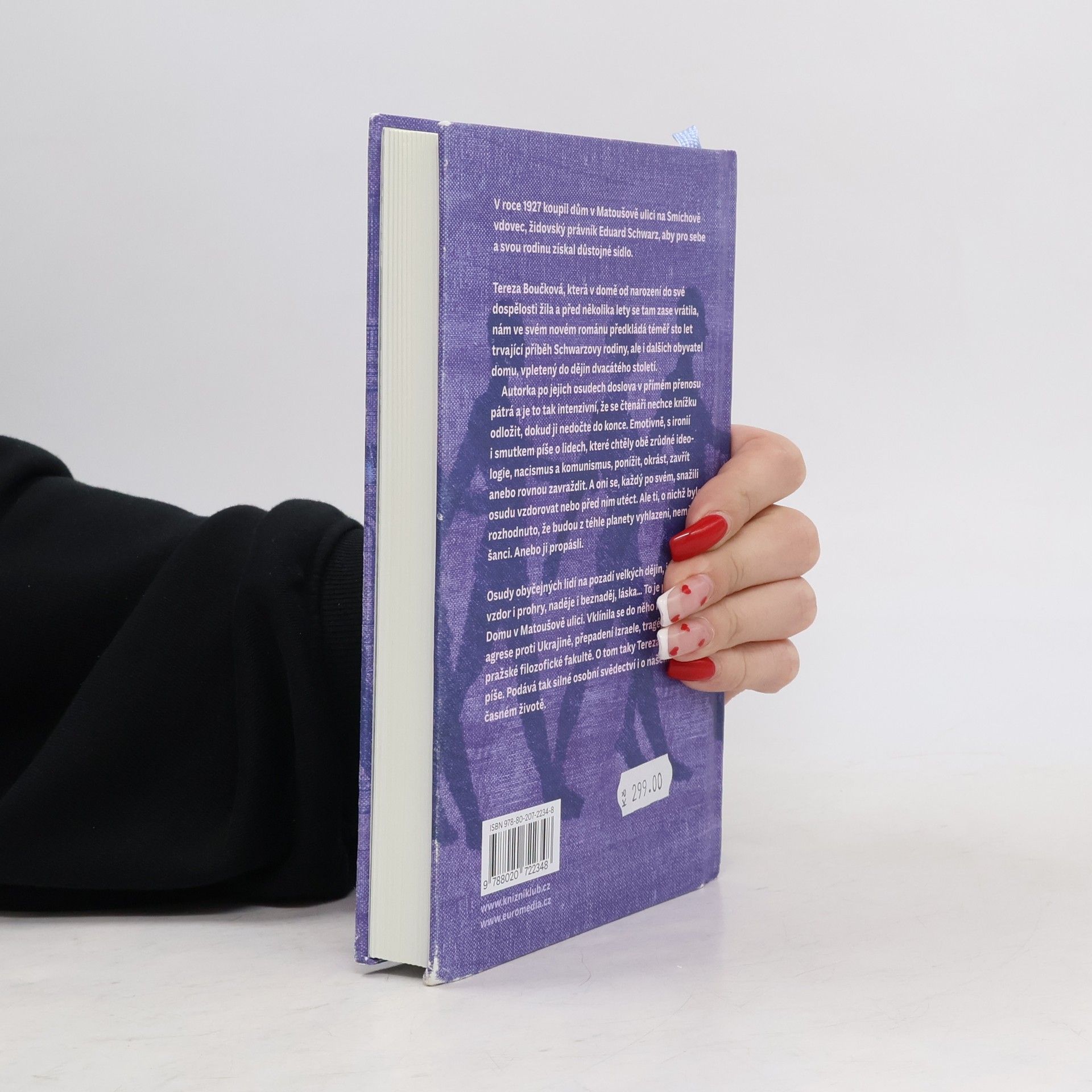 V roce 1927 koupil dům v Matoušově ulici na Smíchově vdovec, židovský právník Eduard Schwarz, aby pro sebe a svou rodinu získal důstojné sídlo. Měl štěstí, že zemřel dřív než začala druhá světová válka. Tereza Boučková, která v domě od narození do své dospělosti žila a před několika lety se tam zase vrátila, nám ve svém románu předkládá téměř sto let trvající příběh Schwarzových potomků, ale i dalších obyvatel domu, vpletený do dějin dvacátého století. Autorka po jejich osudech doslova v přímém přenosu pátrá a je to tak intenzivní, že se čtenáři nechce knížku odložit, dokud ji nedočte do konce. Emotivně, s ironií, ale i smutkem píše o lidech, které chtěly obě zrůdné ideologie, nacismus a komunismus, ponížit, okrást, zavřít anebo zavraždit.