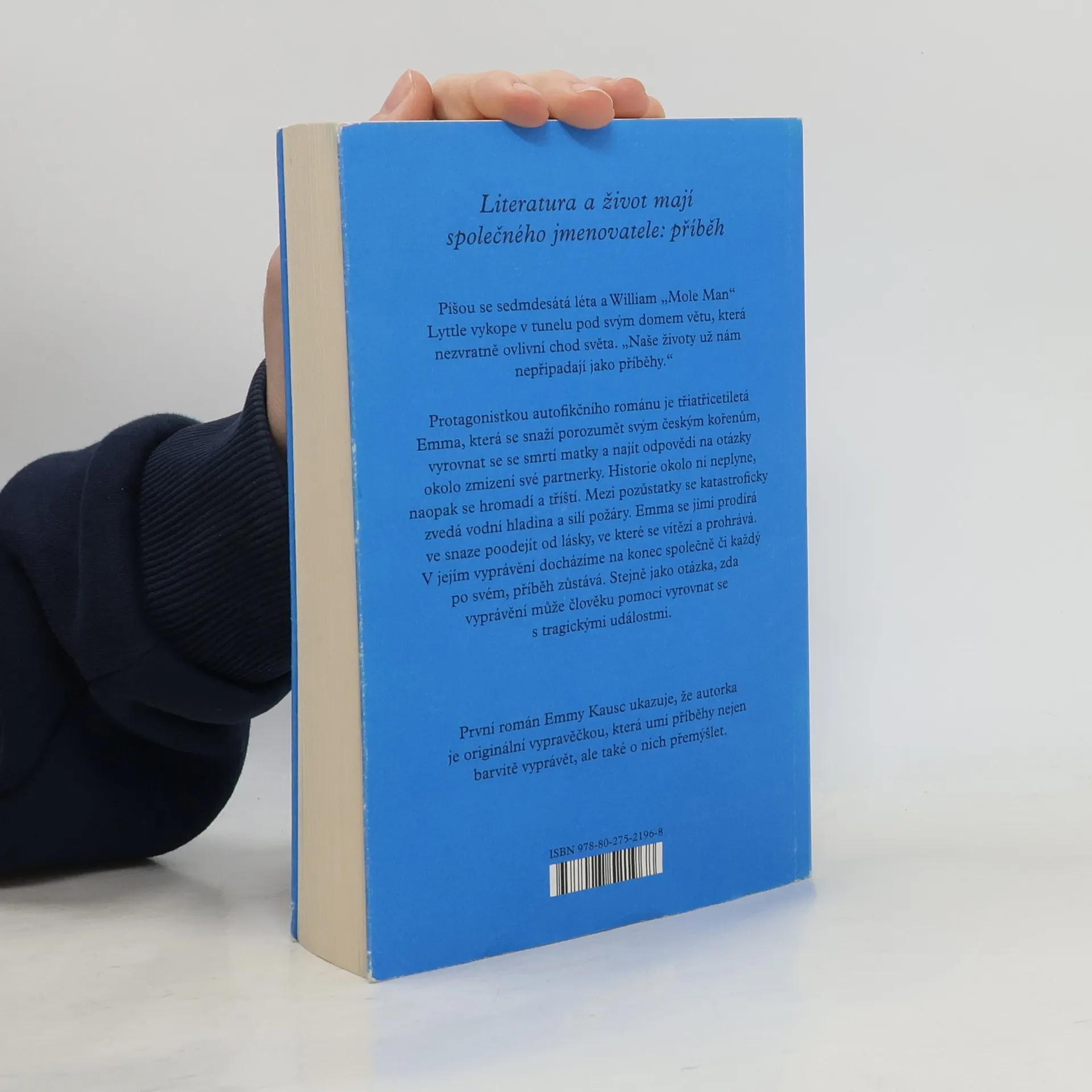 Literatura a život mají společného jmenovatele: příběh. Píší se sedmdesátá léta a William „Mole Man“ Lyttle vykope v tunelu pod svým domem větu, která nezvratně ovlivní chod našeho světa. „Naše životy už nám nepřipadají jako příběhy.“ Protagonistkou autofikčního románu je třiatřicetiletá Emma, která se snaží porozumět svým českým kořenům, vyrovnat se se smrtí matky a najít odpovědi na otázky okolo zmizení své partnerky. Historie okolo ní neplyne, naopak se hromadí a tříští. Mezi pozůstatky se katastroficky zvedá vodní hladina a sílí požáry. Emma se jimi prodírá ve snaze poodejít od lásky, ve které se vítězí a prohrává. V jejím vyprávění docházíme na konec společně či každý po svém, příběh zůstává. Stejně jako otázka, zda vyprávění může člověku pomoci vyrovnat se s tragickými událostmi. První román Emmy Kausc ukazuje, že autorka je originální vypravěčkou, která umí příběhy nejen barvitě vyprávět, ale také o nich přemýšlet.