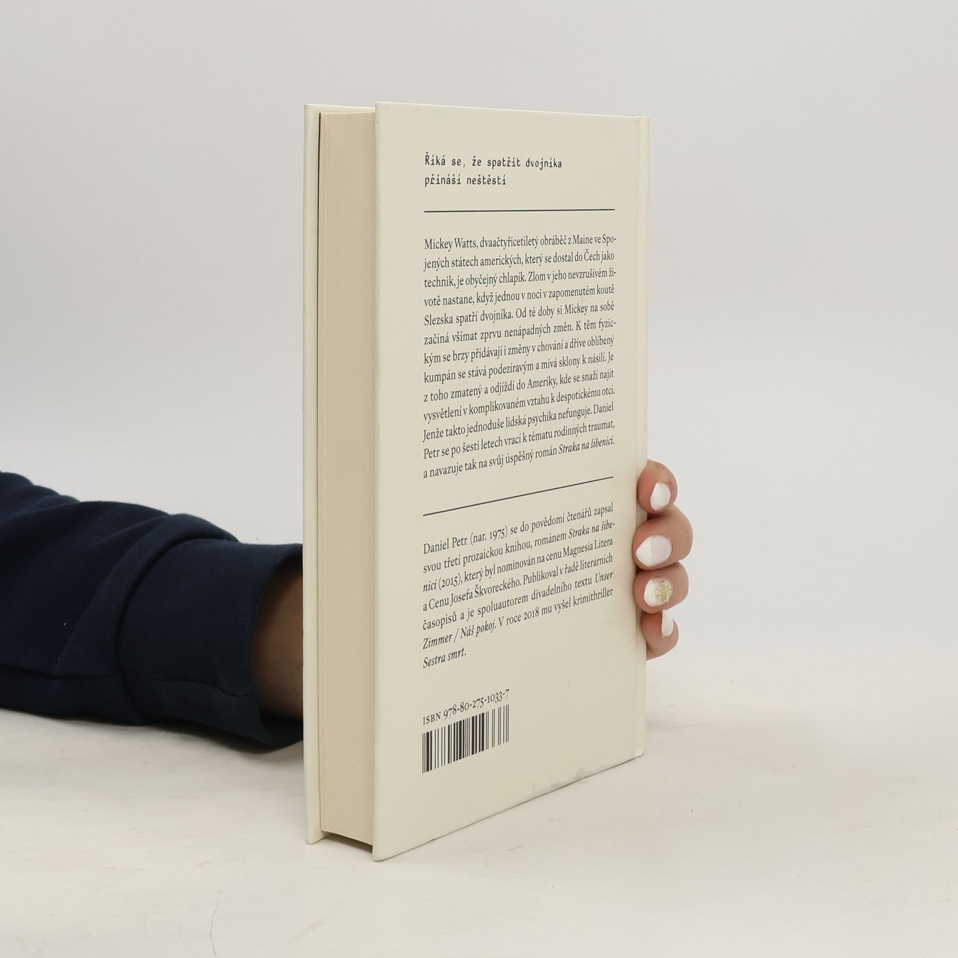 Mickey Watts, dvaačtyřicetiletý obráběč z Maine ve Spojených státech amerických, který se dostal do Čech jako technik, je obyčejný chlapík. Zlom v jeho nevzrušivém životě nastane, když jednou v noci v zapomenutém koutě Slezska spatří dvojníka. Od té doby si Mickey na sobě začíná všímat zprvu nenápadných změn. K těm fyzickým se brzy přidávají změny v chování a dříve oblíbený kumpán se stává podezíravým a mívá sklony k násilí. Je z toho zmatený a odjíždí do Ameriky, kde se snaží najít vysvětlení v komplikovaném vztahu k despotickému otci. Jenže takto jednoduše lidská psychika nefunguje. Daniel Petr se po šesti letech vrací k tématu rodinných traumat, a navazuje tak na svůj úspěšný román Straka na šibenici.