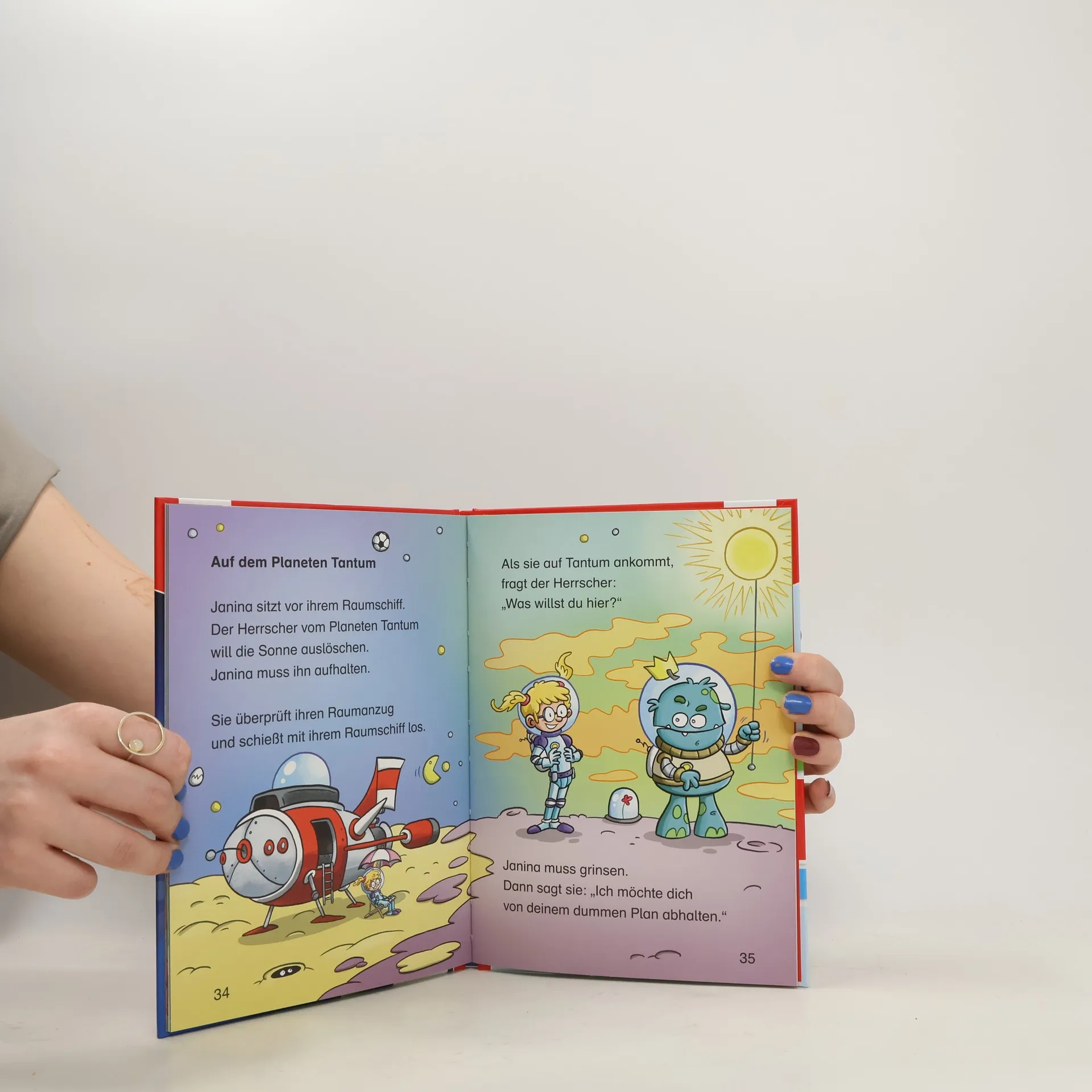 Bei Mia und Kai landet ein komisches Ding im Garten. Außerirdische Schulkinder entdecken die Erde. Philip beobachtet seltsame Wesen am Himmel, und Janina rettet ihren Planeten. Das Ding spricht eine unverständliche Sprache, dann rollt es plötzlich ins Haus. Dort wickelt es sich ein Kabel um dem Bauch – offenbar um sich mit Strom aufzuladen, denn kurz darauf beginnt es in allen Farben zu leuchten und schießt schließlich wie eine Feuerwerksrakete wieder in den Himmel. Die kleinen Außerirdischen sind aufgeregt, heute gucken sie in der Schule mit ihren Sehkugeln in den Sternenhimmel. Viele Sternbilder sind zu sehen, und dann plötzlich - ein blauer Planet: die Erde! Philip kann es nicht glauben. Er sieht zwei Kometen durchs All rasen, und auf denen hocken seltsame Wesen! Sie scheinen sich zu jagen, rasen um den Mond und krachen schließlich mit voller Wucht zusammen. Aber nichts passiert, sie steigen einfach auf die nächstbesten Kometen und machen weiter. Janina spielt mit ihrem Raumschiff. Sie muss die Erde retten, der Herrscher vom Planeten Tantum will die Sonne auslöschen, weil er wegen der Helligkeit nicht schlafen kann. Da hat Janina eine Idee. Sie schlägt ihm vor, doch auf der anderen Seite seines Planeten zu schlafen, da ist es dunkel. Der Herrscher ist begeistert! Und die Erde ist gerettet!