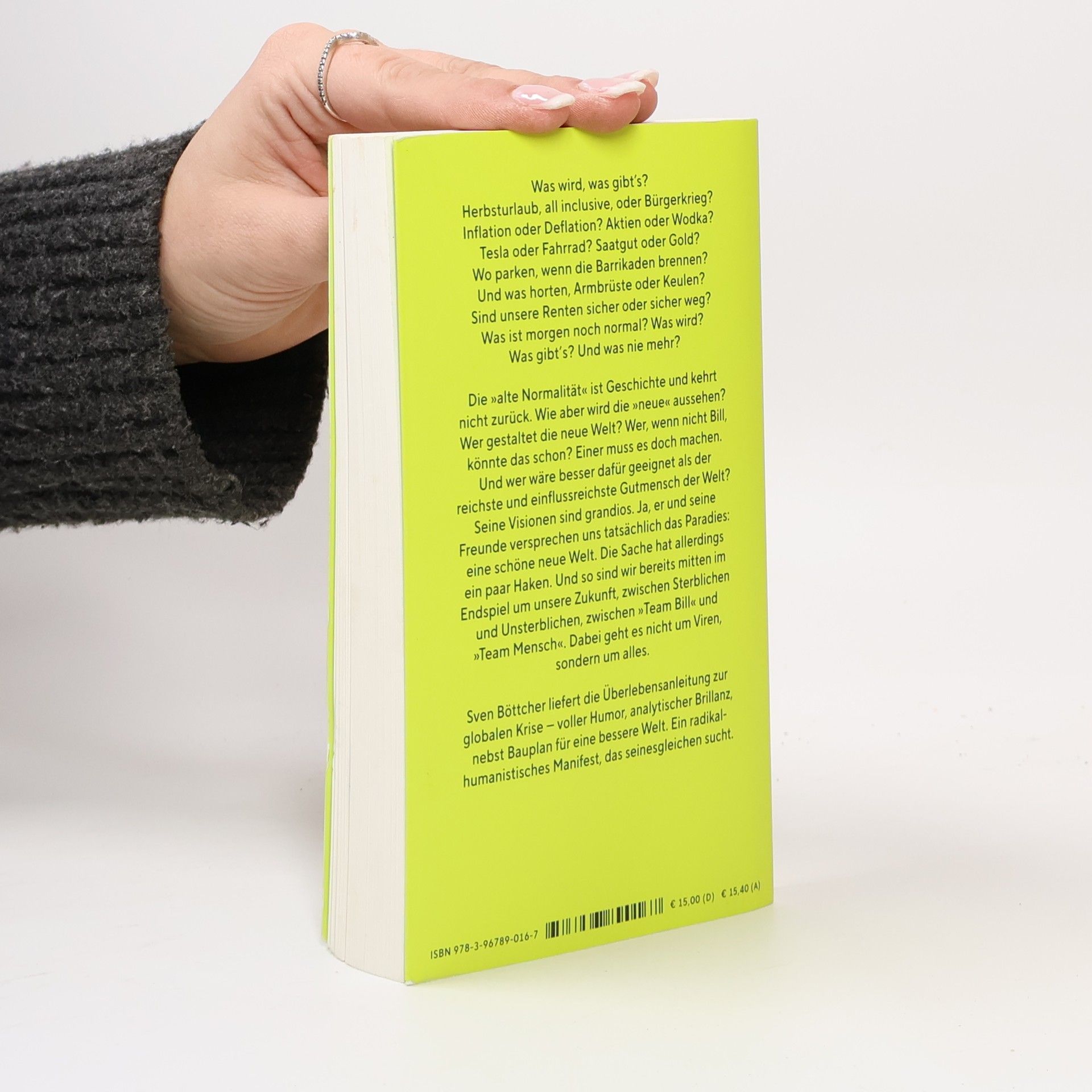 Was wird, was gibt‘s? Herbsturlaub, all inclusive, oder Bürgerkrieg? Inflation oder Deflation? Aktien oder Wodka? Tesla oder Fahrrad? Saatgut oder Gold? Wo parken, wenn die Barrikaden brennen? Und was horten, Armbrüste oder Keulen? Sind unsere Renten sicher oder sicher weg? Was ist morgen noch normal? Was wird? Was gibt‘s? Und was nie mehr? Die „alte Normalität“ ist Geschichte und kehrt nicht zurück. Wie aber wird die „neue“ aussehen? Wer gestaltet die neue Welt? Wer, wenn nicht Bill, könnte das schon? Einer muss es doch machen. Und wer wäre besser dafür geeignet als der reichste und einflussreichste Gutmensch der Welt? Seine Visionen sind grandios. Ja, er und seine Freunde versprechen uns tatsächlich das Paradies: eine schöne neue Welt. Die Sache hat allerdings ein paar Haken. Und so sind wir bereits mitten im Endspiel um unsere Zukunft, zwischen Sterblichen und Unsterblichen, zwischen „Team Bill“ und „Team Mensch“. Dabei geht es nicht um Viren, sondern um alles. Sven Böttcher liefert die Überlebensanleitung zur globalen Krise — voller Humor, analytischer Brillanz, nebst Bauplan für eine bessere Welt. Ein radikalhumanistisches Manifest, das seinesgleichen sucht.
