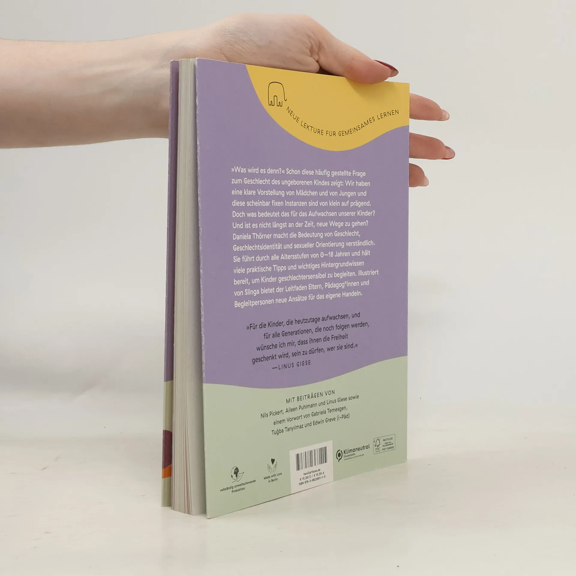 »Was wird es denn?« Schon diese häufig gestellte Frage zum Geschlecht des ungeborenen Kindes zeigt: Wir haben eine klare Vorstellung von Mädchen und von Jungen und diese scheinbar fixen Instanzen sind von klein auf prägend. Doch was bedeutet das für das Aufwachsen unserer Kinder? Und ist es nicht längst an der Zeit, neue Wege zu gehen? Daniela Thörner macht die Bedeutung von Geschlecht, Geschlechtsidentität und sexueller Orientierung verständlich. Sie führt durch alle Altersstufen von 0–18 Jahren und hält viele praktische Tipps und wichtiges Hintergrundwissen bereit, um Kinder geschlechtersensibel zu begleiten. Illustriert von Slinga bietet der Leitfaden Eltern, Pädagog*innen und Begleitpersonen neue Ansätze für das eigene Handeln.