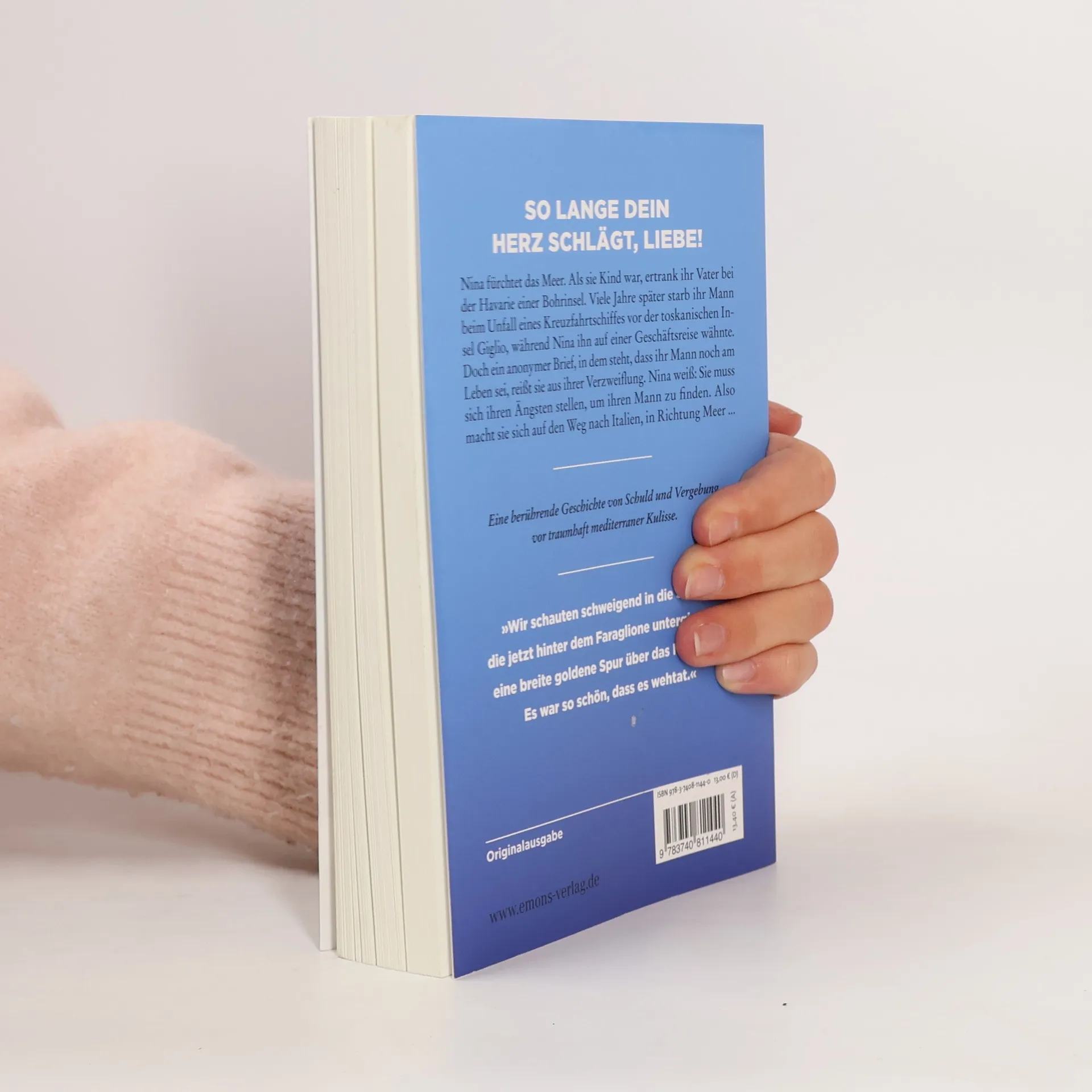 Eine Geschichte von Schuld und Vergebung. Nina fürchtet das Meer. Als sie Kind war, ertrank ihr Vater bei der Havarie einer Bohrinsel. Viele Jahre später starb ihr Mann beim Unfall eines Kreuzfahrtschiffes vor der toskanischen Insel Giglio, während Nina ihn auf einer Geschäftsreise wähnte. Doch ein anonymer Brief, in dem steht, dass ihr Mann noch am Leben sei, reißt sie aus ihrer Verzweiflung. Nina weiß: Sie muss sich ihren Ängsten stellen, um ihren Mann zu finden. Also macht sie sich auf den Weg nach Italien, in Richtung Meer ...