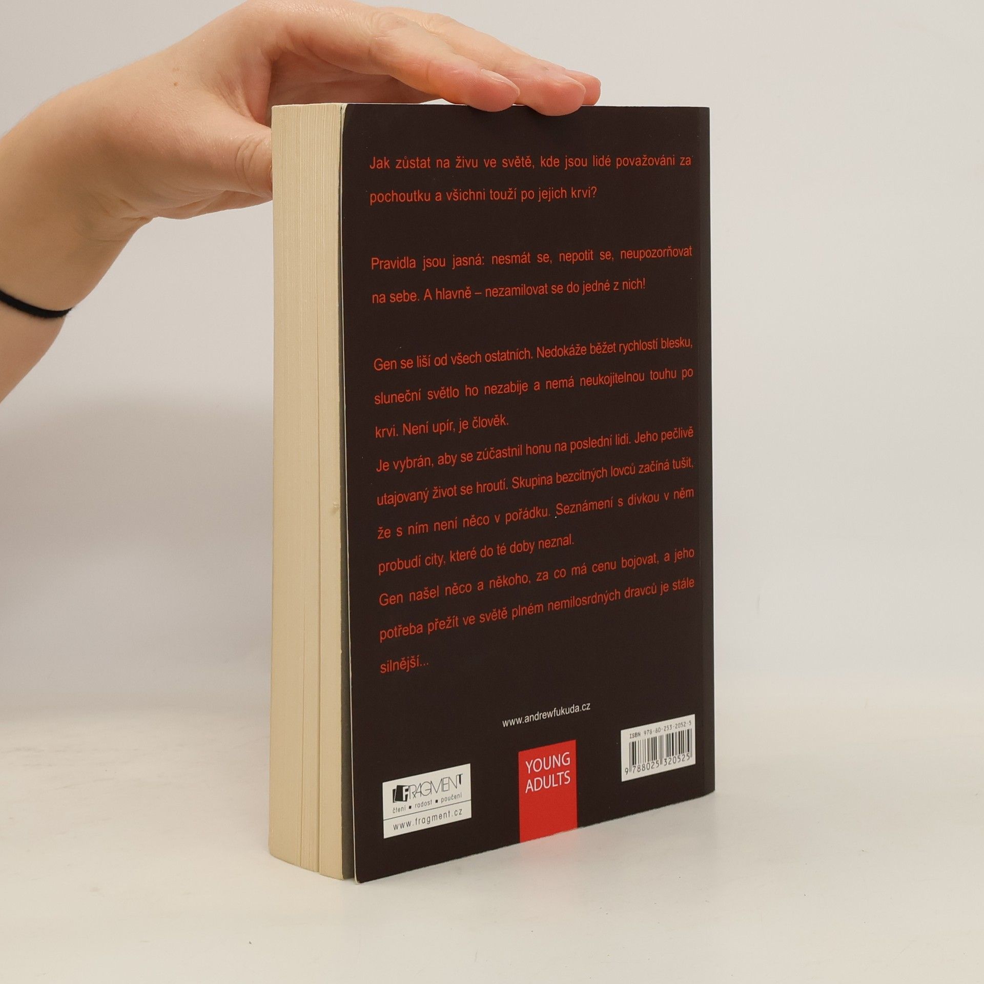 Jak zůstat na živu ve světě, kde jsou lidé považováni za pochoutku a všichni touží po jejich krvi? Pravidla jsou jasná: nesmát se, nepotit se, neupozorňovat na sebe. A hlavně – nezamilovat se do jedné z nich! Gen se liší od všech ostatních. Nedokáže běžet rychlostí blesku, sluneční světlo ho nezabije a nemá neukojitelnou touhu po krvi. Není upír, je člověk. Je vybrán, aby se zúčastnil honu na poslední lidi. Jeho pečlivě utajovaný život se hroutí. Skupina bezcitných lovců začíná tušit, že s ním není něco v pořádku. Seznámení s dívkou v něm probudí city, které do té doby neznal. Gen našel něco a někoho, za co má cenu bojovat, a jeho potřeba přežít ve světě plném nemilosrdných dravců je stále silnější... První vydání. -- zdroj: legie.info --