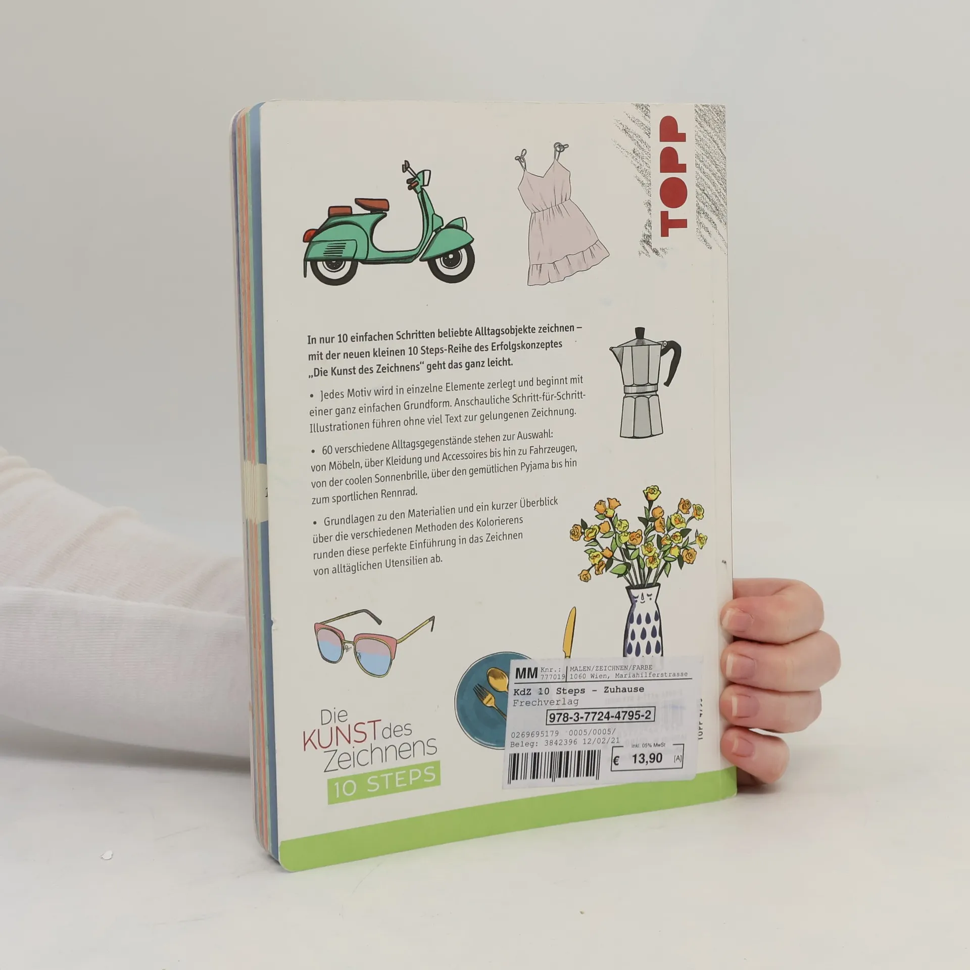 In nur 10 einfachen Schritten alltägliche Dinge zeichnen – mit der neuen kleinen 10 Steps-Reihe des Erfolgskonzeptes „Die Kunst des Zeichnens“ geht das ganz leicht. Jedes Motiv wird in einzelne Elemente zerlegt und beginnt mit einer ganz einfachen Grundform. Anschauliche Schritt-für-Schritt-Illustrationen führen ohne viel Text zur gelungenen Zeichnung. 60 verschiedene Alltagsgegenstände stehen zur Auswahl: von Möbeln, Kleidung und Geschirr über Utensilien aus Küche, Bad und Wohnzimmer bis hin zu Fortbewegungsmitteln wie Fahrrad, Rollschuhe und Auto. Grundlagen zu den Materialien und ein kurzer Überblick über die verschiedenen Methoden des Kolorierens runden diese perfekte Einführung in das Zeichnen von Alltagsobjekten ab.