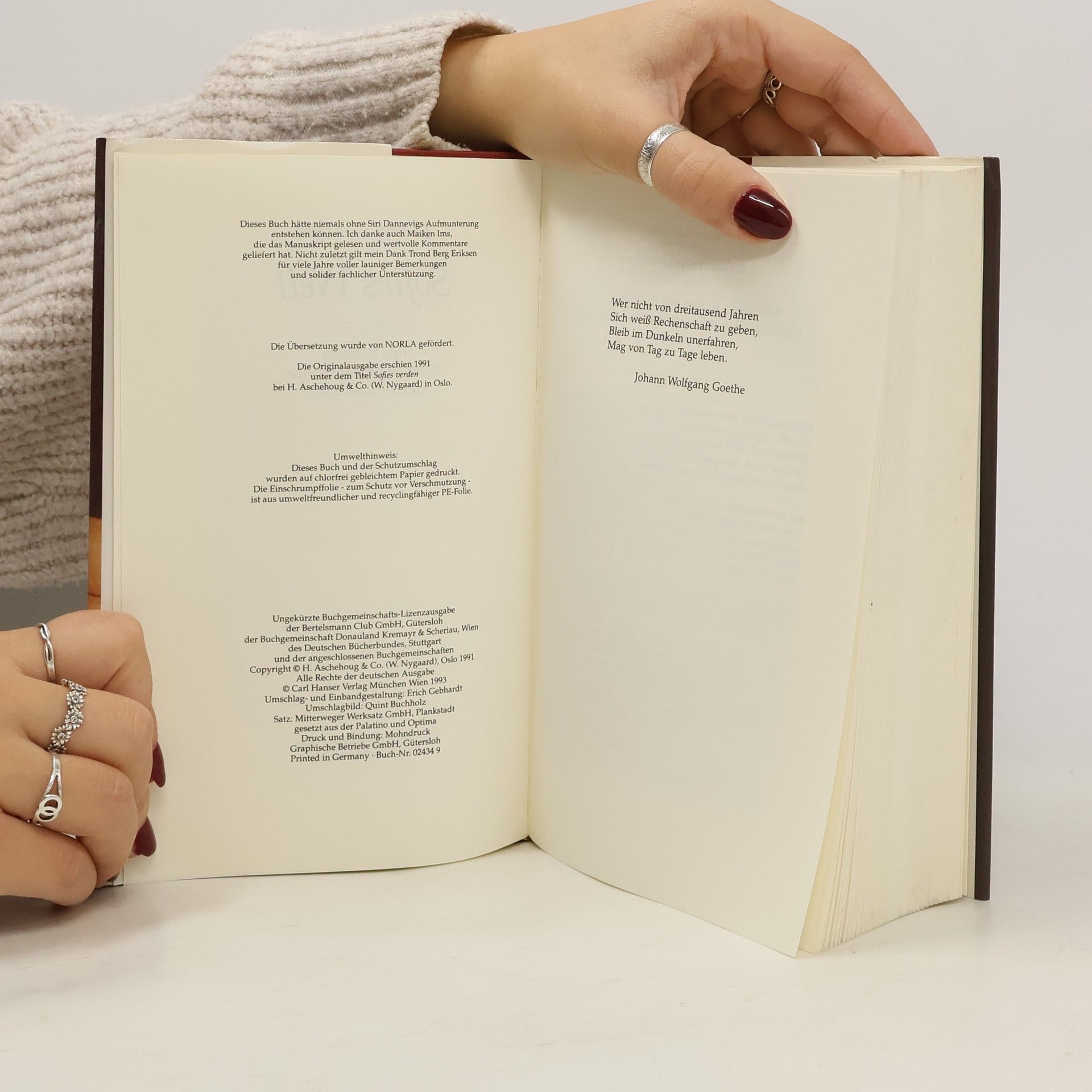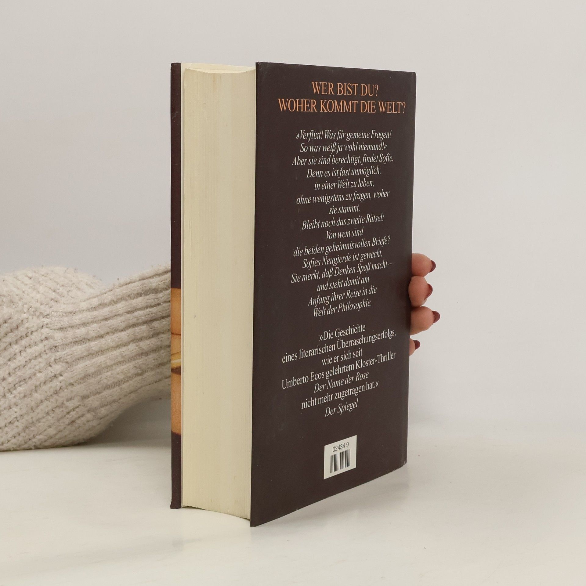 »Ein dickes Buch, mit spitzen Fingern angefaßt und mit Begeisterung zugeklappt: ein großer Wurf im wörtlichen wie übertragenen Sinn.« Die Zeit Mysteriöse Briefe landen im Briefkasten der 15jährigen Sofie Amundsen in Oslo. Was sollen diese Fragen: »Wer bist du?«, »Was ist ein Mensch?« und »Woher kommt die Welt?«. Sofie ist irritiert. Die Briefe werden ausführlicher und entführen sie in die abenteuerliche und geheimnisvolle Gedankenwelt der großen Philosophen. Ihr unbekannter Briefeschreiber erzählt Sofie die Geschichte Europas, der Antike, des Mittelalters und der Renaissance und dann nimmt die Geschichte eine unglaubliche Wendung.