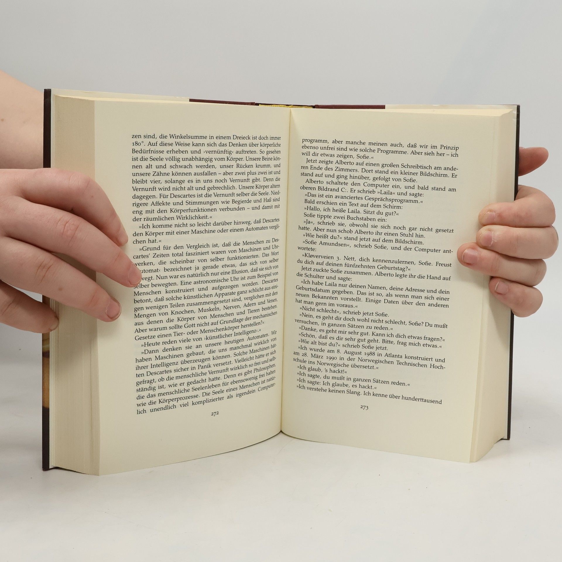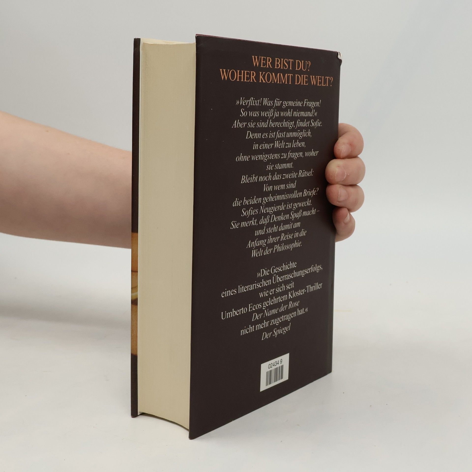 »Ein dickes Buch, mit spitzen Fingern angefaßt und mit Begeisterung zugeklappt: ein großer Wurf im wörtlichen wie übertragenen Sinn.« Die Zeit Mysteriöse Briefe landen im Briefkasten der 15jährigen Sofie Amundsen in Oslo. Was sollen diese Fragen: »Wer bist du?«, »Was ist ein Mensch?« und »Woher kommt die Welt?«. Sofie ist irritiert. Die Briefe werden ausführlicher und entführen sie in die abenteuerliche und geheimnisvolle Gedankenwelt der großen Philosophen. Ihr unbekannter Briefeschreiber erzählt Sofie die Geschichte Europas, der Antike, des Mittelalters und der Renaissance und dann nimmt die Geschichte eine unglaubliche Wendung.