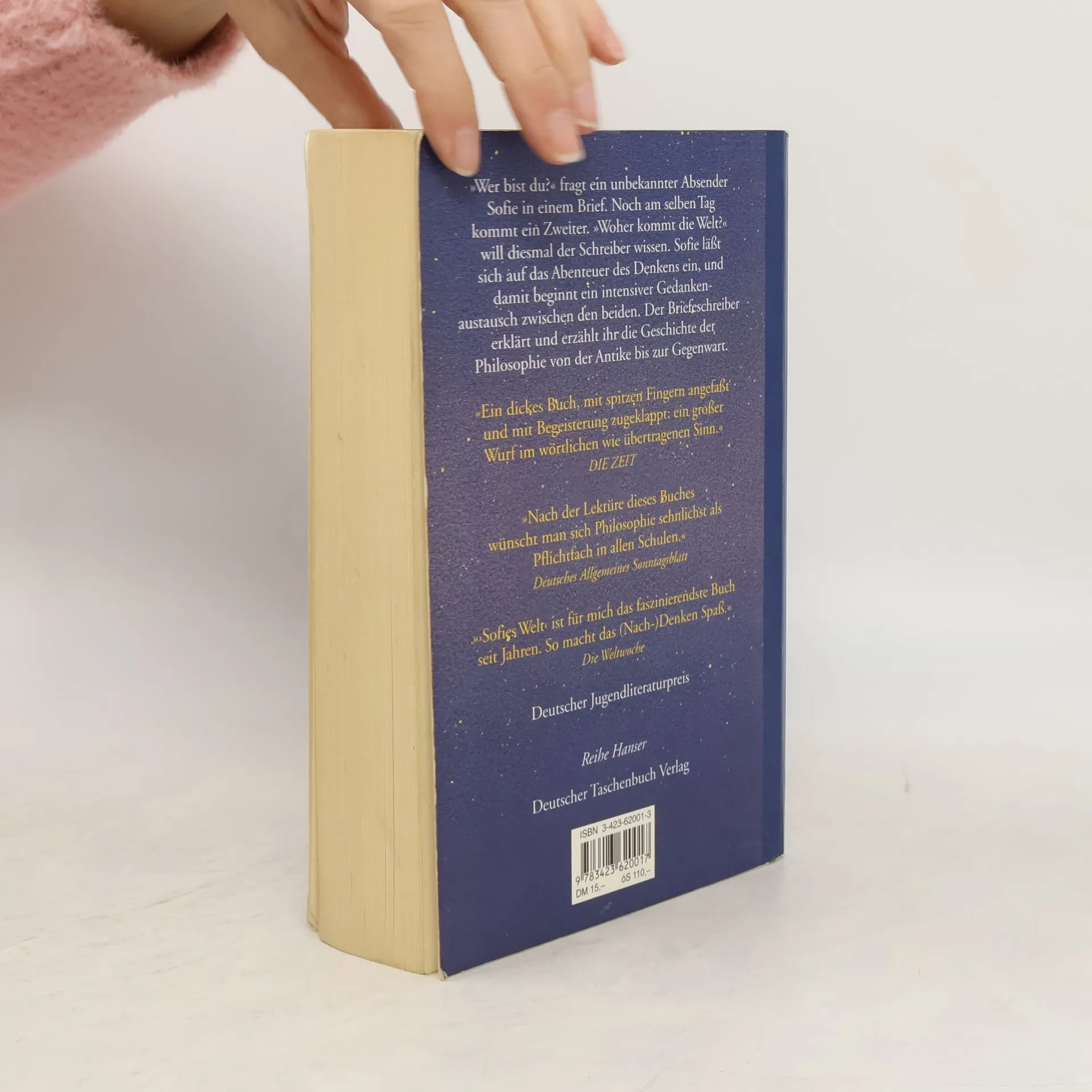 Mysteriöse Briefe landen im Briefkasten der 15jährigen Sofie Amundsen in Oslo. Was sollen diese Fragen: »Wer bist du?«, »Was ist ein Mensch?« und »Woher kommt die Welt?«. Sofie ist irritiert. Die Briefe werden ausführlicher und entführen sie in die abenteuerliche und geheimnisvolle Gedankenwelt der großen Philosophen. Ihr unbekannter Briefeschreiber erzählt Sofie die Geschichte Europas, der Antike, des Mittelalters und der Renaissance und dann nimmt die Geschichte eine unglaubliche Wendung.