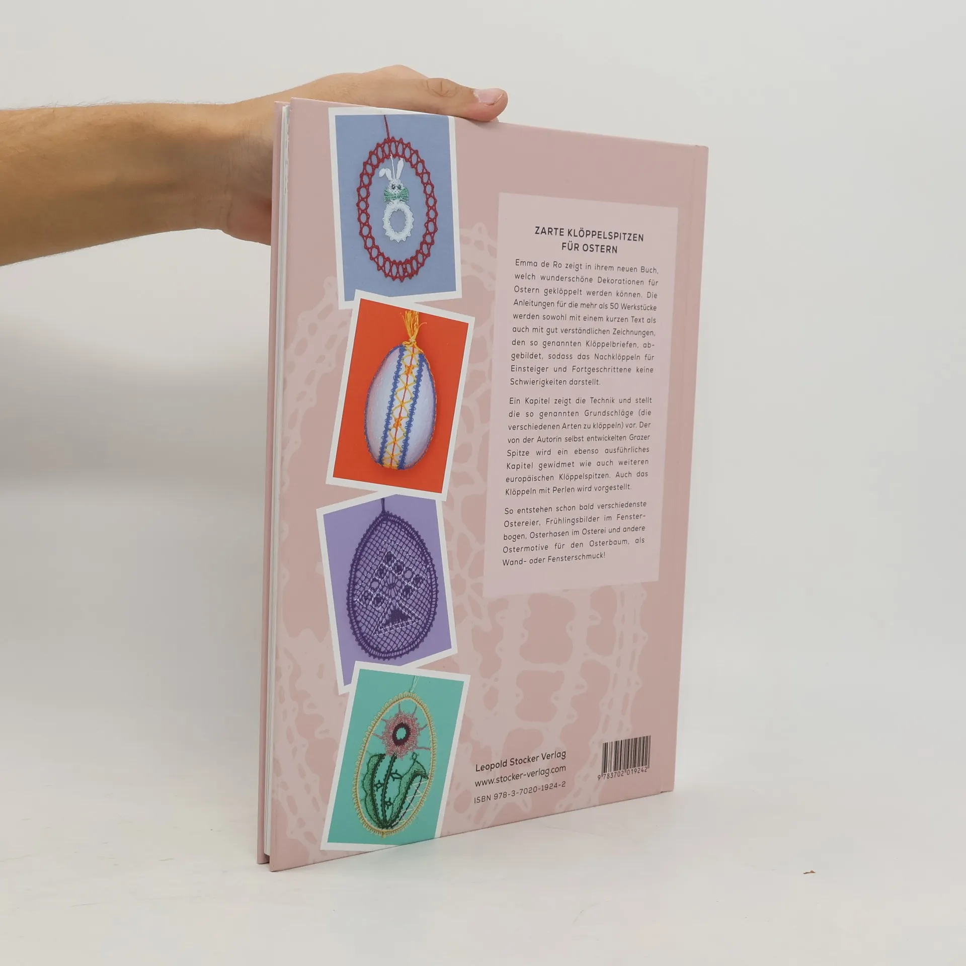 • Grazer Spitze • Verschiedene Klöppelspitzen aus ganz Europa • Einfarbig und bunt Emma de Ro zeigt in ihrem neuen Buch, wie wunderschöne Dekorationen für Ostern geklöppelt werden können. Die Anleitungen für die ca. 60 Werkstücke werden sowohl mit einem kurzen Text als auch mit gut verständlichen Zeichnungen, den so genannten Klöppelbriefen, abgebildet, sodass das Nachklöppeln für Einsteiger und Fortgeschrittene keine Schwierigkeiten mehr darstellt. Eine Einleitung zeigt die Technik und stellt die so genannten Grundschläge (die verschiedenen Arten zu klöppeln) vor. Ein weiteres Kapitel widmet sich verschiedenen europäischen Klöppelspitzen. Auch das Klöppeln mit Perlen wird vorgestellt. So entstehen schon bald verschiedenste Ostereier, Frühlingsbilder im Fensterbogen, Osterhasen im Osterei und andere Ostermotive!