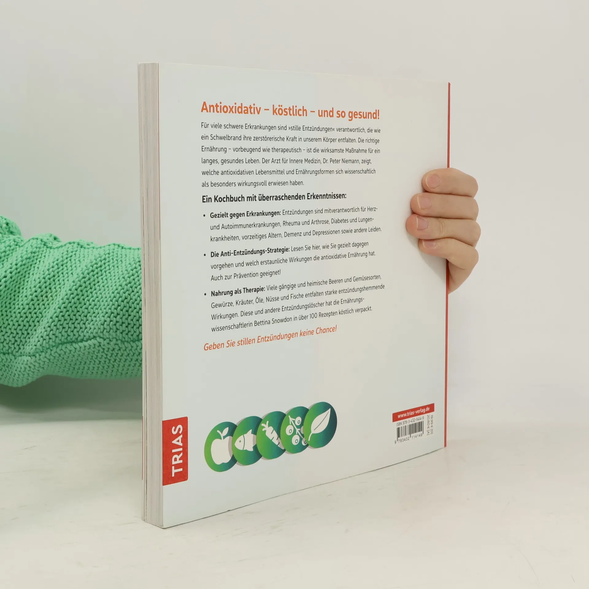 Antioxidativ – köstlich – und so gesund! Für viele schwere Erkrankungen sind »stille Entzündungen« verantwortlich, die wie ein Schwelbrand ihre zerstörerische Kraft in unserem Körper entfalten. Die richtige Ernährung – vorbeugend wie therapeutisch – ist die wirksamste Maßnahme für ein langes, gesundes Leben. Der Arzt für Innere Medizin, Dr. Peter Niemann, zeigt, welche antioxidativen Lebensmittel und Ernährungsformen sich wissenschaftlich als besonders wirkungsvoll erwiesen haben. Ein Kochbuch mit überraschenden Erkenntnissen: • Gezielt gegen Erkrankungen: Entzündungen sind mitverantwortlich für Herz und Autoimmunerkrankungen, Rheuma und Arthrose, Diabetes und Lungenkrankheiten, vorzeitiges Altern, Demenz und Depressionen sowie andere Leiden. • Die Anti-Entzündungs-Strategie: Lesen Sie hier, wie Sie gezielt dagegen vorgehen und welch erstaunliche Wirkungen die antioxidative Ernährung hat. Auch zur Prävention geeignet! • Nahrung als Therapie: Viele gängige und heimische Beeren und Gemüsesorten, Gewürze, Kräuter, Öle, Nüsse und Fische entfalten starke entzündungshemmende Wirkungen. Diese und andere Entzündungslöscher hat die Ernährungswissenschaftlerin Bettina Snowdon in über 100 Rezepten köstlich verpackt. Geben Sie stillen Entzündungen keine Chance!