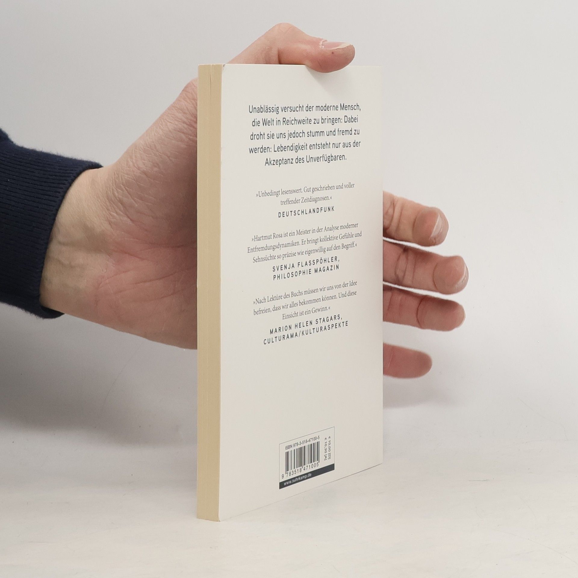 Ein fundiertes Plädoyer für eine Gesellschaft, die der Verfügbarkeit der Welt Grenzen setzt. Das zentrale Bestreben der Moderne gilt der Vergrößerung der eigenen Reichweite, des Zugriffs auf die Welt: Diese verfügbare Welt ist jedoch, so Hartmut Rosas brisante These, eine verstummte, mit ihr gibt es keinen Dialog mehr. Gegen diese fortschreitende Entfremdung zwischen Mensch und Welt setzt Rosa die Resonanz , als klingende, unberechenbare Beziehung mit einer nicht-verfügbaren Welt. Zur Resonanz kommt es, wenn wir uns auf Fremdes, Irritierendes einlassen, auf all das, was sich außerhalb unserer kontrollierenden Reichweite befindet. Das Ergebnis dieses Prozesses lässt sich nicht vorhersagen oder planen, daher eignet dem Ereignis der Resonanz immer auch ein Moment der Unverfügbarkeit.