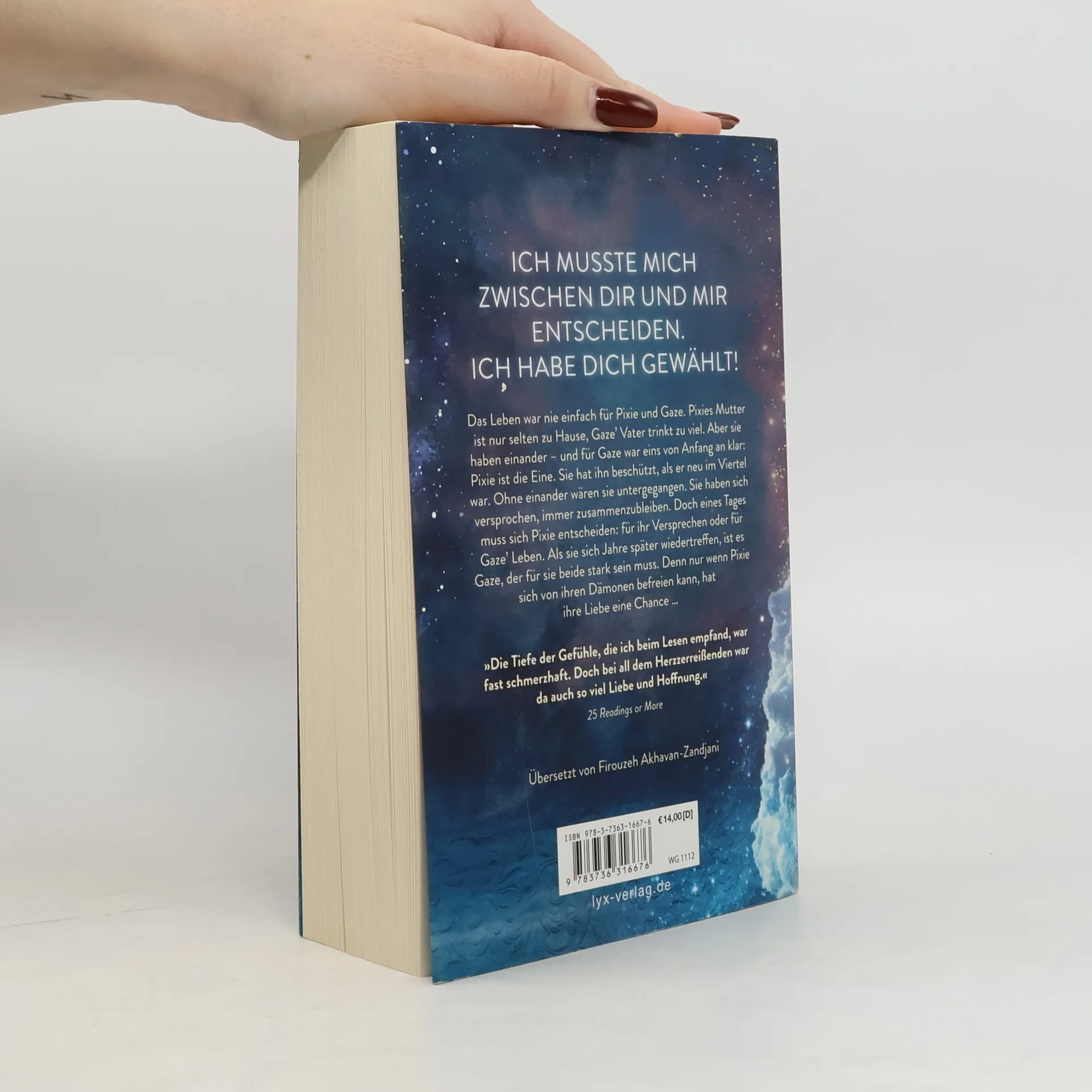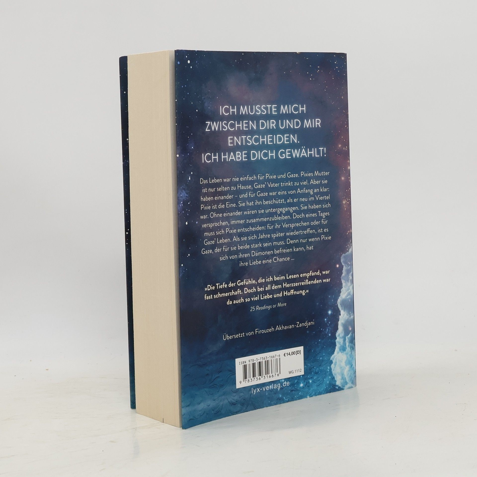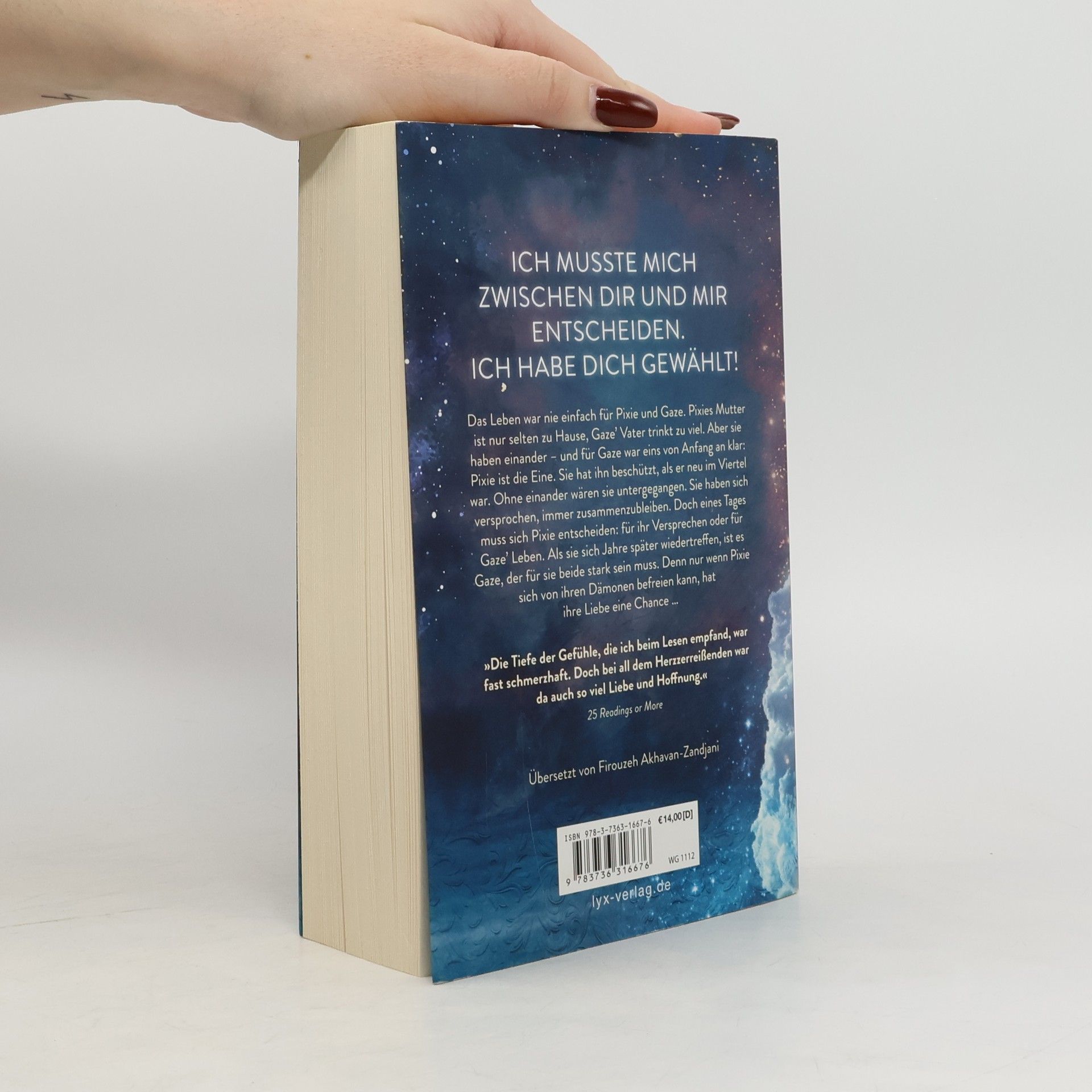 Ich musste mich zwischen dir und mir entscheiden. Ich habe dich gewählt! Das Leben war nie einfach für Pixie und Gaze. Pixies Mutter ist nur selten zu Hause, Gaze’ Vater trinkt zu viel. Aber sie haben einander - und für Gaze war eins von Anfang an klar: Pixie ist die Eine. Sie hat ihn beschützt, als er neu im Viertel war. Ohne einander wären sie untergegangen. Sie haben sich versprochen, immer zusammenzubleiben. Doch eines Tages muss sich Pixie entscheiden: für ihr Versprechen oder für Gaze’ Leben. Als sie sich Jahre später wiedertreffen, ist es Gaze, der für sie beide stark sein muss. Denn nur wenn Pixie sich von ihren Dämonen befreien kann, hat ihre Liebe eine Chance ... "Die Tiefe der Gefühle, die ich beim Lesen empfand, war fast schmerzhaft. Doch bei all dem Herzzerreißenden war da auch so viel Liebe und Hoffnung." 25 READINGS OR MORE Auftakt der dramatischen New-Adult-Dilogie