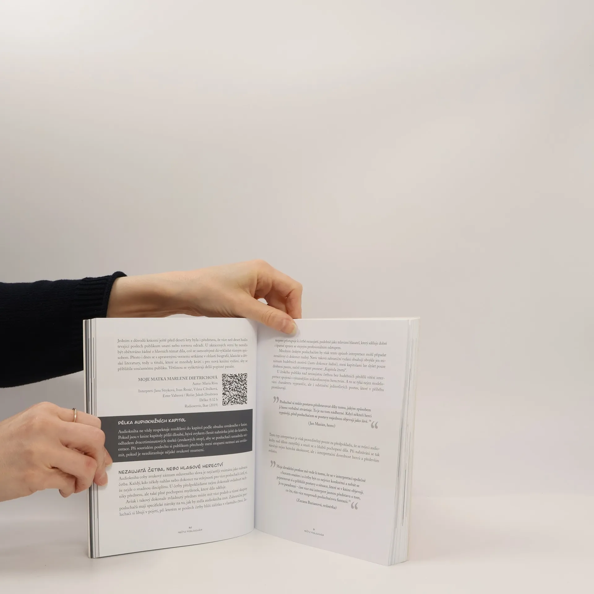 Trápí vás, jak málo času zbývá na čtení? Koneckonců i děti čtou mnohem méně, než bychom si přáli. Co ale zkusit knihy poslouchat? Soustředit se na mluvené slovo, to chce ovšem cvik. A hodí se i schopnost rozpoznat kvalitní audioknihu. Pojďme společně objevovat historii i současnost poslouchání a nahrávání četby. Nahlédneme do studia, kde audioknihy pod vedením zkušených režisérů vznikají, a dozvíme se, co o knihách k poslechu říkají herci, kteří je načítají, či samotní autoři děl. Rady, kde knihy poslouchat a jak si je užít, sepsali dva spisovatelé, kteří sami audioknihy milují. Aby získali nové příznivce poslechu, neváhali dokonce použít i obrázky.