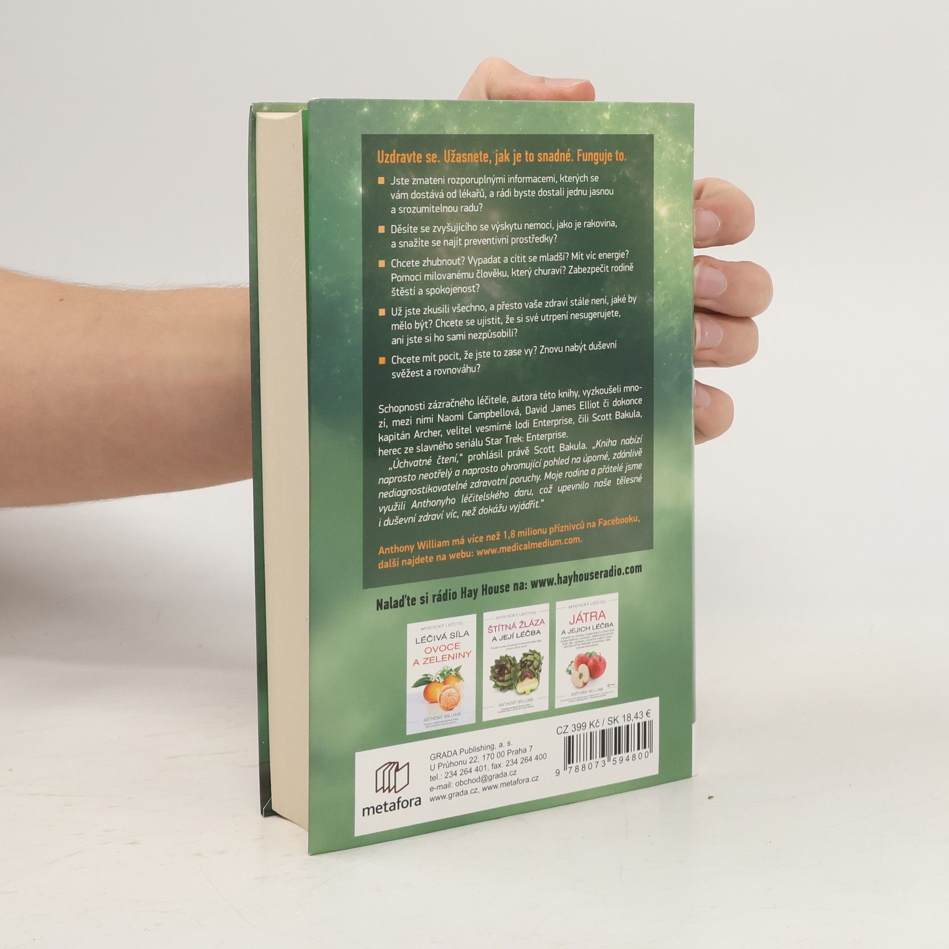 Novodobé médium odhaluje tajemství záhadných nemocí. Uzdravte se. Užasnete, jak je to snadné. Funguje to. Jste zmateni rozporuplnými informacemi, kterých se vám dostává od lékařů, a rádi byste dostali jednu jasnou, srozumitelnou radu? Děsíte se rakoviny? Chcete zhubnout? Vypadat a cítit se mladší? Mít víc energie? Nebo jste prostě nemocní a nikdo neví, co s vámi? Dokonce vám naznačují, že jste blázni a že si své potíže sugerujete. Už jste všechno zkusili, všude zašli, a přesto vám žádný doktor nepomohl. Pak jste na té správné adrese. Léčitel Anthony William zná cestu z toho začarovaného kruhu. Tam někde ve vyšších sférách jsou uložené veškeré informace. Řešení všeho. Léčebné metody, které lékařská věda objeví až pár let či dokonce desetiletí. A Anthony je zná.