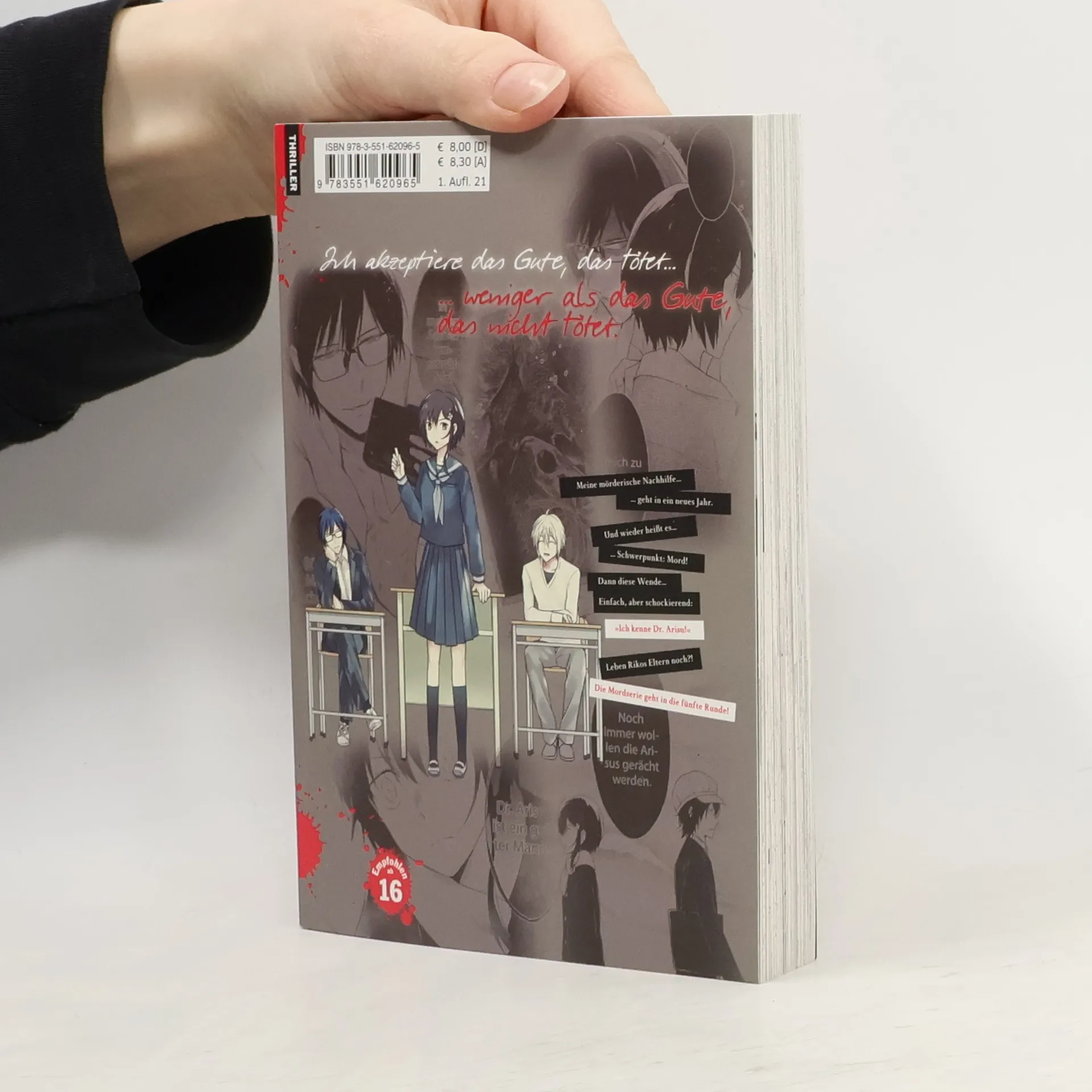 Ein mörderisches Bündnis – Ein düsterer Thriller über Rache und einen Serienmörder, der seinesgleichen jagt Riko will Rache. Ihre Eltern wurden ermordet, und sie kennt nur ein Ziel: den Killer finden und töten. Als sie herausfindet, dass ihr Lehrer ein Serienkiller ist, der andere Serienkiller tötet, schmiedet sie einen Plan: Sie lässt sie sich von ihm „ausbilden“. Doch bis Riko ihre langersehnte Rache bekommt, gilt es eine ganze Menge ausgebuffter Serienmörder aus dem Weg zu räumen, und dafür muss die zierliche Riko tief in eine bizarre Welt voller Gewalt eintauchen. Eine Welt, in der das ungleiche Killer-Pärchen eine sensible und überaus komplexe Beziehung zueinander aufbaut. Blutiger Psychothriller in fantastischem Artwork mit starkem weiblichem Hauptcharakter Abgeschlossen in 8 Bänden Empfohlen für Leser*innen ab 16 Jahren Dies ist Band 5 der Serie. "Teach me how to kill you" generiert seine Anziehungskraft durch die perfekte Mischung aus düsterer Killer-Soap und herrlicher CSI-Hommage.