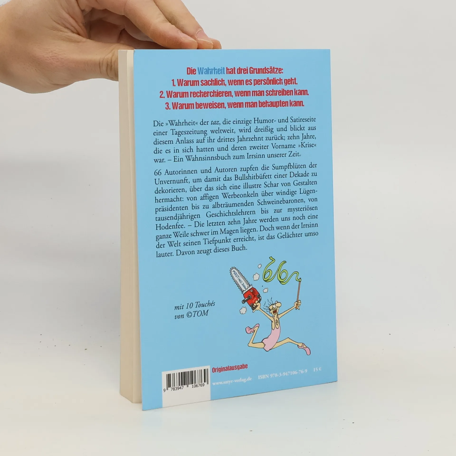 »Die Wahrheit« der taz, die einzige Humor- und Satireseite einer Tageszeitung weltweit, wird dreißig und blickt aus diesem Anlass noch einmal auf ihr drittes Jahrzehnt zurück; zehn Jahre, die es in sich hatten und deren zweiter Vorname »Krise« war. – Ein Wahnsinnsbuch zum Irrsinn unserer Zeit. Menschen mit hohen moralischen Ansprüchen an die Vergangenheit oder Gegenwart, Schwangeren, Hygienikern, Germanophoben und Germanophilen sowie Mitgliedern jedweder communities wird von der Lektüre dieses Buches dringend abgeraten. Es kann sogar Spuren von Nüssen enthalten! Handelt das »Wahnsinnsbuch« der »Wahrheit« doch von einer irren Dekade, die mit einer bahnbrechenden Schuldenkrise begann und einer todbringenden Coronakrise vorläufig endete. Und über allem thronte der Lügenk.nig Donald Trump – nackt, wie seine Fantasie ihn erschuf. 66 Autoren und Autorinnen der »Wahrheit« zupfen die Sumpfblüten des Irrsinns, um damit das Bullshitbüfett einer Dekade zu dekorieren, über das sich eine illustre Schar von luziden Gestalten hermacht: von affigen Werbeonkeln bis zu albträumenden Schweinebaronen, von tausendjährigen Geschichtslehrern bis zur mysteriösen Hodenfee. Ein Sammelsurium, gegen dessen universelle Präsenz sich zu wehren es der Komik der »Wahrheit« bedarf.