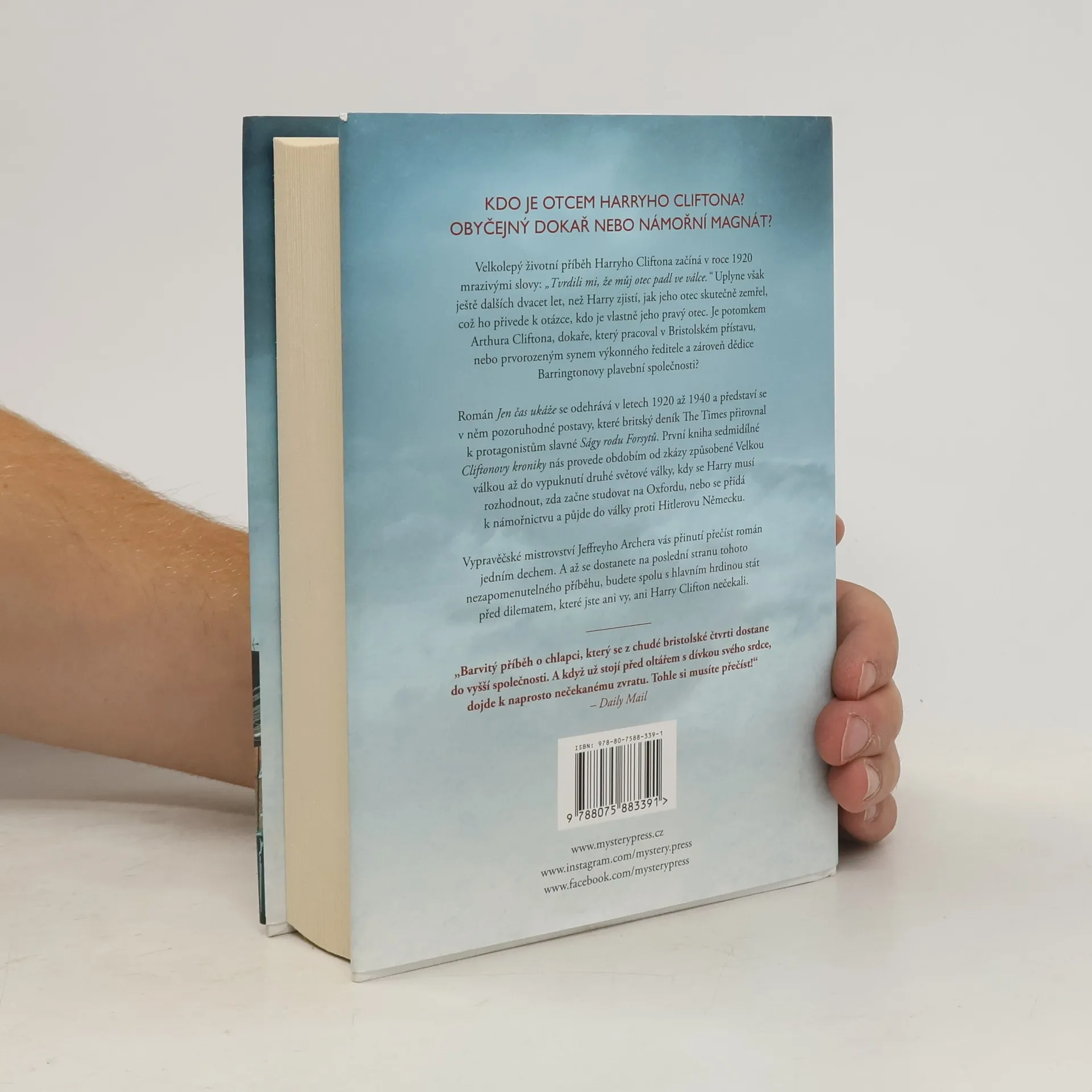 KDO JE OTCEM HARRYHO CLIFTONA? OBYČEJNÝ DOKAŘ NEBO NÁMOŘNÍ MAGNÁT? Velkolepý životní příběh Harryho Cliftona začíná v roce 1920 mrazivými slovy: „Tvrdili mi, že můj otec padl ve válce.“ Uplyne však ještě dalších dvacet let, než Harry zjistí, jak jeho otec skutečně zemřel, což ho přivede k otázce, kdo je vlastně jeho pravý otec. Je potomkem Arthura Cliftona, dokaře, který pracoval v Bristolském přístavu, nebo prvorozeným synem výkonného ředitele a zároveň dědice Barringtonovy plavební společnosti? Román Jen čas ukáže se odehrává v letech 1920 až 1940 a představí se v něm pozoruhodné postavy, které britský deník The Times přirovnal k protagonistům slavné Ságy rodu Forsytů. První kniha sedmidílné Cliftonovy kroniky nás provede obdobím od zkázy způsobené Velkou válkou až do vypuknutí druhé světové války, kdy se Harry musí rozhodnout, zda začne studovat na Oxfordu, nebo se přidá k námořnictvu a půjde do války proti Hitlerovu Německu. Vypravěčské mistrovství Jeffreyho Archera vás přinutí přečíst román jedním dechem. A až se dostanete na poslední stranu tohoto nezapomenutelného příběhu, budete spolu s hlavním hrdinou stát před dilematem, které jste ani vy, ani Harry Clifton nečekali. ______ „Barvitý příběh o chlapci, který se z chudé bristolské čtvrti dostane do vyšší společnosti. A když už stojí před oltářem s dívkou svého srdce, dojde k naprosto nečekanému zvratu. Tohle si musíte přečíst!“ – Daily Mail