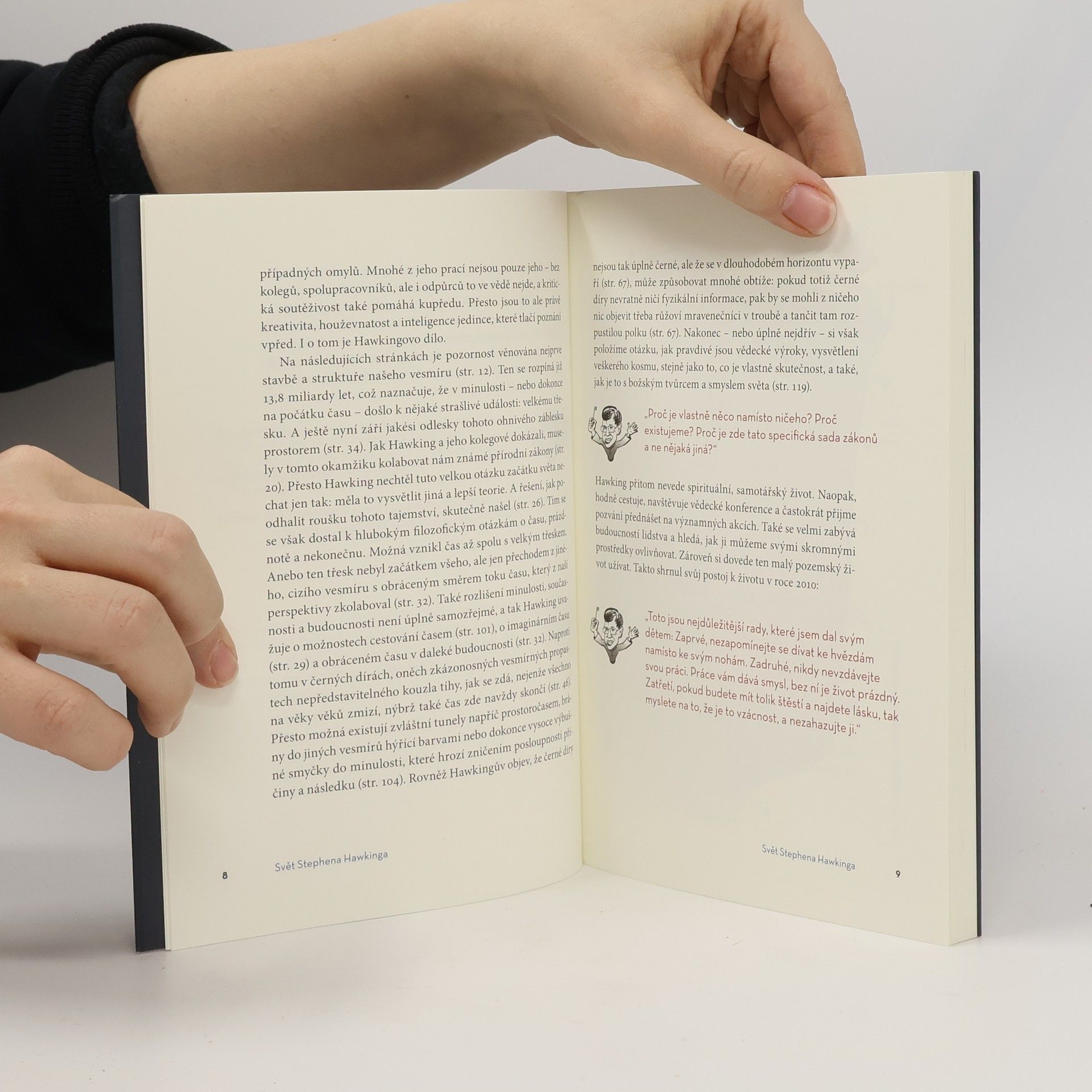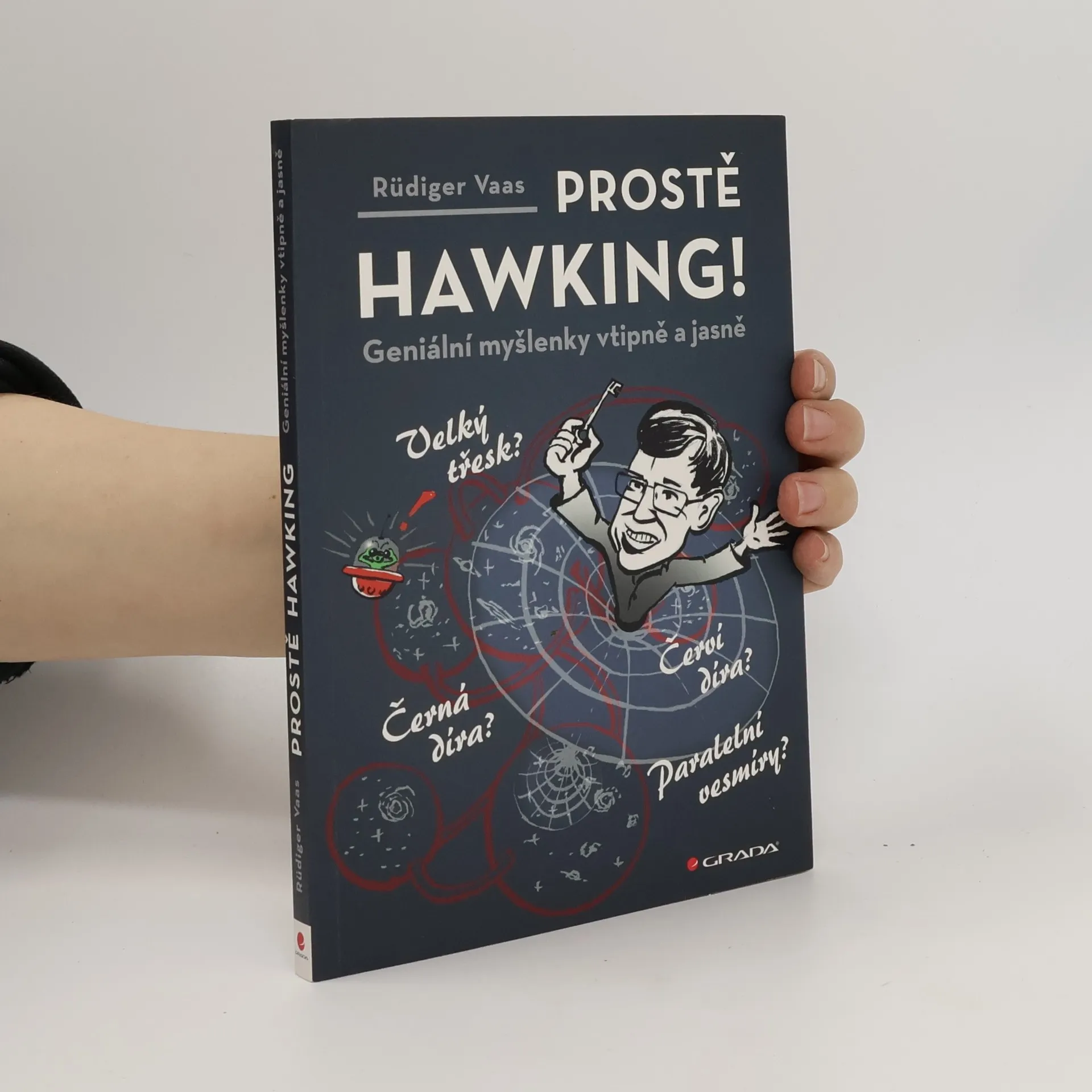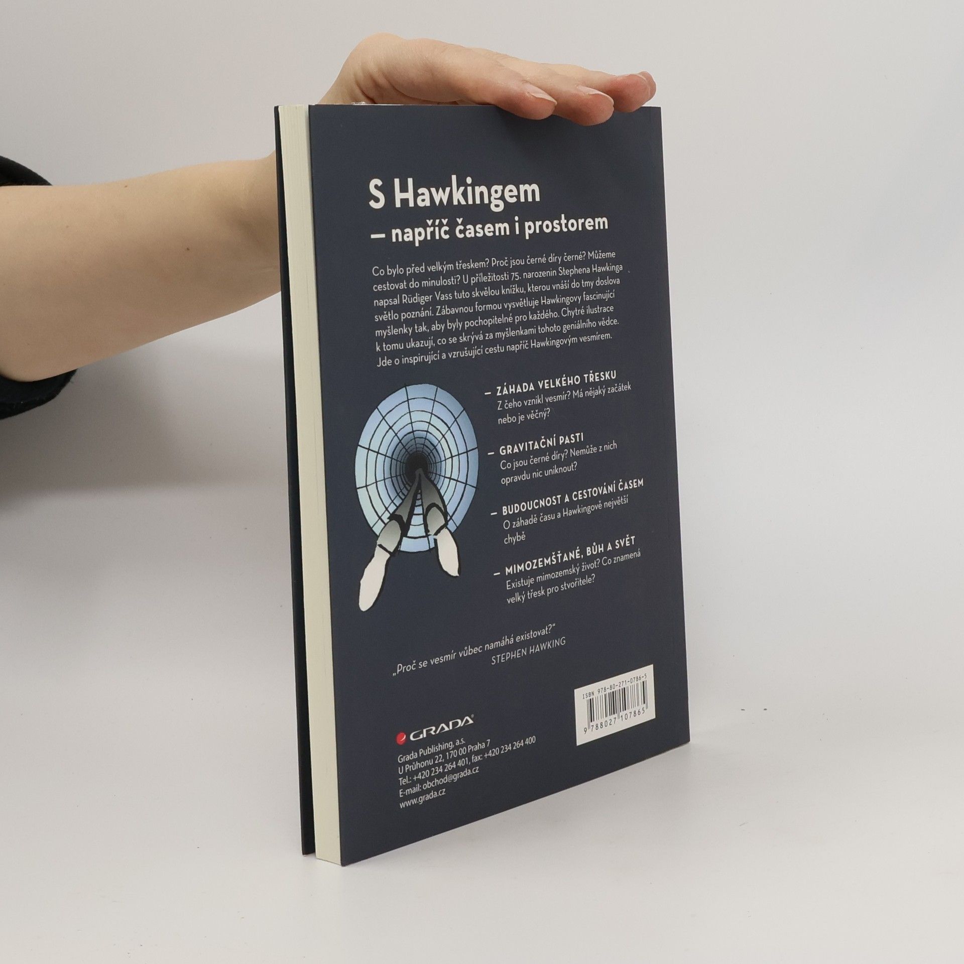 U příležitosti 75. narozenin geniálního a patrně nejznámějšího vědce současnosti Stephena Hawkinga (bohužel zemřel 14. 3. 2018, tedy mezi vydáním originálu této knihy a jejím českým překladem) napsal novinář a popularizátor přírodních věd Rüdiger Vaas tuto kouzelnou knížku, v níž s pomocí Hawkingových příhodných, mnohdy humorných komentářů přibližuje zvídavým čtenářům velká tajemství vědy. Jde o inspirující a vzrušující cestu Hawkingovým vesmírem, která si nijak nezadá se sci-fi. Autor srozumitelně vysvětluje fascinující Hawkingovy vědecké poznatky a domněnky, včetně jeho případných omylů, přičem se mu daří na stránkách poměrně útlé publikace v podstatě představit Hawkingovo životní dílo a jeho aktuální význam. Všechno je vysvětleno odlehčeným tónem a tak, aby nebyly třeba žádné předchozí znalosti. V krátkých textech tu defilují odpovědi, které se Hawking snažil najít na otázky, které lidstvo doprovázejí odnepaměti... Jak funguje vesmír a odkud se vlastně vzal? Co bylo před velkým třeskem? Jsou černé díry skutečně černé? A co se stane, když člověk do černé díry spadne? Lze cestovat časem? Má vesmír hranici? Může čas běžet pozpátku? Má čas nějaký počátek? atd. atd. Text doprovázejí kvízové otázky a výstižné, velmi vtipné barevné ilustrace.