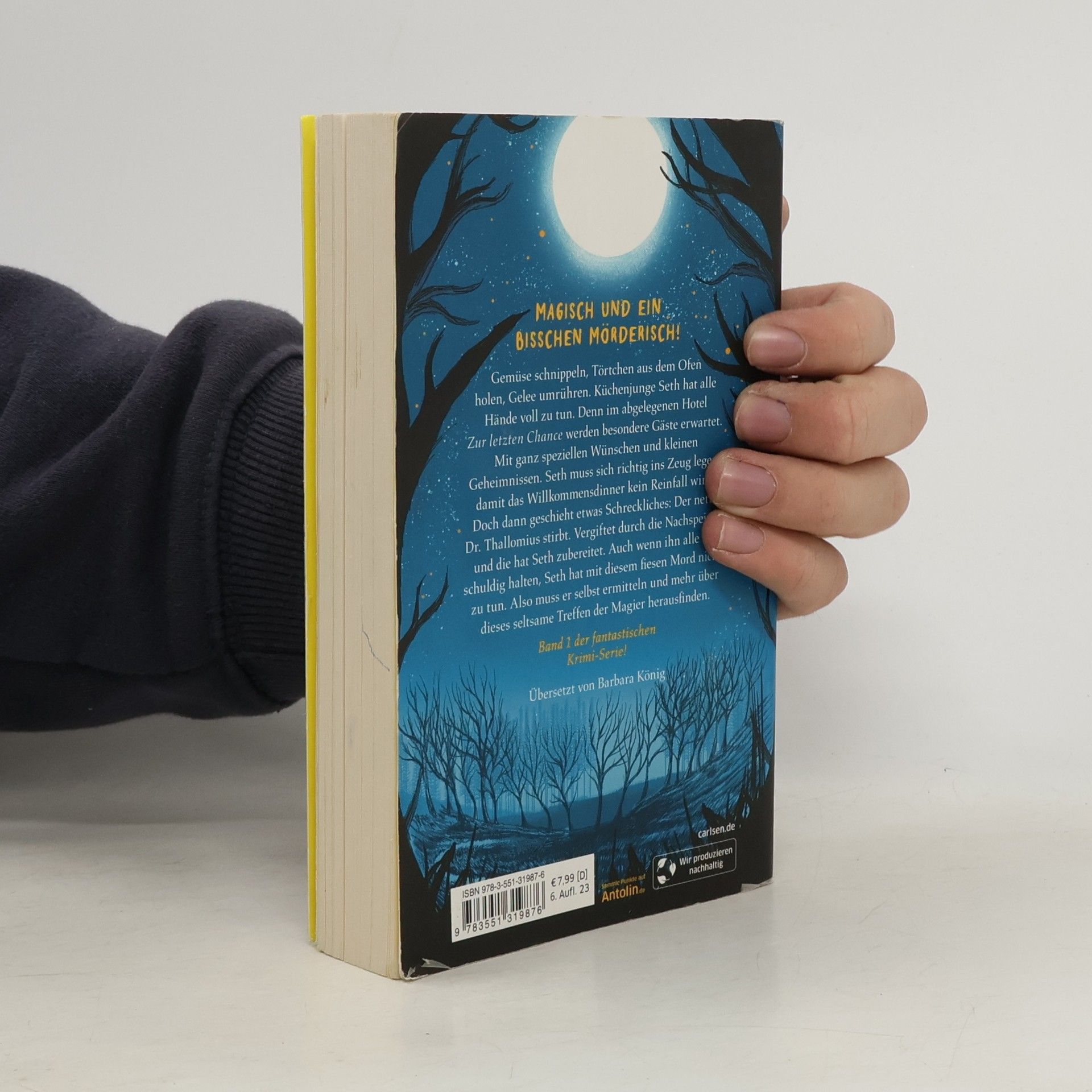 Magisch und ein bisschen mörderisch! Das perfekte Fantasy-Krimi-Abenteuer für Kinder ab 10 Jahren. Gemüse schnippeln, Törtchen aus dem Ofen holen, Gelee umrühren. Küchenjunge Seth hat alle Hände voll zu tun. Denn im abgelegenen Hotel Zur letzten Chance werden besondere Gäste erwartet. Mit ganz speziellen Wünschen und kleinen Geheimnissen. Seth muss sich richtig ins Zeug legen, damit das Willkommensdinner kein Reinfall wird. Doch dann geschieht etwas Schreckliches: Der nette Dr. Thallomius stirbt. Vergiftet durch die Nachspeise – und die hat Seth zubereitet. Auch wenn ihn alle für schuldig halten, Seth hat mit diesem fiesen Mord nichts zu tun. Also muss er selbst ermitteln und mehr über dieses seltsame Treffen der Magier herausfinden. Band 1: Hotel der Magier Band 2: Leuchtturm der Geister Band 3: Café der Lehrlinge