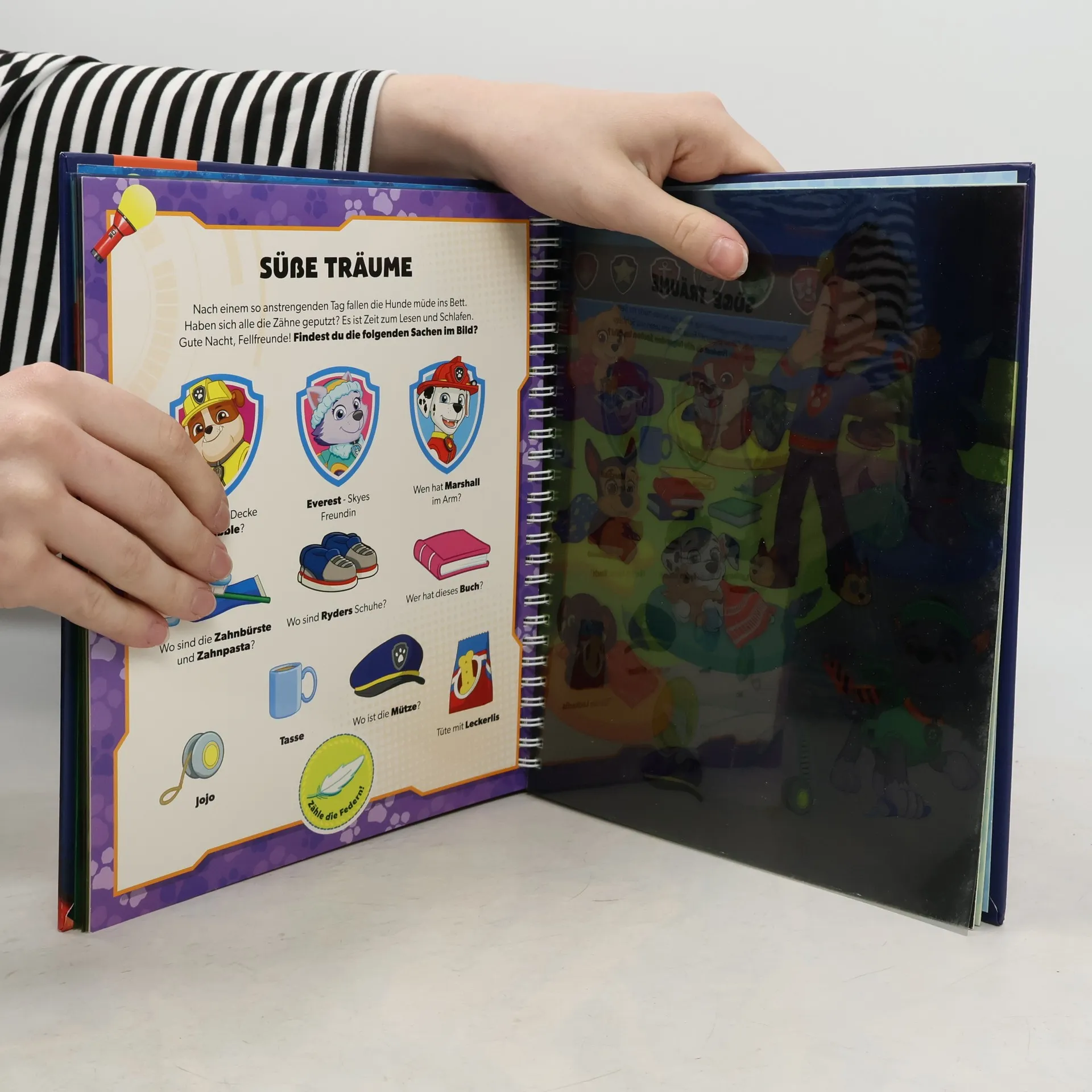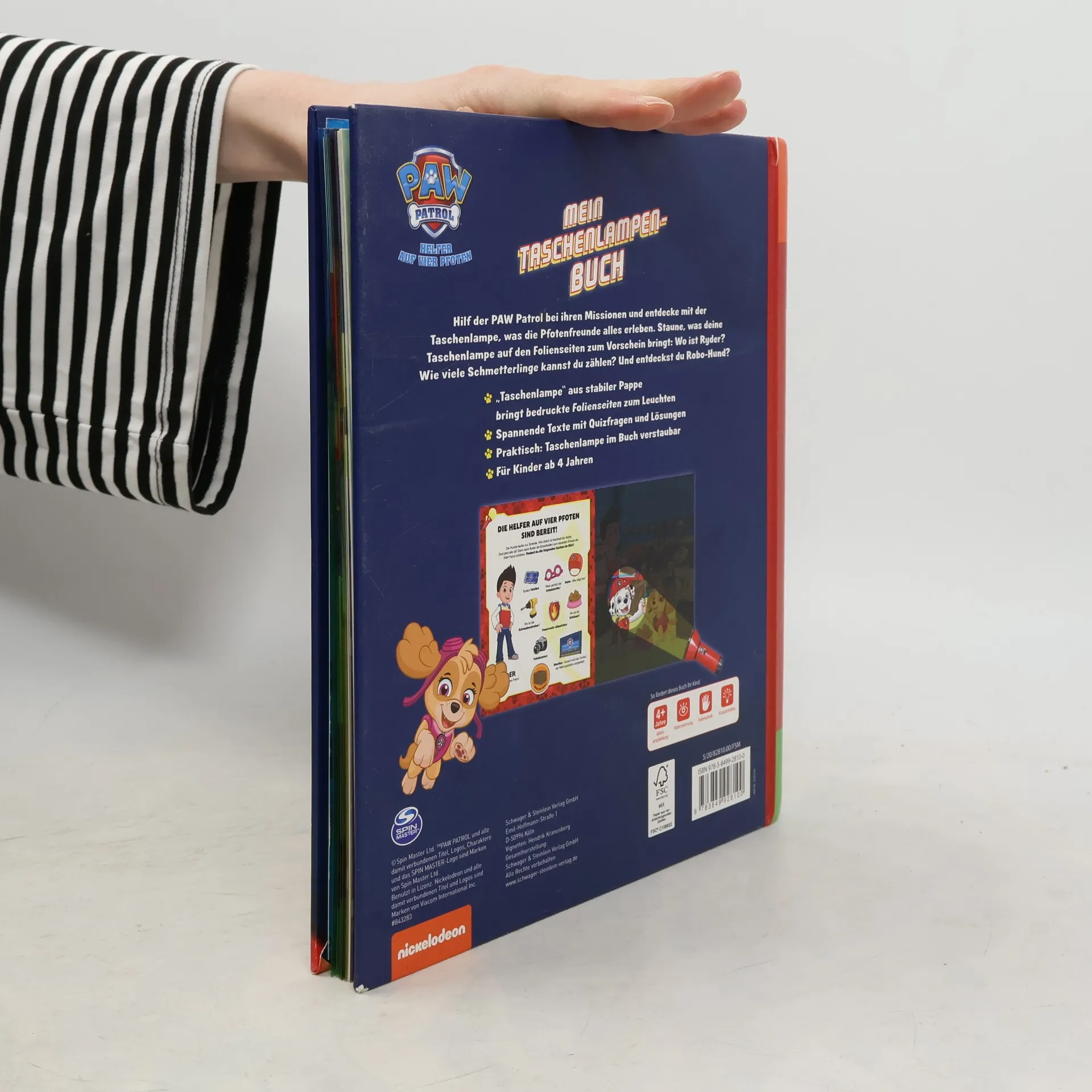 Mit PAW Patrol bunte Folienseiten zum Leuchten bringen und ihre Einsätze miterleben! Ein Muss für alle PAW Patrol-Fans Mitmachbuch zur beliebten Fernsehserie PAW Patrol Mit der stabilen Papp-Taschenlampe die Einsätze der PAW Patrol entdecken Bäuerin Yumi braucht Hilfe auf dem Bauernhof! Und was ist am Strand passiert? Die PAW Patrol ist bereit für ihre nächsten Pfotenmissionen! Begleite Chase und die Fellfreunde auf ihren Abenteuern und entdecke Ryder, Robo-Hund oder das Feuerwehrfahrzeug auf den bunten Folienseiten. Auf jeder Seite sind kleine Texte und viele Suchaufgaben. So macht das Entdecken auf den Folienseiten mit der Taschenlampe aus Pappe noch mehr Spaß! Wo ist der Gänseschwarm? Wie viele Schmetterlinge sind im Bild? Und was hat Everest gefunden? Ein spannendes Quiz am Ende testet das Wissen über die PAW Patrol. Auf den detailreichen, bunten Mitmachseiten gibt es für Kinder ab 4 Jahren viel zu entdecken, das fördert die Wahrnehmung, Feinmotorik und Konzentration! Die stabile Taschenlampe ist ganz einfach für ihren nächsten Einsatz mit der PAW Patrol im Buch verstaubar.