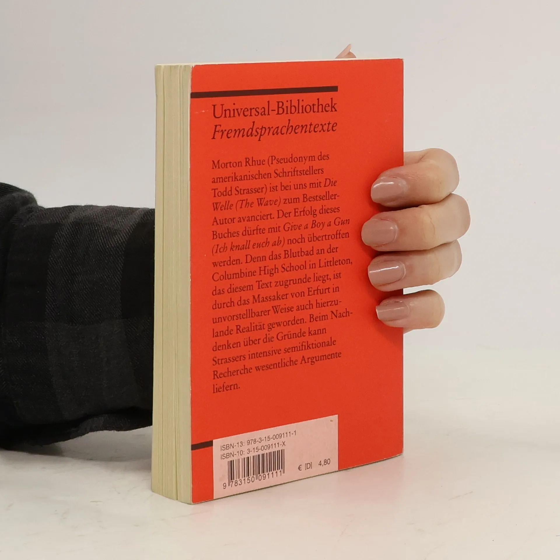 Englische Literatur in Reclams Roter Reihe: das ist der englische Originaltext – ungekürzt und unbearbeitet mit Worterklärungen am Fuß jeder Seite, Nachwort und Literaturhinweisen. Morton Rhue (Pseudonym des amerikanischen Schriftstellers Todd Strasser) ist bei uns mit »Die Welle« (»The Wave«) zum Bestseller-Autor avanciert. Der Erfolg dieses Buches dürfte mit »Give a Boy a Gun« (»Ich knall euch ab!«) noch übertroffen werden. Denn das Blutbad an der Columbine High School in Littleton, das diesem Text zugrunde liegt, ist durch die Massaker von Erfurt und Winnenden in unvorstellbarer Weise auch hierzulande Realität geworden. Beim Nachdenken über die Gründe kann Strassers intensive semifiktionale Recherche wesentliche Argumente liefern. Englische Lektüre: Niveau B2 (GER) Sprachen: Englisch, Deutsch