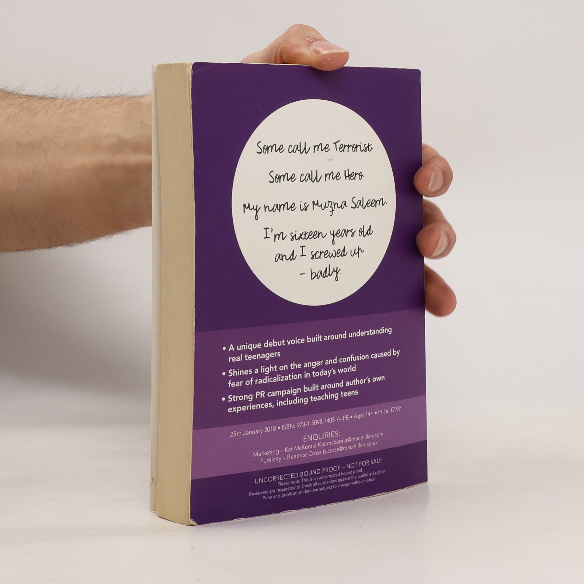 "Fifteen-year-old Muzna Saleem is passionate about writing and dreams of becoming a novelist. There's just one problem - her super-controlling parents have already planned her life out for her: Step 1) Get educated Step 2) Qualify as a doctor Step 3) Marry a cousin from Pakistan. Oh, and boyfriends are totally haram. No one is more surprised than humble Muzna when high school hottie, Arif Malik, takes an interest in her. But Arif and his brother are angry at the West for demonizing Islam and hiding a terrible secret. As Arif begins to lead Muzna down a dark path, she faces a terrible choice: keep quiet and betray her beliefs, or speak up and betray her heart?"--Provided by publisher.