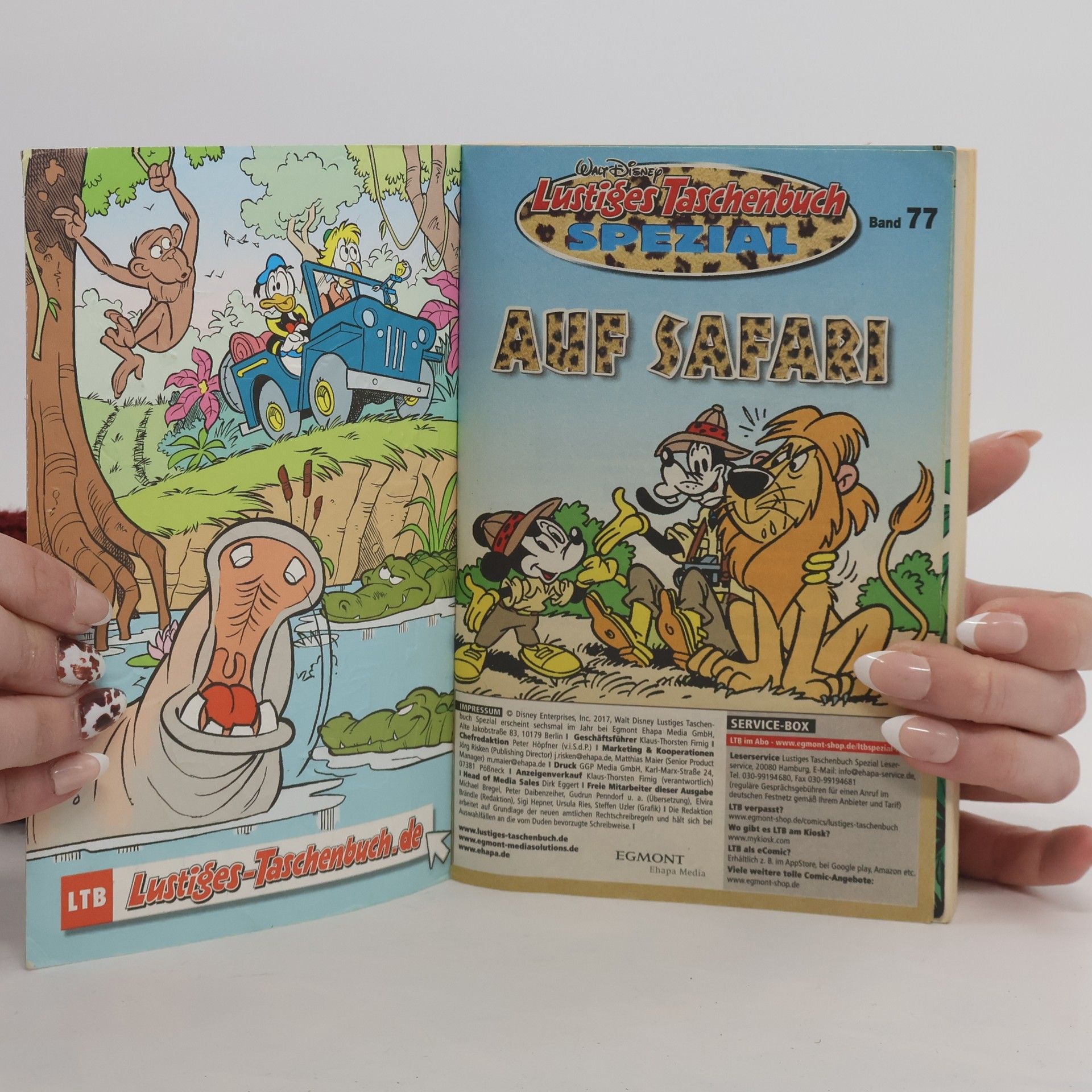 Entenstarke Safari! In der Savanne sind die Enten los! Namentlich Donald, Dussel und Gustav, die im Auftrag von Dagobert Duck auf Safari geschickt werden, um seiner Realitydoku zu höheren Einschaltquoten zu verhelfen. Das Ziel der Safari ist es, das sagenumwobene Weiße Krokodil in den Gorogorosümpfen zu finden. Ob das ungleiche Team jedoch die Fährte des legendären Reptils aufnehmen kann bleibt mehr als fraglich. Unterdessen sind Micky und Goofy mit einer Spurensuche der ganz anderen Art beschäftigt. Die Wollhornnashörner im Reservat in Nordafrika werden von Wilderen bedroht und Kommissar Hunter und Professor Khaki bitten das Ermittler-Duo um Hilfe. Die Verbrecherjagd gestaltet sich jedoch als schwierig, da es bisher keinerlei Hinweise auf die Identität, oder den Verbleib der Trophäenjäger gibt. Ob Micky und Goofy das Rätsel um die mysteriösen Wilderer lösen können und welche weiteren spannenden Expeditionen auf Sie warten, dass lesen Sie am besten selbst, im neuen LTB Spezial Nr. 77!