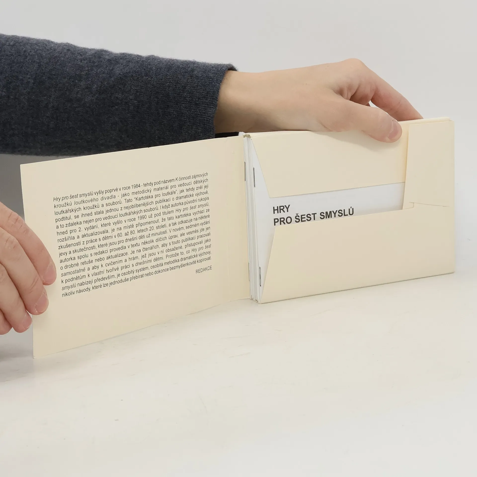 Kartotéka pro loutkáře i neloutkáře, kteří si umějí hrát s dětmi Už 10. vydání stále žádané příručky, která patří k nejoblíbenějším metodikám mezi těmi, kdo učí dramatickou výchovu nebo využívají některých jejích postupů při práci s předškolními i školními dětmi, i pro ty, kdo vedou dětské divadelní a loutkářské soubory. Hry a cvičení s různými variantami a možnosti různých motivací jsou uváděny přehledně na kartotéčních lístcích a jsou uspořádány do těchto okruhů: Pozornost, paměť a představivost, Jevištní řeč, Fantazie a tvořivost, Hry a etudy. Cennou součástí kartotéky jsou úvodní Metodické poznámky k práci s kartotékou s odkazy na další literaturu.