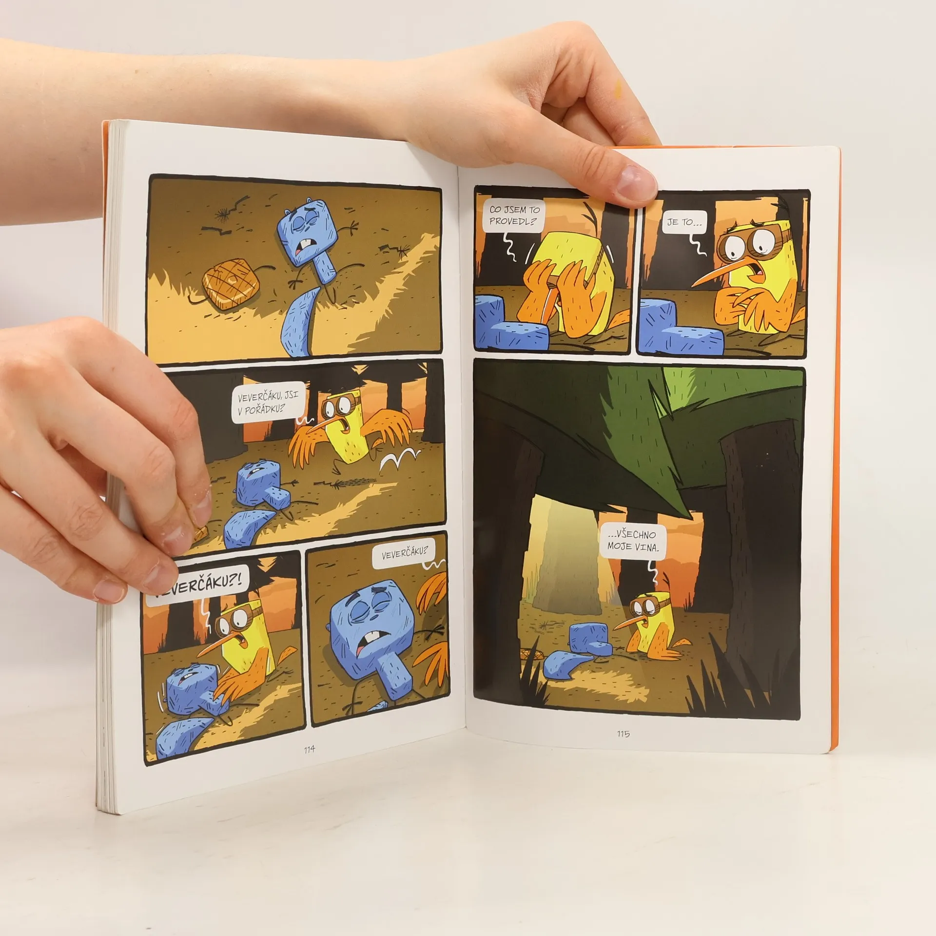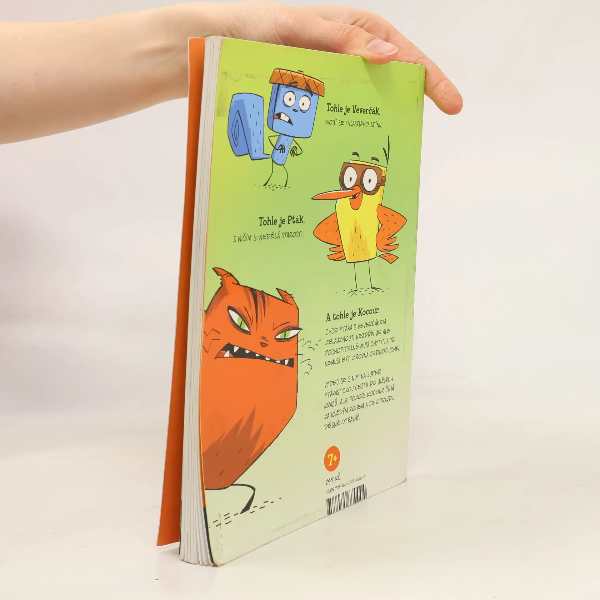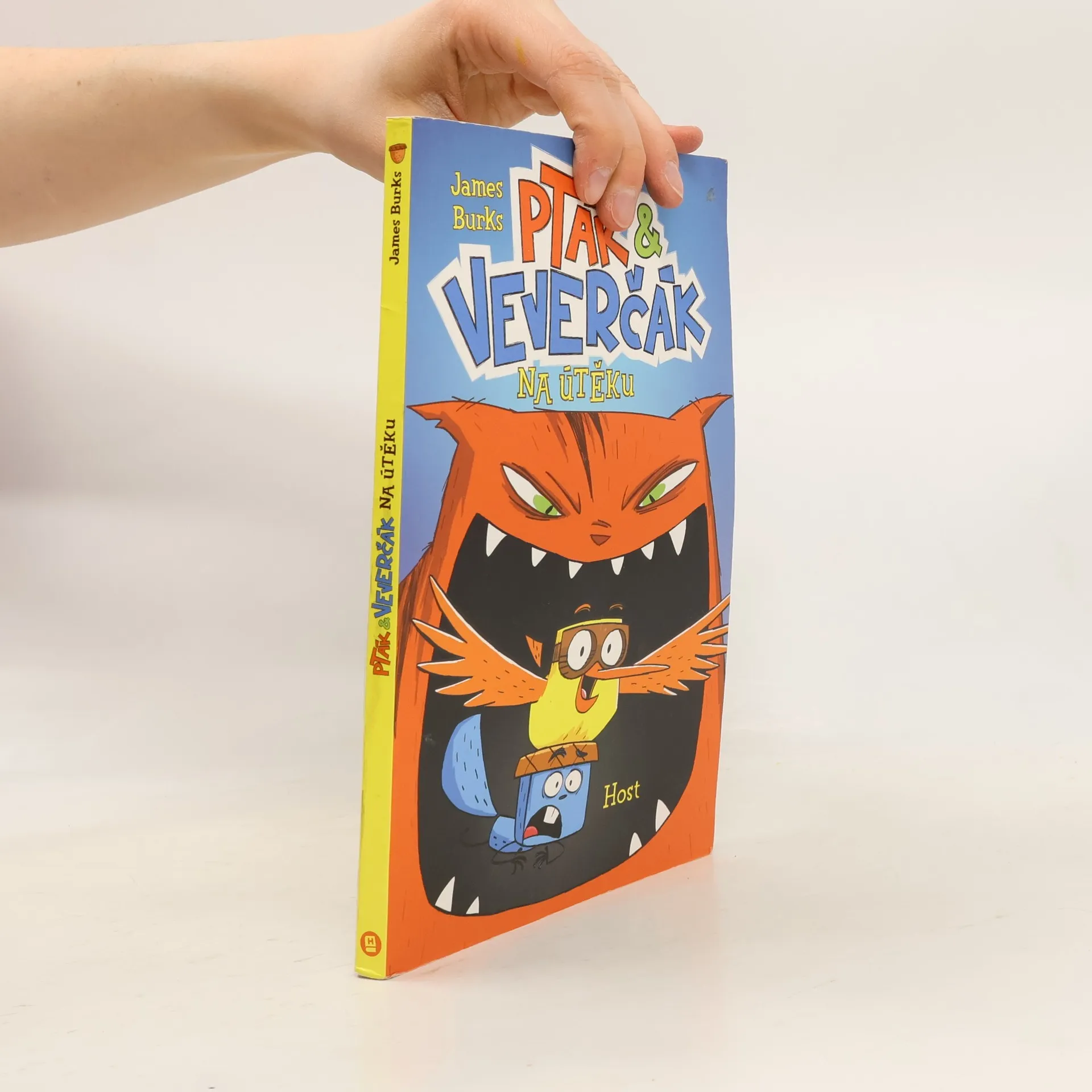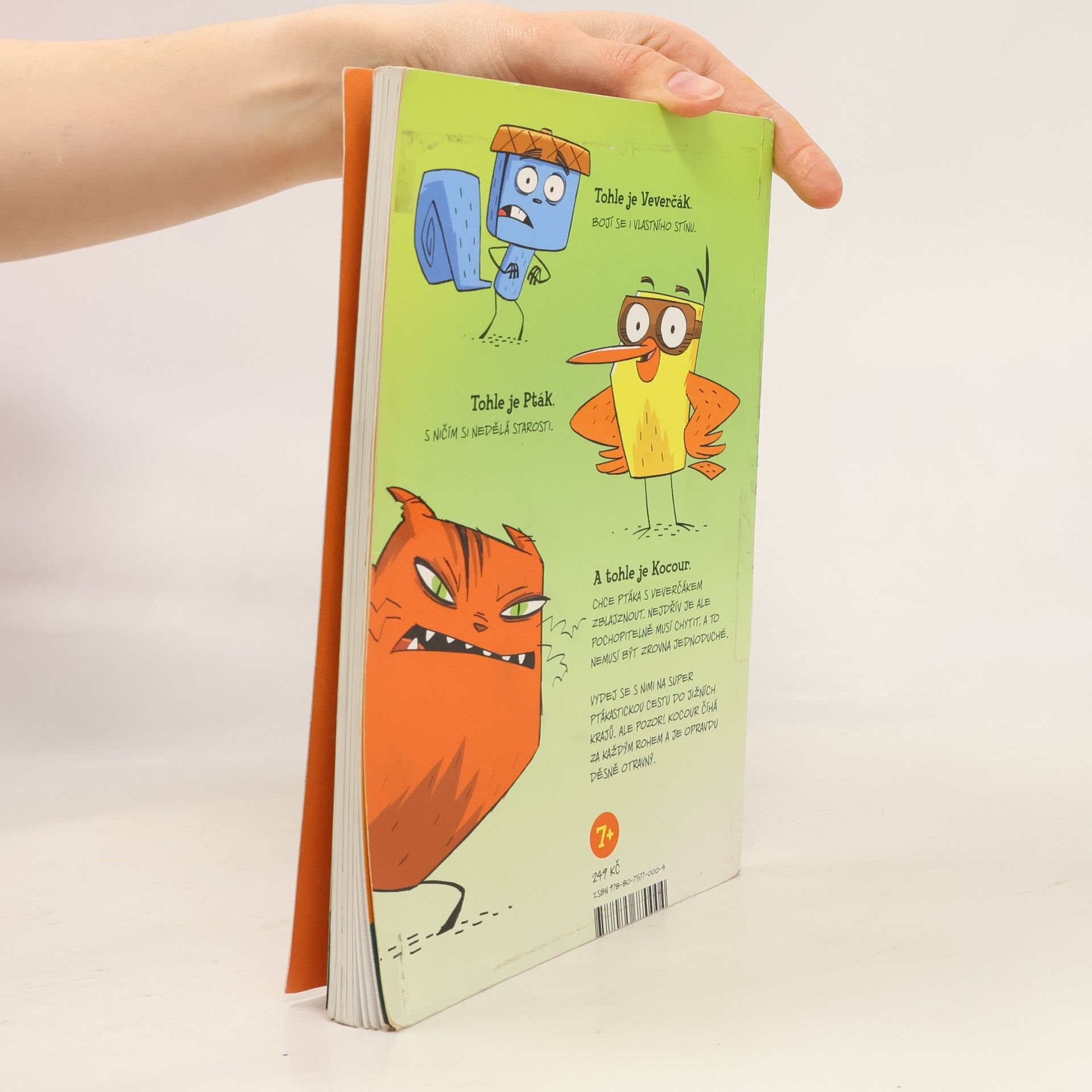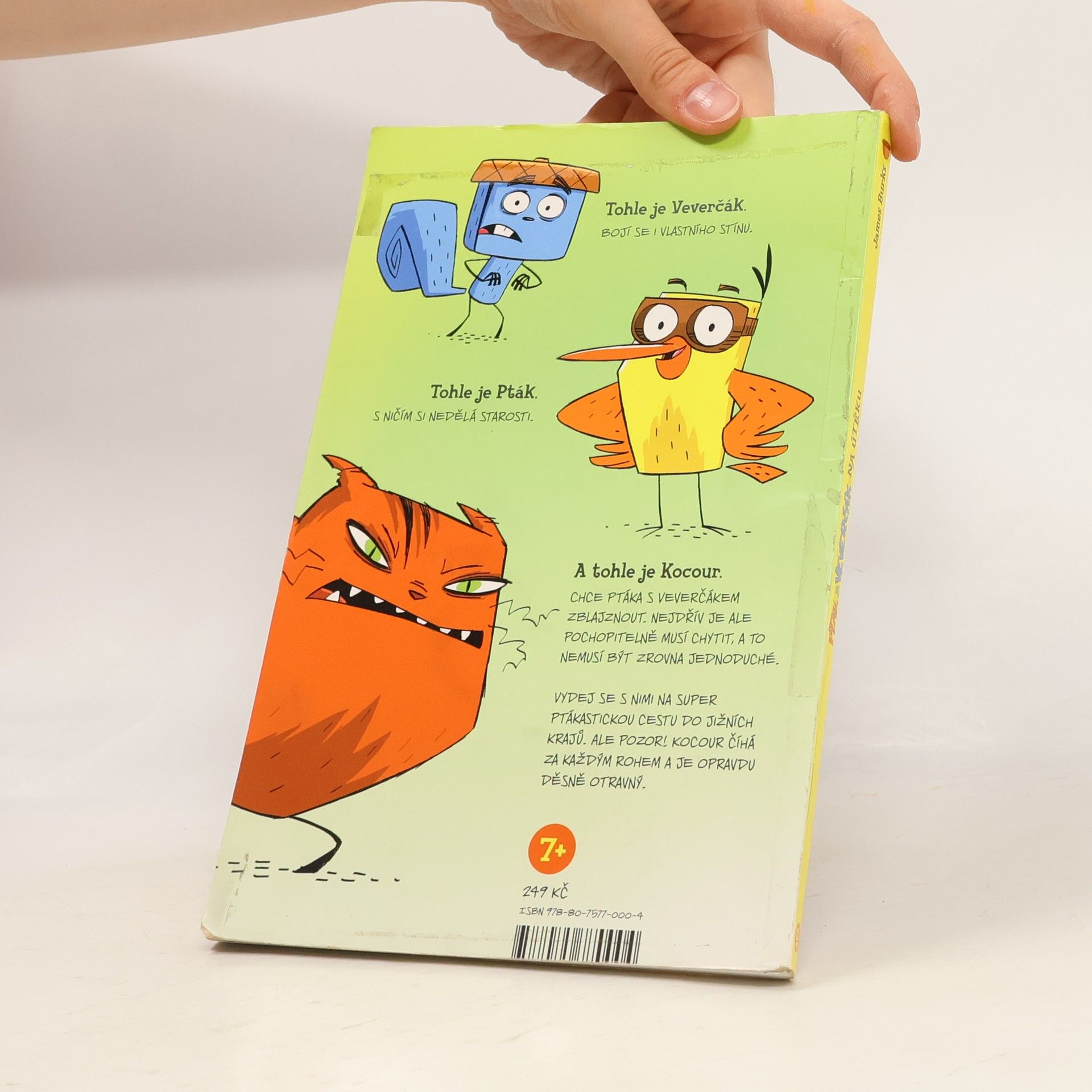 Dva přátelé utíkají o život ve vtipném komiksu plném akce. Na jedné straně ukecaný, bláznivý a bezstarostný Pták, co lítá z průšvihu do průšvihu a je mu to fuk. Vždycky totiž nějak vyvázne. Na druhé straně úzkostný, věčně ustaraný a ustrašený Veverčák, který nikdy nebyl dál než na sousední pasece a za žádnou, žádnou cenu nechce mít nic společného s někým tak nerozvážným, jako je Pták. Co tuhle naprosto nepravděpodobnou dvojici svede dohromady a udělá z nich nejlepší přátele? Kocour! Tlustý, vzteklý kocour, který je chce oba sežrat. Jenže nejdřív je musí chytit. A to, jak se ukáže, nebude tak jednoduché. Vydejte se s nimi na výjimečně zábavnou cestu do jižních krajů. Ale pozor! Kocour číhá za každým rohem a je to vážně hrozná potvora. Zkušený vypravěč komiksových příběhů James Burks rozehrává hotový akční film, který čtenáře okamžitě vtáhne do děje. Zářivé barvy, napínavý příběh, vtipné dialogy a komiksové bubliny. Jestli tohle nepřivede vaše děti ke čtení, tak už nic!