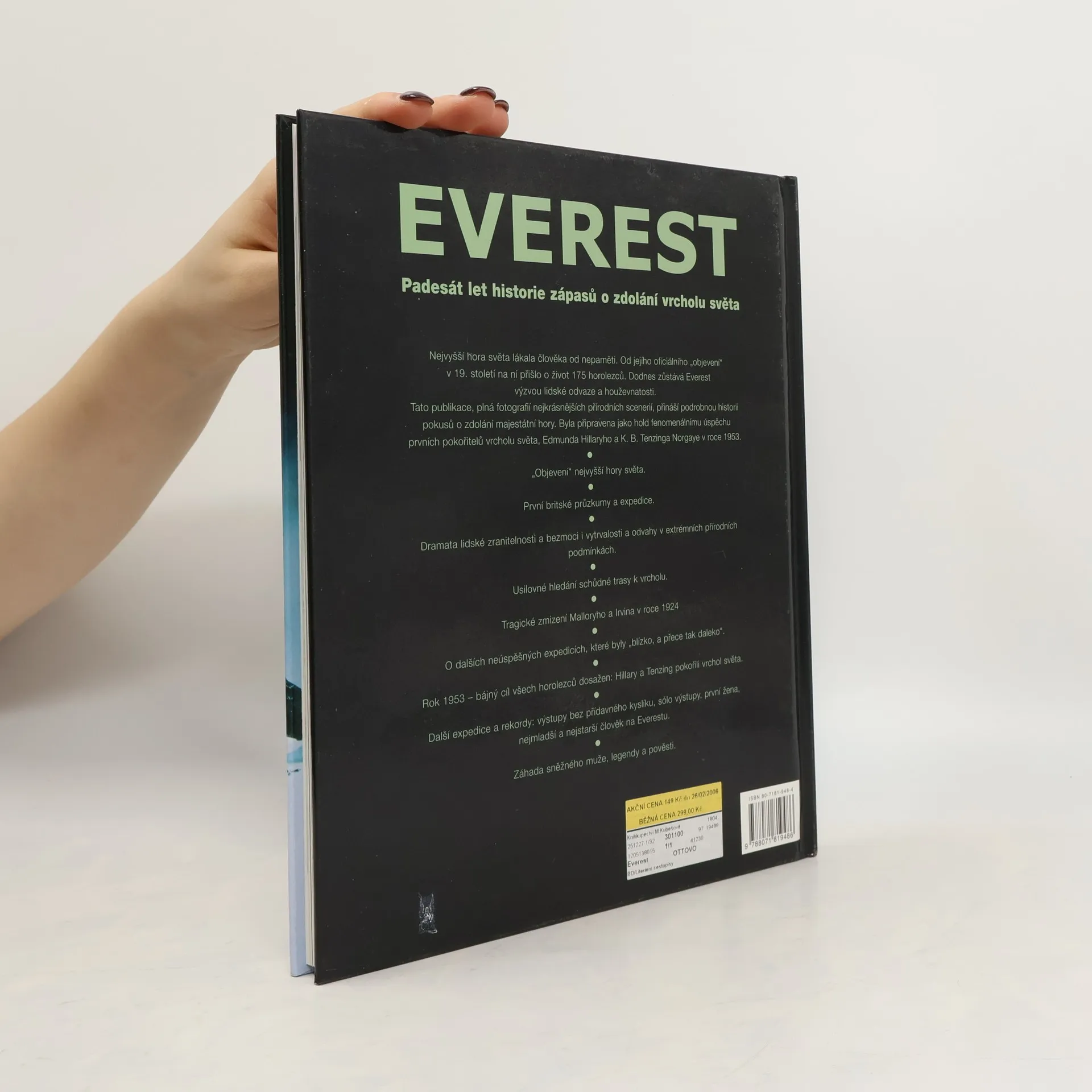Nejvyšší hora světa lákala člověka od nepaměti. Od jejího oficiálního „objevení“ v 19. století na ní přišlo o život 175 horolezců. Dodnes zůstává Everest výzvou lidské odvaze a houževnatosti. Tato publikace, plná fotografií nejkrásnějších přírodních scenérií, přináší podrobnou historii pokusů o zdolání majestátní hory. Byla připravena jako hold fenomenálnímu úspěchu prvních pokořitelů vrcholu světa, Edmunda Hillaryho a K. B. Tenzinga Nowgaye v roce 1953.