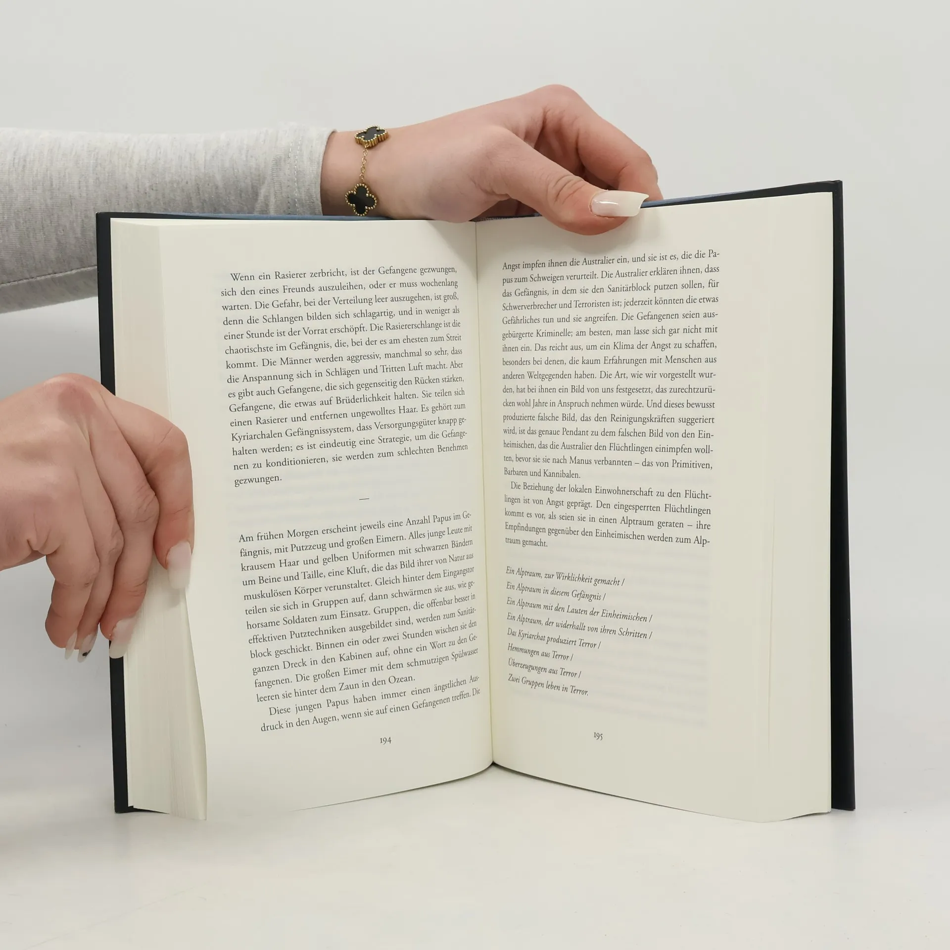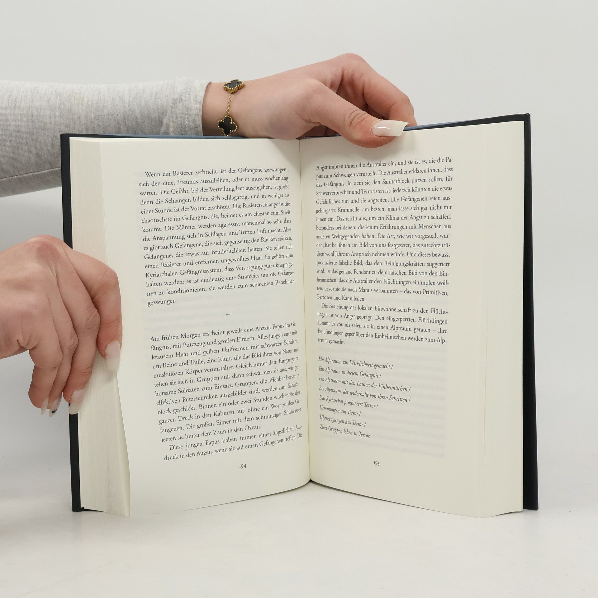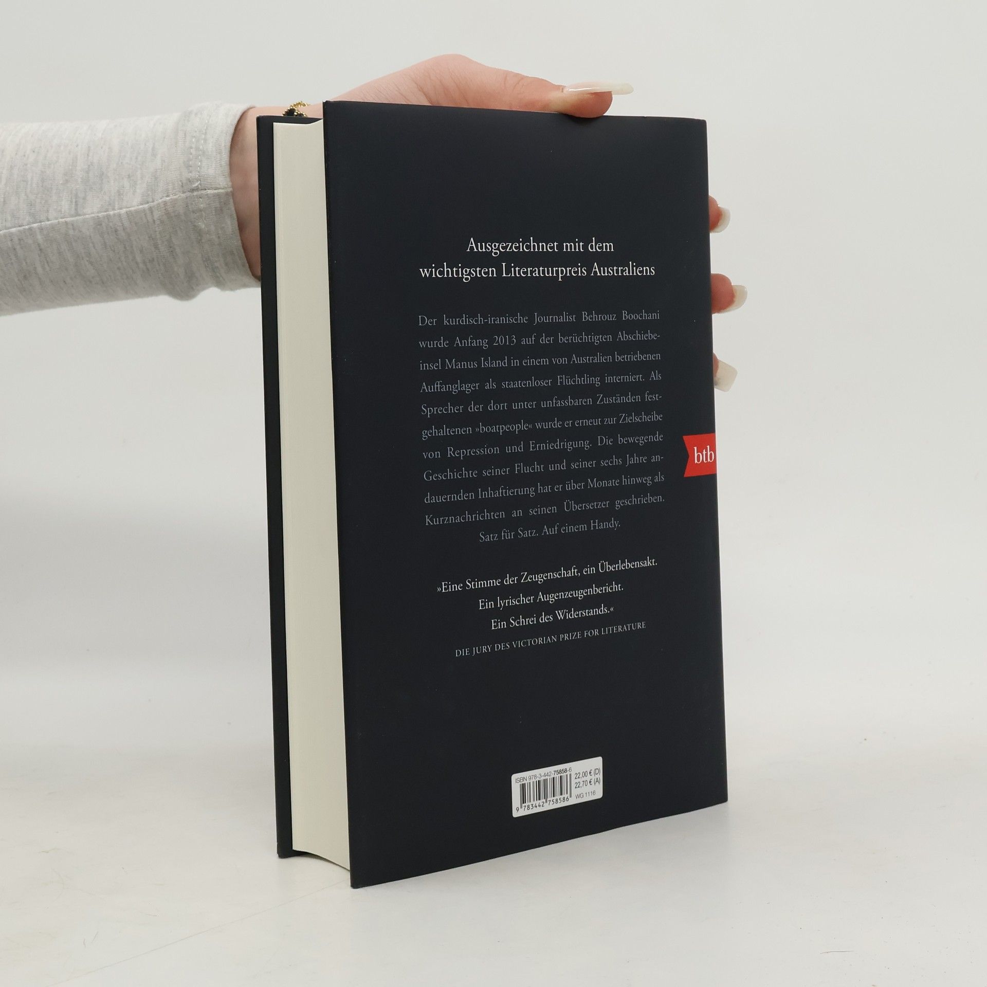 »Die zornige Stimme der Internierten« – Süddeutsche Zeitung Der kurdisch-iranische Journalist Behrouz Boochani wurde Anfang 2013 auf der berüchtigten Abschiebeinsel Manus Island in einem von Australien betriebenen Auffanglager als staatenloser Flüchtling interniert. Bald wurde er als Sprecher der unter unfassbaren Zuständen festgehaltenen »Boatpeople« erneut zur Zielscheibe von Repression und Erniedrigung. Die bewegende Geschichte seiner Flucht und seiner über sechs Jahre andauernden Inhaftierung hat er über Monate hinweg als Kurznachrichtengewitter an seinen Übersetzer geschrieben. Satz für Satz. Auf einem Handy. »Woher bin ich gekommen? Aus dem Land der Flüsse, dem Land der Wasserfälle, dem Land der uralten Gesänge, dem Land der Berge [...]. Die Leute rannten in die Berge, um den Kriegsflugzeugen zu entkommen, und sie fanden Asyl in ihren Walnusswäldern [...]. Haben Kurden noch irgendwelche anderen Freunde, außer den Bergen?«