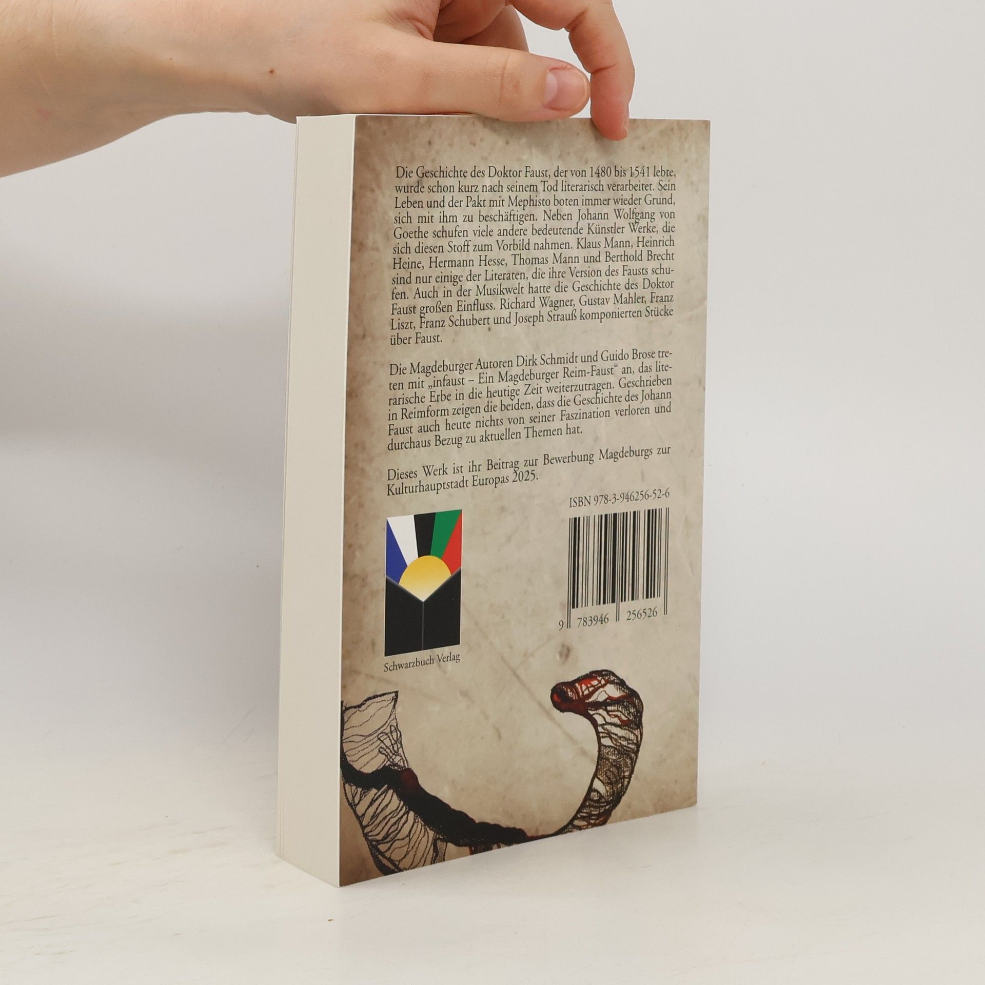 Die Geschichte des Dr. Faust, der von 1480 bis 1541 lebte, wurde schon kurz nach seinem Tod literarisch verarbeitet. Sein Leben und der Pakt mit Mephisto boten immer wieder Grund, sich mit ihm zu beschäftigen. Neben Johann Wolfgang von Goethe schufen viele andere bedeutende Künstler Werke, die sich diesen Stoff zum Vorbild nahmen. Klaus Mann, Heinrich Heine, Hermann Hesse, Thomas Mann und Berthold Brecht sind nur einige der Literaten, die ihre Version des Fausts schufen. Auch in der Musikwelt hatte die Geschichte des Dr. Faust großen Einfluss. Richard Wagner, Gustav Mahler, Franz Liszt, Franz Schubert und Joseph Strauß komponierten Stücke über Faust. Die Magdeburger Autoren Dirk Schmidt und Guido Brose treten mit "infaust – Ein Magdeburger Reim-Faust" an, dass literarische Erbe in die heutige Zeit weiter zu tragen. Geschrieben in Reimform zeigen die Beiden, dass die Geschichte des Johann Faust auch heute noch nichts von seiner Faszination verloren und durchaus Bezug zu aktuellen Themen hat. Dieses Werk ist ihr Beitrag zur Bewerbung Magdeburgs zur Kulturhauptstadt Europas 2025.