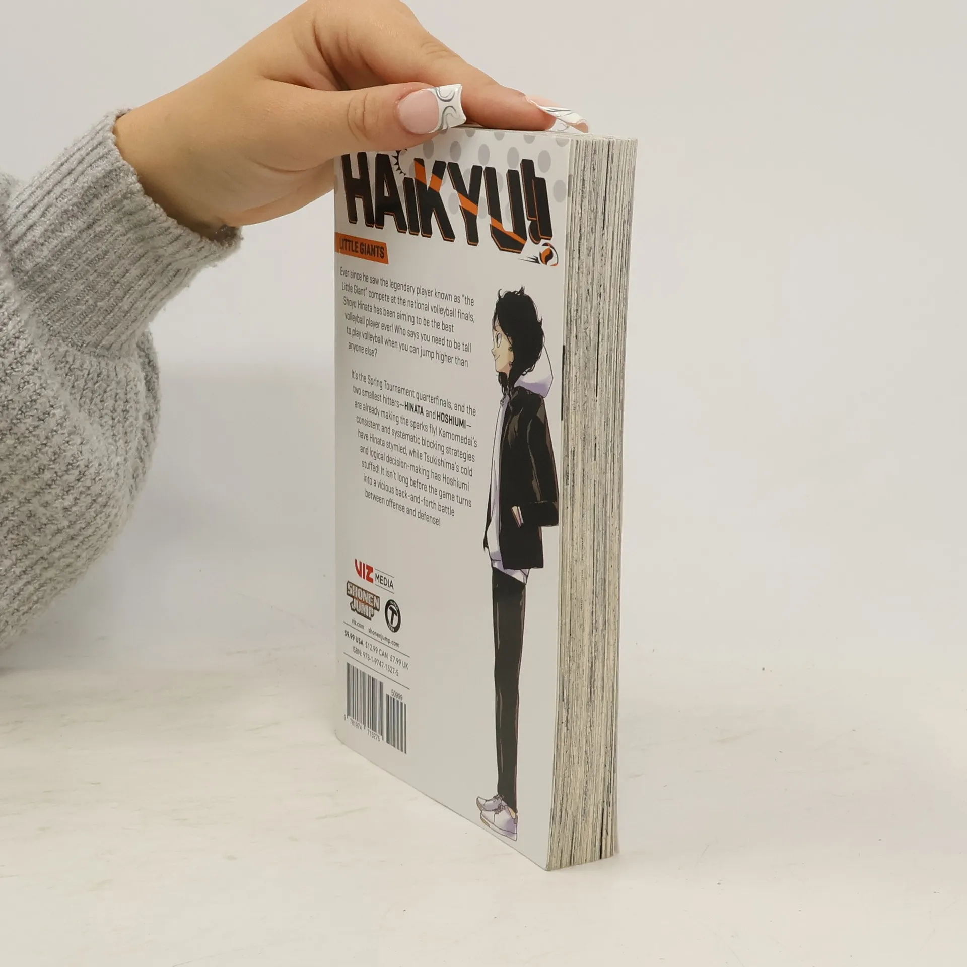 Shoyo Hinata is out to prove that in volleyball you don't need to be tall to fly!Ever since he saw the legendary player known as the Little Giant compete at the national volleyball finals, Shoyo Hinata has been aiming to be the best volleyball player ever! Who says you need to be tall to play volleyball when you can jump higher than anyone else?It's the Spring Tournament quarterfinals, and the two smallest hitters-Hinata and Hoshiumi-are already making the sparks fly! Kamomedai's consistent and systematic blocking strategies have Hinata stymied, while Tsukishima's cold and logical decision-making has Hoshiumi stuffed! It isn't long before the game turns into a vicious back-and-forth battle between offense and defense!