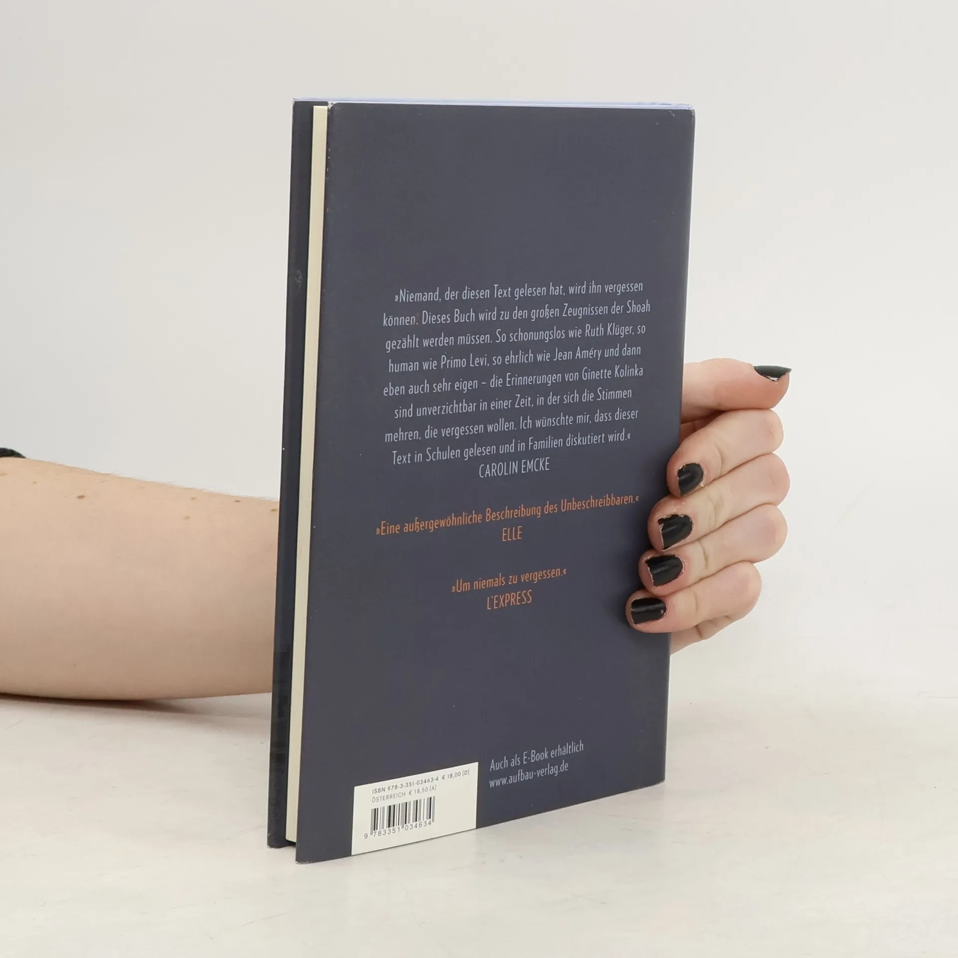 “Niemand, der diesen Text gelesen hat, wird ihn vergessen können.“ Carolin Emcke Im März 1944 wird Ginette Kolinka zusammen mit ihrem Vater, ihrem Bruder und ihrem Neffen von Avignon nach Auschwitz-Birkenau deportiert. Ginette ist die Einzige, die Monate später nach Paris zurückkehrt. Sie schildert eindringlich, wie sie die Schläge, den Hunger, die Kälte, die Nacktheit, den Hass, das Grauen im Lager überlebt hat. Und sie erzählt, wie notwendig das Festhalten an der Weiblichkeit für sie war. Ein Kleid, das Simone Veil ihr im Lager schenkte, gab ihr Würde und Kraft zum Überleben. Ginette Kolinka hat lange geschwiegen und ihre Geschichte zum ersten Mal erzählt, als Steven Spielberg Zeitzeugen für "Schindlers Liste" suchte. Heute führt sie regelmäßig Schulklassen durch Auschwitz. Sie ist 94 Jahre alt und lebt in Paris. „Eine außergewöhnliche Beschreibung des Unbeschreibbaren." Le Monde