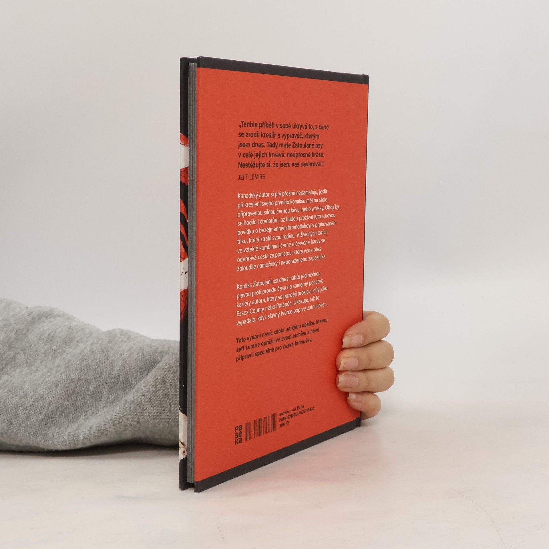 Kanadský autor Jeff Lemire si prý přesně nepamatuje, jestli při kreslení svého prvního komiksu měl na stole připravenou silnou černou kávu, nebo whisky. Obojí by se hodilo i čtenářům, až budou prožívat tuto surovou povídku o bezejmenném hromotlukovi v pruhovaném triku, který ztratil svou rodinu. V živelných tazích, ve vzteklé kombinaci červené a černé barvy se odehrává cesta za pomstou, která vede přes zbloudilé námořníky i neporaženého zápasníka. Komisk Toulaví psi dnes nabízí jedinečnou plavbu proti proudu času na samotný začátek kariéry autora, který se později proslavil díly jako Essex Country nebo Potápěč. Ukazuje, jak to vypadalo, když slavný tvůrce poprvé zatnul pěsti.