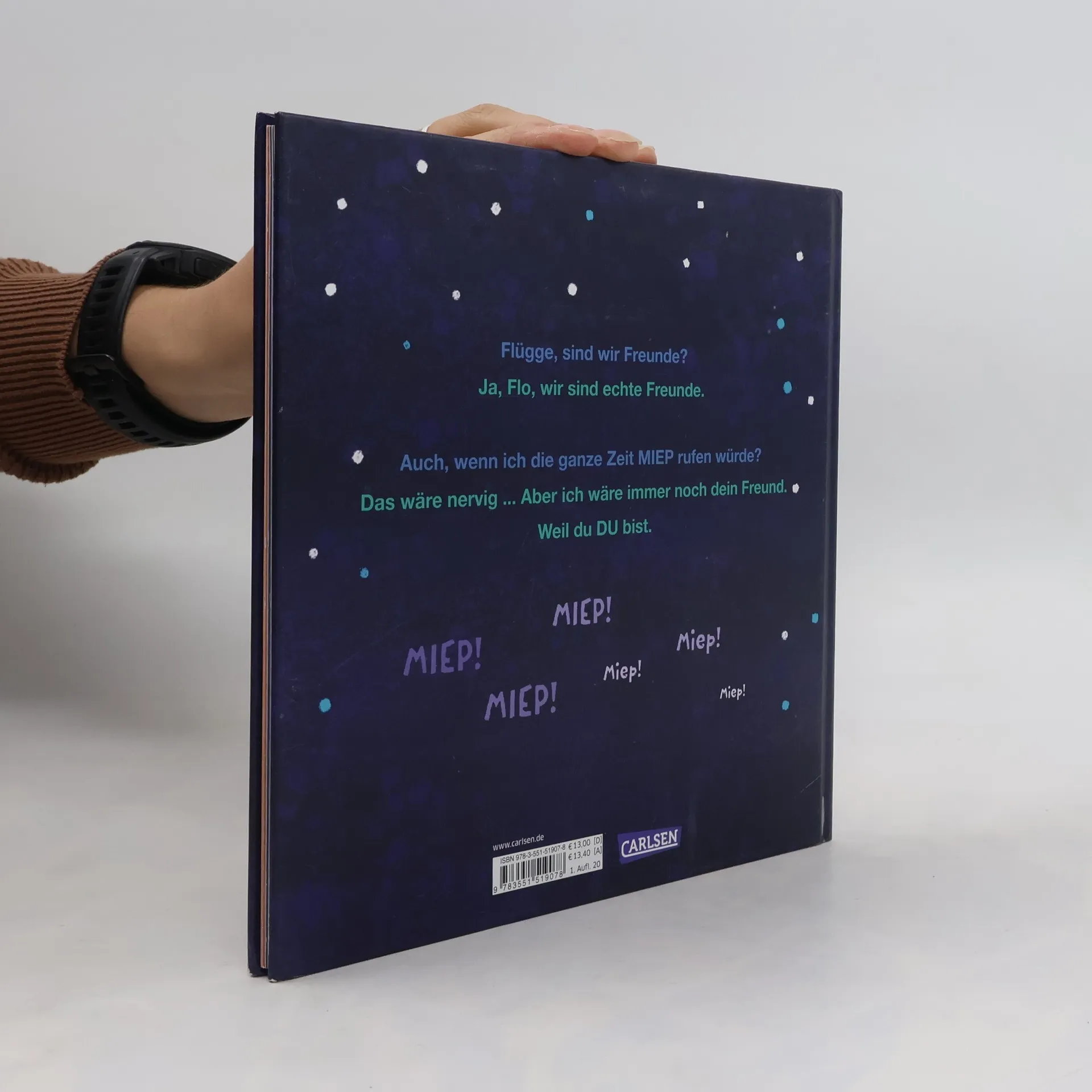 Die kleine Eule Flo gibt keine Ruhe und stellt unermüdlich Fragen. Die große Eule Flügge antwortet stets geduldig. „Flügge, hättest du mich auch lieb, wenn ich lila wäre?“ Das fände Flügge richtig lustig. Wenn er allerdings die ganze Zeit „Miep“ rufen würde, wäre das echt nervig, doch manchmal kann Flo sich einfach nicht zurückhalten: Miep! MIEP! Mmiiiiep! .... Aber was wäre denn, wenn Flo plötzlich weg wäre? Auf jeder Doppelseite hat die kleine Eule eine charmante Idee, um zu prüfen, ob Flügge sie wirklich richtig lieb hat.