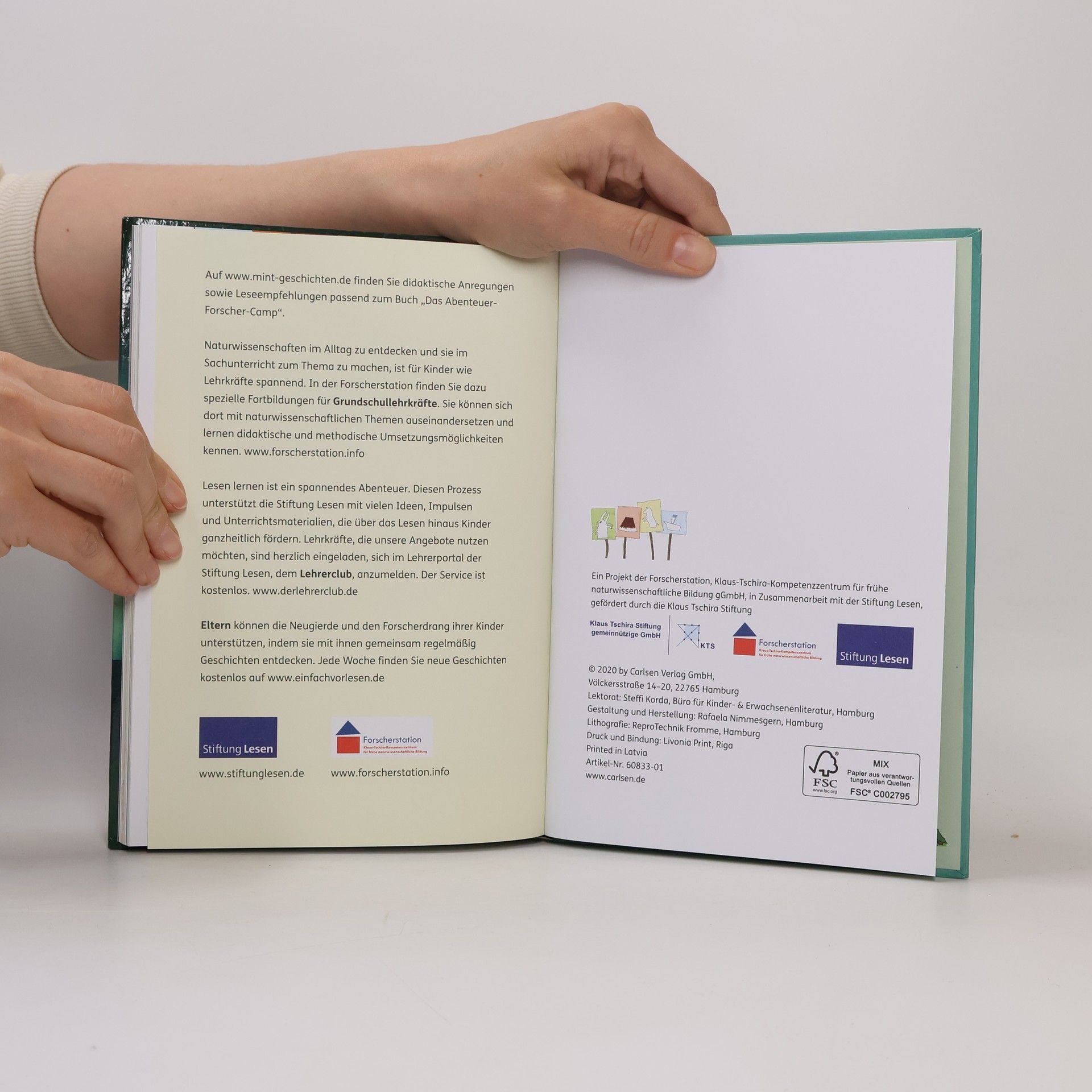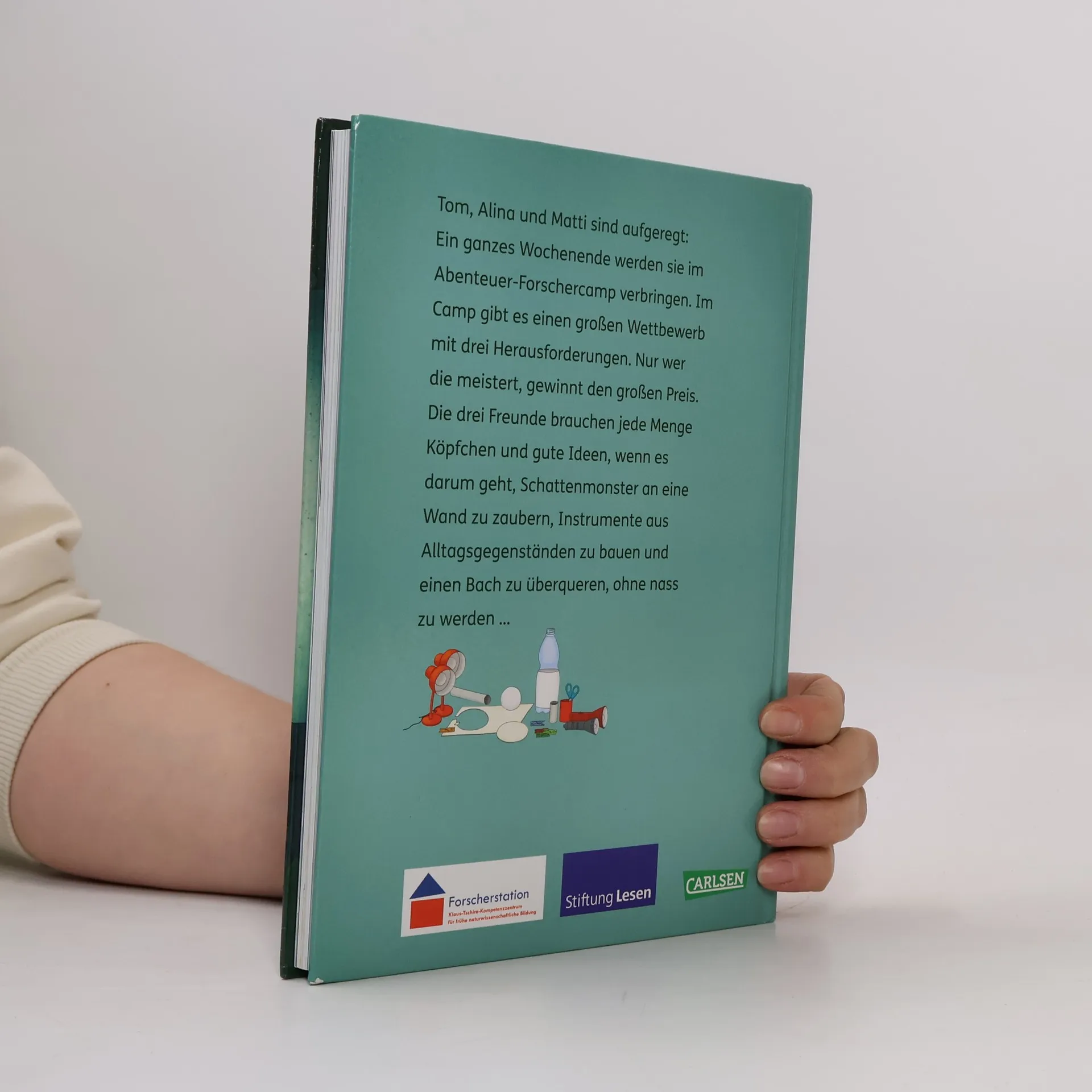 Tom, Alina und Matti sind aufgeregt: Ein ganzes Wochenende werden sie im Abenteuer-Forschercamp verbringen. Im Camp gibt es einen großen Wettbewerb mit drei Herausforderungen. Nur wer die meistert, gewinnt den großen Preis. Die drei Freunde brauchen jede Menge Köpfchen und gute Ideen, wenn darum geht, Schattenmonster an eine Wand zu zaubern, Instrumente aus Alltagsgegenständen zu bauen und einen Bach zu überqueren, ohne nass zu werden ... Ein Projekt der Forscherstation, Klaus-Tschira-Kompetenzzentrum für frühe naturwissenschaftliche BildunggGmbH In Zusammenarbeit mit der Stiftung Lesen Inhalte mit steigerndem Schwierigkeitsgrad Lesemotivation durch spannende Inhalte