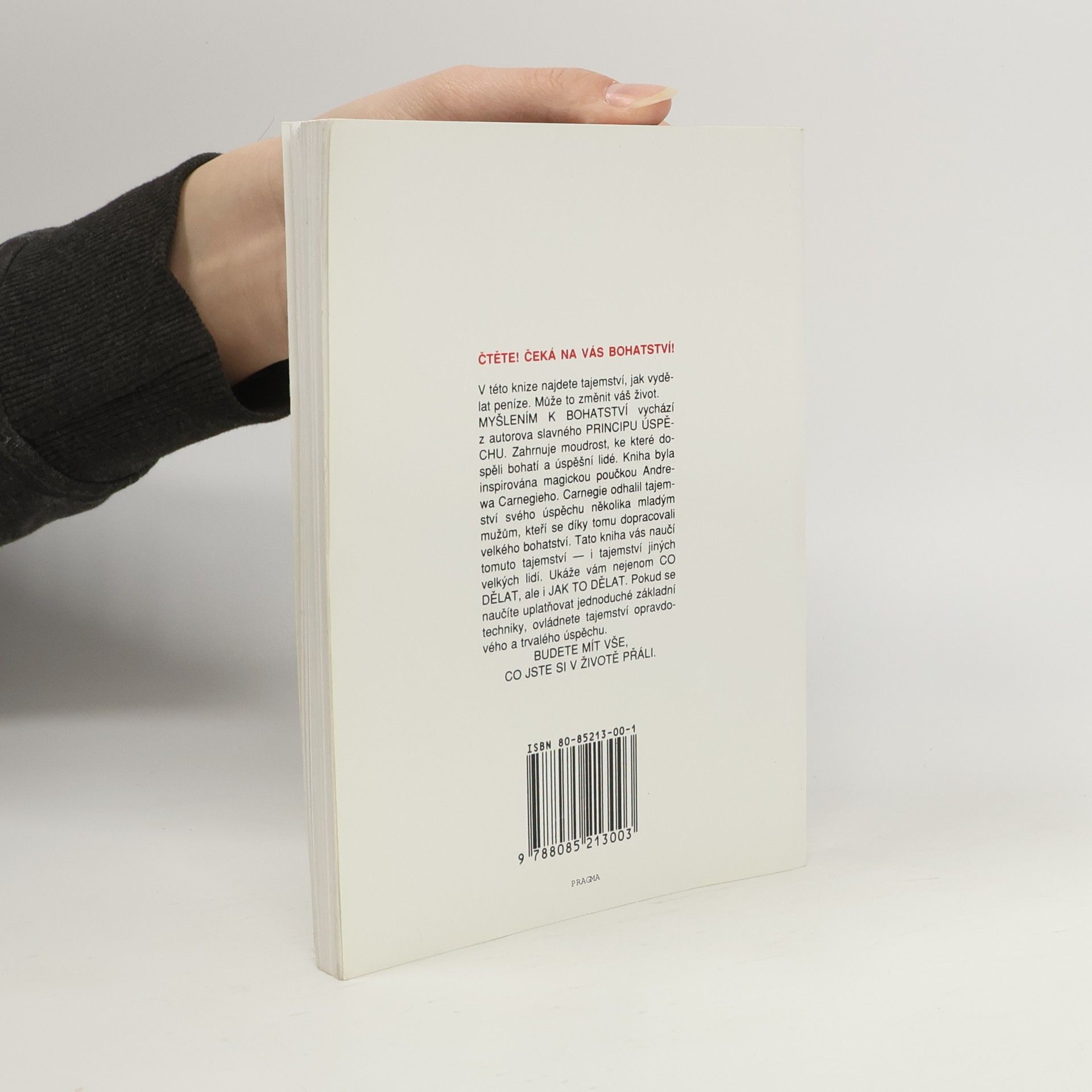První vydání amerického bestselleru. Kniha nás naučí rozvíjet všechny dobré vlastnosti jako je vůle, rozhodnost, vytrvalost a pevný charakter. Je to návod na bohatství nejenom materiální, ale především bohatství vnitřní. Poukazuje na naše skryté kvality, na náš talent a podává návod, jak ho využít. Dozvíte se, jak si vytvořit správný okruh spolupracovníků, jak podnikat, jak začít, jak vytrvalostí dovést své záměry k úspěšnému konci. Všechno materiální má začátek v myšlence, to je základní idea této knihy od Napoleona Hilla. V této knize najdete tajemství, jak vydělat peníze. Může to změnit váš život. MYŠLENÍM K BOHATSTVÍ vychází z autorova slavného PRINCIPU ÚSPĚCHU. Zahrnuje moudrost, ke které dospěli bohatí a úspěšní lidé. Kniha byla inspirována magickou poučkou Andrewa Carnegieho. Carnegie odhalil tajemství svého úspěchu několika mladým mužům, kteří se díky tomu dopracovali velkého bohatství. Tato kniha vás naučí tomuto tajemství — i tajemství jiných velkých lidí. Ukáže vám nejenom CO DĚLAT, ale i JAK TO DĚLAT. Pokud se naučíte uplatňovat jednoduché základní techniky, ovládnete tajemství opravdového a trvalého úspěchu. BUDETE MÍT VŠE, CO JSTE SI V ŽIVOTĚ PŘÁLI.