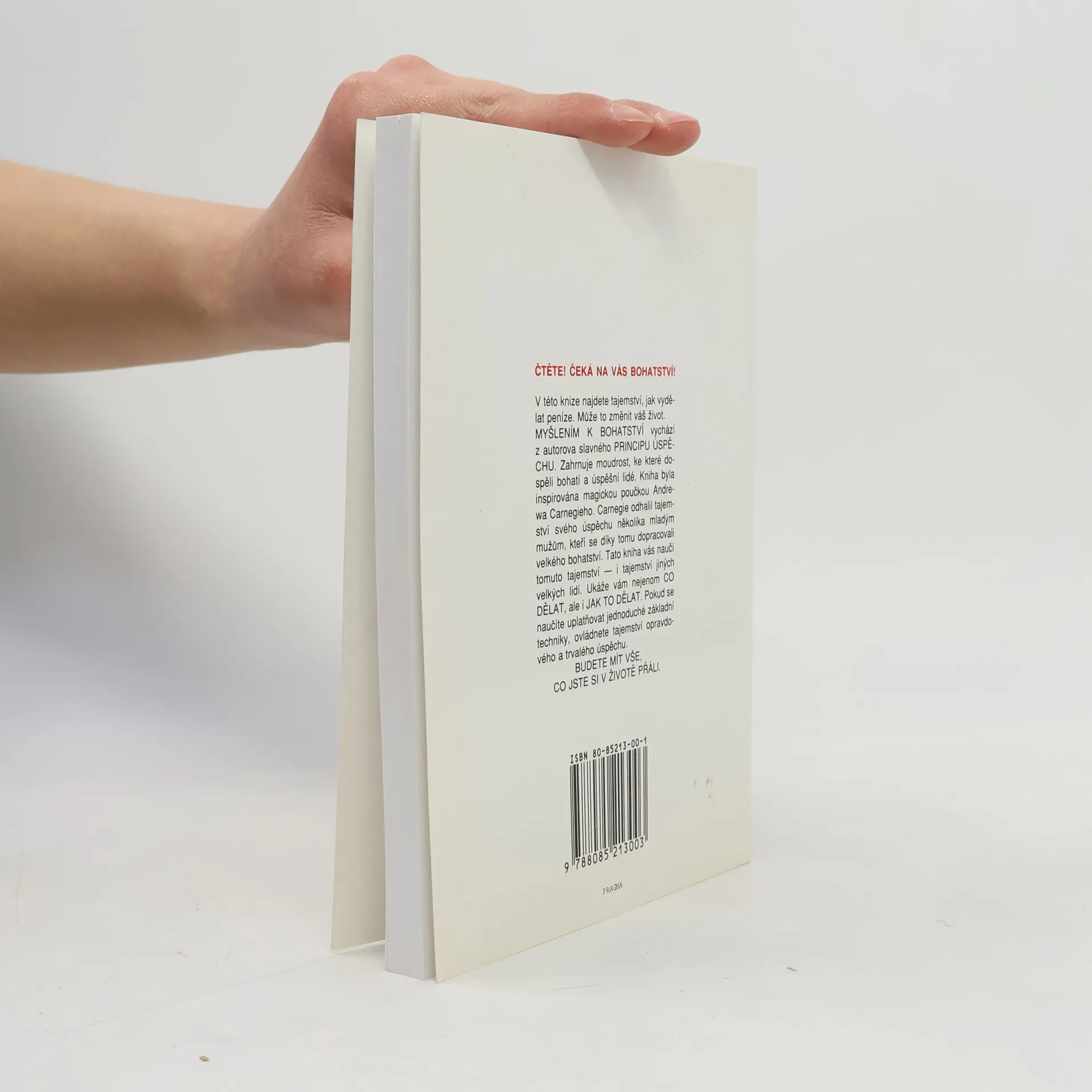 První vydání amerického bestselleru. Kniha nás naučí rozvíjet všechny dobré vlastnosti jako je vůle, rozhodnost, vytrvalost a pevný charakter. Je to návod na bohatství nejenom materiální, ale především bohatství vnitřní. Poukazuje na naše skryté kvality, na náš talent a podává návod, jak ho využít. Dozvíte se, jak si vytvořit správný okruh spolupracovníků, jak podnikat, jak začít, jak vytrvalostí dovést své záměry k úspěšnému konci. Všechno materiální má začátek v myšlence, to je základní idea této knihy od Napoleona Hilla. V této knize najdete tajemství, jak vydělat peníze. Může to změnit váš život. MYŠLENÍM K BOHATSTVÍ vychází z autorova slavného PRINCIPU ÚSPĚCHU. Zahrnuje moudrost, ke které dospěli bohatí a úspěšní lidé. Kniha byla inspirována magickou poučkou Andrewa Carnegieho. Carnegie odhalil tajemství svého úspěchu několika mladým mužům, kteří se díky tomu dopracovali velkého bohatství. Tato kniha vás naučí tomuto tajemství — i tajemství jiných velkých lidí. Ukáže vám nejenom CO DĚLAT, ale i JAK TO DĚLAT. Pokud se naučíte uplatňovat jednoduché základní techniky, ovládnete tajemství opravdového a trvalého úspěchu. BUDETE MÍT VŠE, CO JSTE SI V ŽIVOTĚ PŘÁLI.