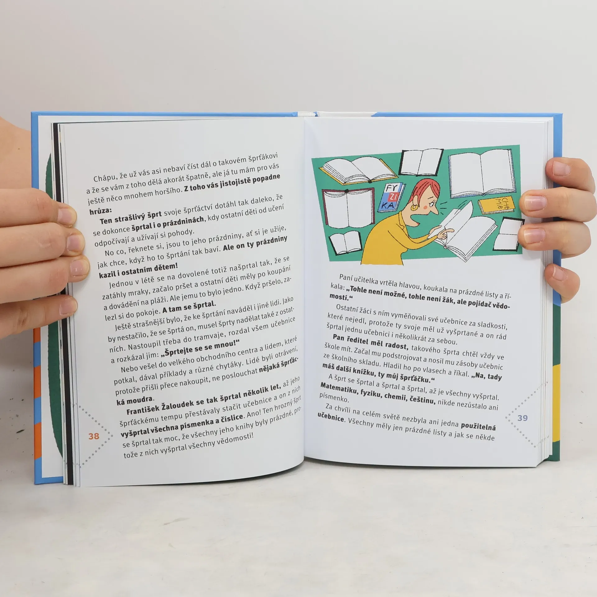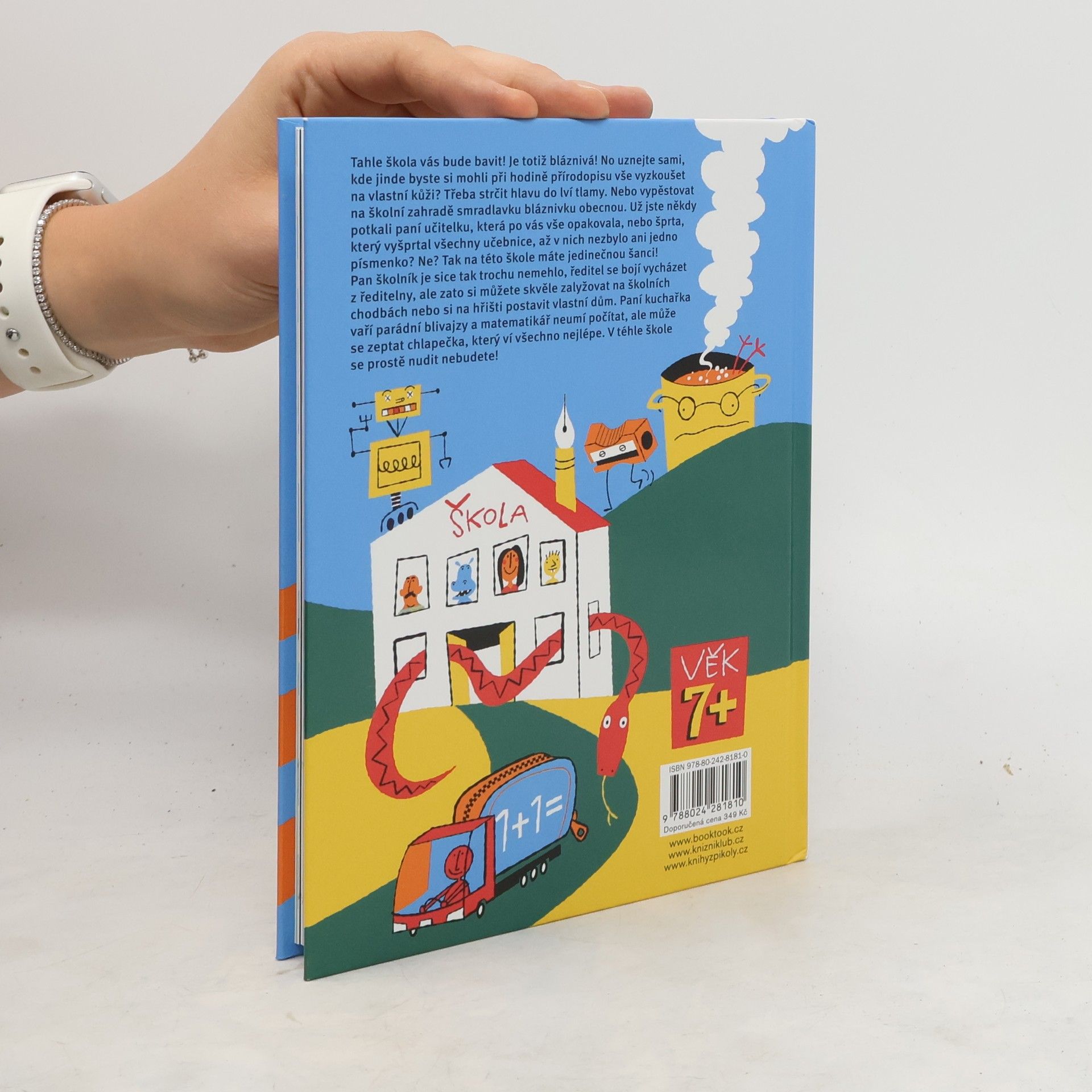 Tahle škola vás bude bavit! Je totiž bláznivá! No uznejte sami, kde jinde byste si mohli při hodině přírodopisu vše vyzkoušet na vlastní kůži? Třeba strčit hlavu do lví tlamy. Nebo vypěstovat na školní zahradě smradlavku bláznivku obecnou. Už jste někdy potkali paní učitelku, která po vás vše opakovala, nebo šprta, který vyšprtal všechny učebnice, až v nich nezbylo ani jedno písmenko? Ne? Tak na této škole máte jedinečnou šanci! Pan školník je sice tak trochu nemehlo, ředitel se bojí vycházet z ředitelny, ale zato si můžete skvěle zalyžovat na školních chodbách nebo si na hřišti postavit vlastní dům. Paní kuchařka vaří parádní blivajzy a matematikář neumí počítat, ale může se zeptat chlapečka, který ví všechno nejlépe. V téhle škole se prostě nudit nebudete! Pro děti od 7 let.