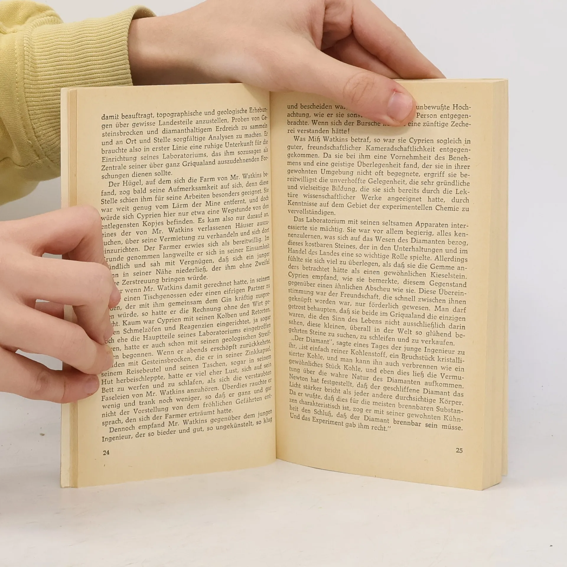 Der französische Minen-Ingenieur Cyprien Méré reist nach Afrika, um in die dortigen Diamantenminen Arbeit zu suchen. In den Minen arbeiten Minenarbeiter aus aller Ländern der Welt unter schweren Bedingungen. Schwarze Minenarbeiter machen den Hauptteil der schweren Arbeit unter der glühenden Sonne des afrikanischen Kontinents. Zu Beginn seiner Tätigkeit arbeitet Cyprien Méré als Landvermesser, wechselt dann jedoch ebenfalls in den Abbau der Diamanten. Nach umfangreicher mühevoller Arbeit findet er einen verkaufbaren Rohdiamanten. Er erhält für diesen Edelstein nur eine geringe Bezahlung. Daraufhin versucht er auf andere Weise an die begehrten Edelsteine zu gelangen. Er glaubt den Stein der Weisen gefunden zu haben. Er plant die künstliche Herstellung von Diamanten. In seiner Heimat hat er sich in der Vergangenheit mit dieser Thematik bereits theoretisch auseinandergesetzt. Nach einem Versuch mit seinem Reverberier-Ofen scheint er Erfolg gehabt zu haben. In der zersplitterten Metallhülle befindet sich unter einer Tonschicht ein riesiger Rohdiamant.