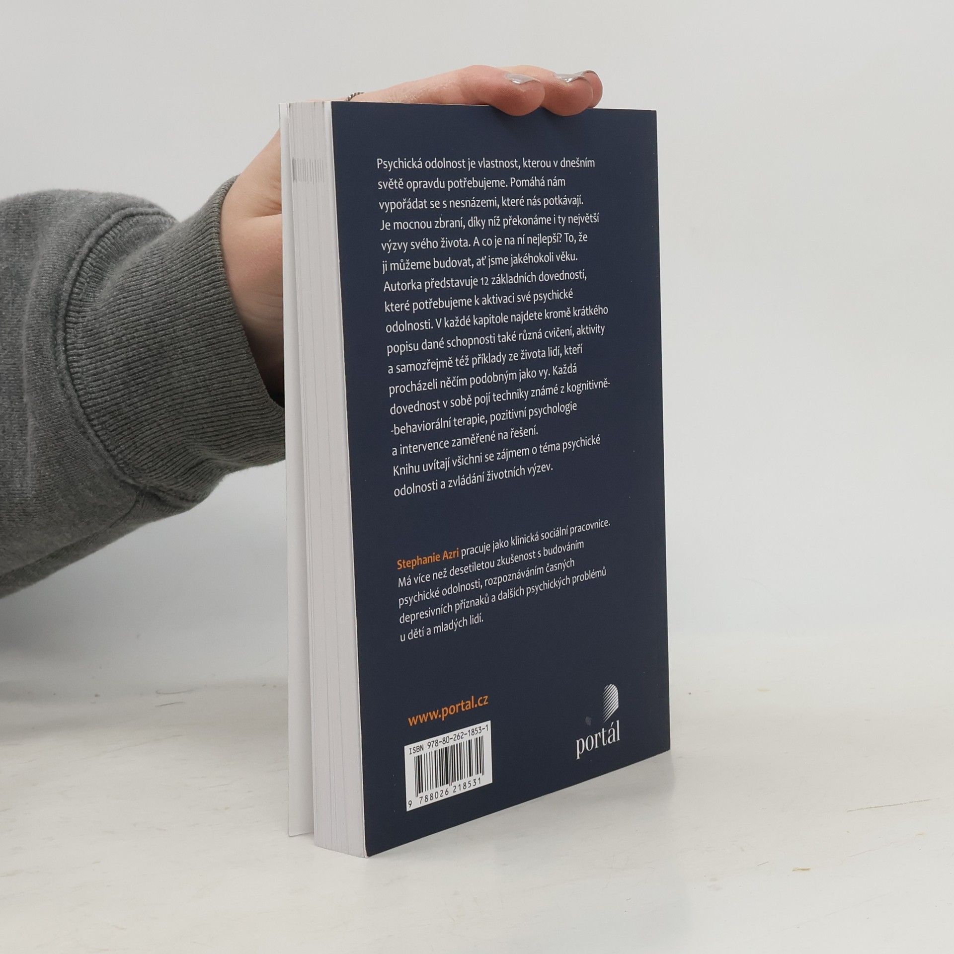 Psychická odolnost je vlastnost, kterou v dnešním světě opravdu potřebujeme. Pomáhá nám vypořádat se s nesnázemi, které nás potkávají. Je mocnou zbraní, díky níž překonáme i ty největší výzvy svého života. A co je na ní nejlepší? To, že ji můžeme budovat, ať jsme jakéhokoli věku. Autorka představuje 12 základních dovedností, které potřebujeme k aktivaci své psychické odolnosti. V každé kapitole najdete kromě krátkého popisu dané schopnosti také různá cvičení, aktivity a samozřejmě též příklady ze života lidí, kteří procházeli něčím podobným jako vy. Každá dovednost v sobě pojí techniky známé z kognitivně-behaviorální terapie, pozitivní psychologie a intervence zaměřené na řešení. Knihu uvítají lidé se zájmem o téma psychické odolnosti a zvládání životních výzev. Stephanie Azri pracuje jako klinická sociální pracovnice. Má více než desetiletou zkušenost s budováním psychické odolnosti a rozpoznáváním časných depresivních příznaků a dalších psychických problémů u dětí a mladých lidí.