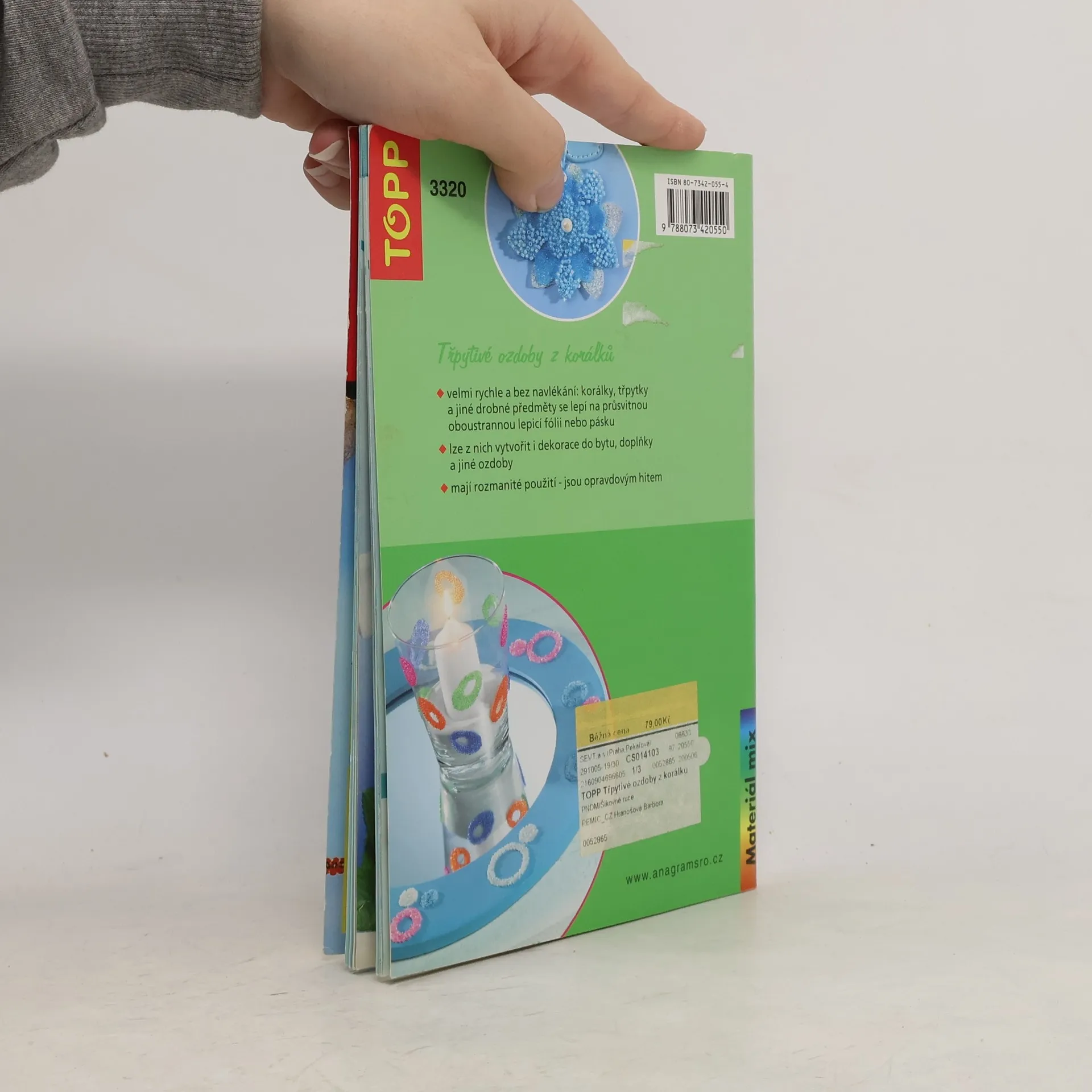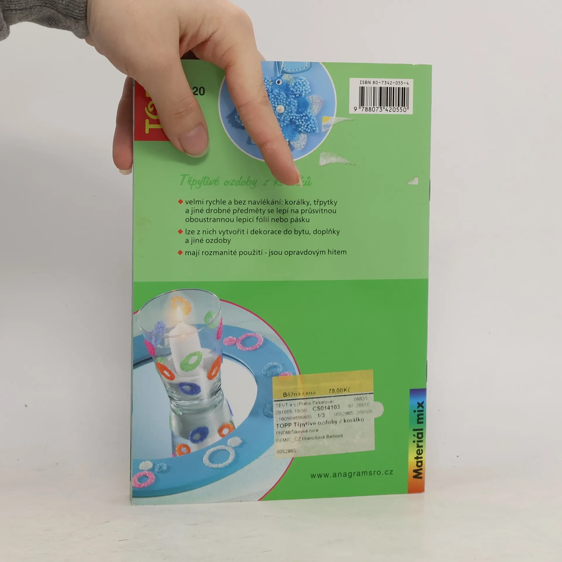 Velmi rychle a bez navlékání: korálky, třpytky a jiné drobné předměty se lepí průsvitnou oboustrannou lepící fólií nebo páskou. Lze z nich vytvořit i dekorace do bytu, doplňky a jiné ozdoby. Mají rozmanité použití - jsou opravdovým hitem.