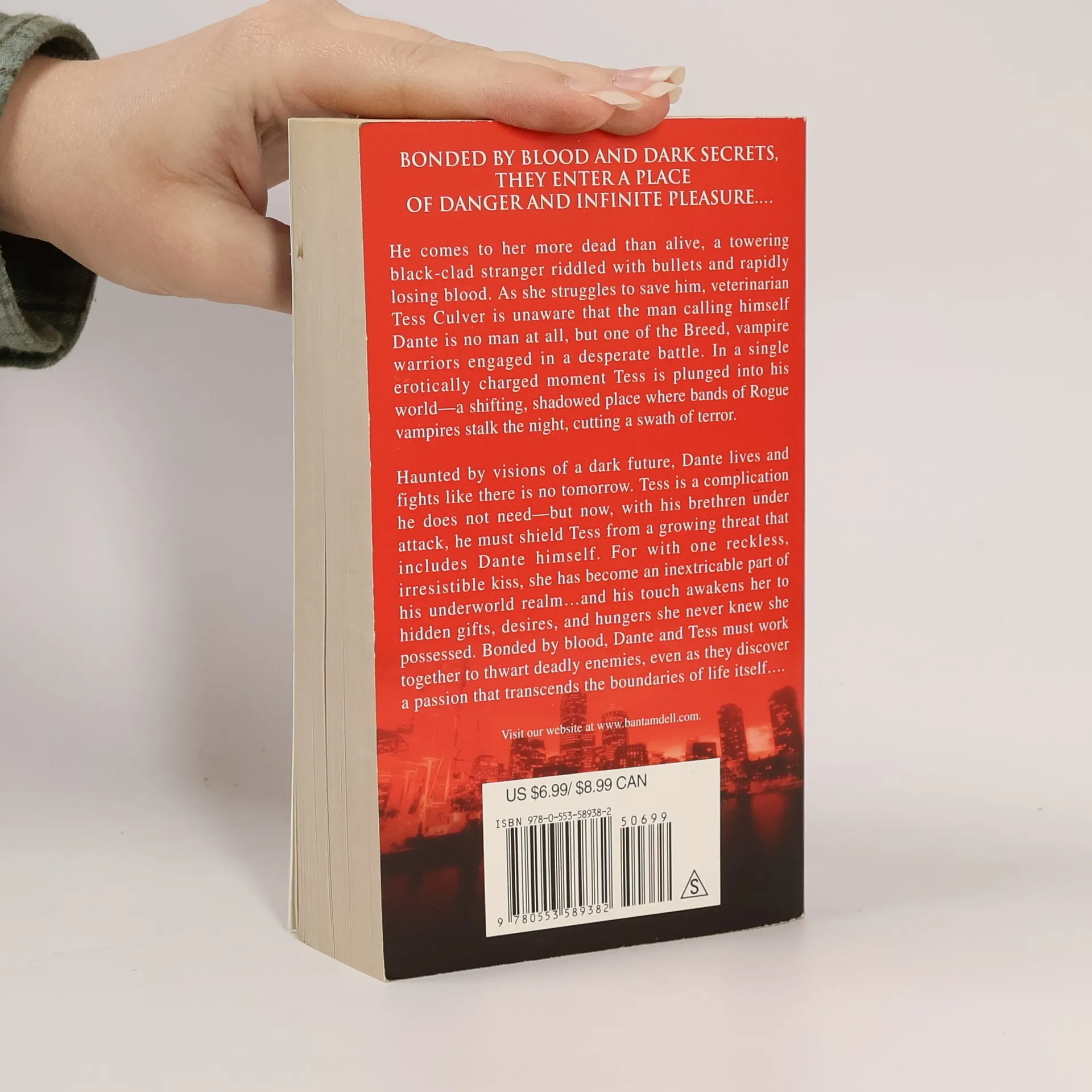 He comes to her more dead than alive, a towering black-clad stranger riddled with bullets and rapidly losing blood. As she struggles to save him, veterinarian Tess Culver is unaware that the man calling himself Dante is no man at all but one of the Breed, vampire warriors engaged in a desperate battle.In a single erotically charged moment, Tess is plunged into his world - a shifting, shadowed place where bands of Rogue vampires stalk the night, cutting a swath of terror. Haunted by visions of a dark future, Dante lives and fights like there is no tomorrow.Tess is a complication he does not need - but now, with his brethren under attack, he must shield Tess from a growing threat that includes Dante himself. For with one reckless, irresistible kiss, she has become an inextricable part of his underworld realm...and his touch awakens her to hidden gifts, desires, and hungers she never knew she possessed. Bonded by blood, Dante and Tess must work together to thwart deadly enemies, even as they discover a passion that transcends the boundaries of life itself.